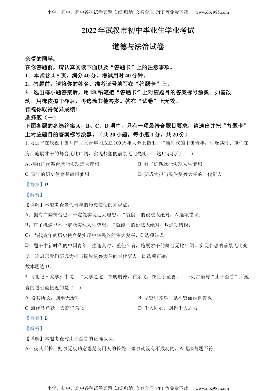 小学、初中、高中各种试卷真题知识归纳文案合同PPT等免费下载www.doc985.com2022年武汉市初中毕业生学业考试道德与法治试卷亲爱的同学:在你答题前,请认真阅读下面以及“答题卡”上的注意事项。1.本试卷共5页,满分40分。考试用时40分钟。2.答题前,请将你的姓名、准考证号填写在“答题卡”上。3.选出每小题答案后,用2B铅笔把“答题卡”上对应题目的答案标号涂黑。如需改动,用橡皮擦干净后,再选涂其他答案。答在“试卷”上无效。预祝你取得优异成绩!选择题(一)下面各题的备选答案A、B、C、D项中,只有一项最符合题目要求,请选出并把“答题卡”上对应题目的答案标号涂黑。(共20小题,每小题1分,共20分)1.习近平在庆祝中国共产主义青年团成立100周年大会上指出:“新时代的中国青年,生逢其时、重任在肩,施展才干的舞台无比广阔,实现梦想的前景无比光明。”这启示我们()A.拥有广阔舞台就能实现远大理想B.有了机遇就能实现人生梦想C.青年的历史使命是编织梦想D.要成为担当民族复兴大任的时代新人【答案】D【解析】【详解】本题考查当代青年的历史使命的知识点。A:拥有广阔舞台也不一定能实现远大理想,“就能”的说法太绝对,A选项错误;B:有了机遇也不一定能实现人生梦想,“就能”的说法太绝对,B选项错误;C:当代青年的历史使命是实现中华民族的伟大复兴,C选项错误;D:题干中新时代的中国青年,生逢其时、重任在肩,施展才干的舞台无比广阔,实现梦想的前景无比光明,这启示我们要成为担当民族复兴大任的时代新人,D选项正确;故本题选D。2.《礼记·大学》中说;“大学之道,在明明德,在亲民,在止于至善。”下列古语与“止于至善”所蕴含的道理最接近的是()A.役其所长,则事无废功B.见贤思齐焉,见不贤而内自省也C.海阔凭鱼跃,天高任鸟飞D.千人同心,则得千人之力【答案】B【解析】【详解】本题考查对止于至善的正确认识。A:役其所长,则事无废功意思是使用人的长处,做事就没有不成功的,A说法与题不符;小学、初中、高中各种试卷真题知识归纳文案合同PPT等免费下载www.doc985.com小学、初中、高中各种试卷真题知识归纳文案合同PPT等免费下载www.doc985.comB:见贤思齐焉,见不贤而内自省也意思是在生活中寻找贤,将他们作为榜样,B说法正确;C:海阔凭鱼跃,天高任鸟飞意思是海是无限宽阔的,可以听凭鱼去腾跃;天是无限高远的,可以听凭鸟去翱翔。比喻社会给人们提供了自由的空间,可以充分发挥个人的才能,C说法与题不符;D:千人同心,则得千人之力意思是说如果一千个人同心同德,就可以发挥超过一千人的力量,强调的是团结的作用,D说法与题不符;故本题选B。3.下面是某校八(l)班班务日志的摘录:3月19日,12名同学参加了公园管理部门开展的“约‘绘’春天”绘画活动。4月22日,全班同学到水稻种植基地上劳动课,部分同学还操作了智能农机。5月12日,全班同学参加了学校组织的应急逃生演练活动。同学们在日志评论区纷纷留言,其中,正确的观点是()①小哲:我们可以从一切经历中学习②小怡:在实践中体验是学习的重要途径③小天:社会实践不是真正的学习活动④小晖:参加社会实践可以代替课本知识的学习A.①②B.①③C.②④D.③④【答案】A【解析】【详解】本题考查在实践中学习。①②:题干表述了某校八年一班的同学参加了许多的社会实践活动。可见我们不仅要重视书本知识的学习,还要重视社会实践,因为实践出真知。所以我们可以从一切经历中学习,而且在实践中体验是学习的重要途径。①②说法正确,符合题意;③:错误,学习不仅仅局限在学校,我们所看、所听、所尝、所做、都可以是学习。所以社会实践也是学习。排除;④:错误,课本知识的学习和参加社会实践都属于学习,但二者不可互相替代,排除;故本题选A。4.下列对几名初中学生行为表现的点评,正确而中肯的是()行为表现点评小航:紧张时,我会做几个深呼吸,让心情平静下来。①改变认知评价可以调节情绪小帆:我和小俊在球场上是对手,在球场外是好朋友。②竞争并不必然伤害友谊小欣:我认识了几个新朋友,特别聊得来。③谈得来的朋友就是益友小学、初中、高中各种试卷真题知识归...