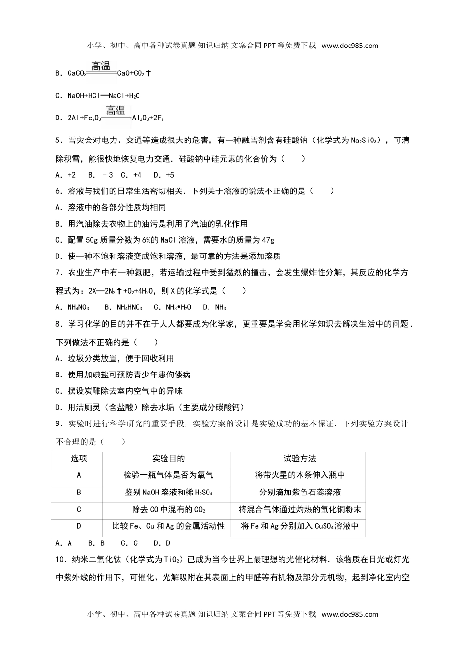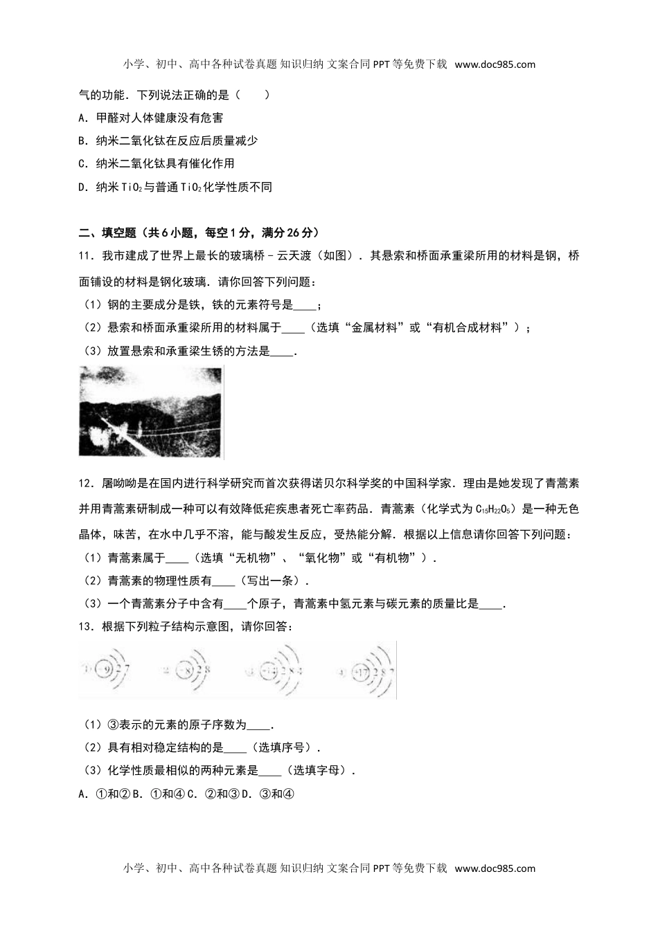 小学、初中、高中各种试卷真题知识归纳文案合同PPT等免费下载www.doc985.com2016年湖南省张家界市中考化学试卷一、我会选择(共10小题,每小题2分,满分20分.在下列各题的四个选项中,只有一个选项符合题目要求)1.生活中的下列变化,属于化学变化的是()A.瓷碗破碎B.木炭燃烧C.衣服晾干D.铁拉成丝2.空气中能维持生命呼吸的气体是()A.氧气B.氮气C.氢气D.稀有气体3.在进行化学实验操作考核时,下列四位同学的操作中不正确的是()A.液体的倾倒B.液体的量取C.熄灭酒精灯D.稀释浓硫酸4.下列反应中属于置换反应的是()A.C+O2CO2小学、初中、高中各种试卷真题知识归纳文案合同PPT等免费下载www.doc985.com小学、初中、高中各种试卷真题知识归纳文案合同PPT等免费下载www.doc985.comB.CaCO3CaO+CO2↑C.NaOH+HCl═NaCl+H2OD.2Al+Fe2O3Al2O3+2Fe5.雪灾会对电力、交通等造成很大的危害,有一种融雪剂含有硅酸钠(化学式为Na2SiO3),可清除积雪,能很快地恢复电力交通.硅酸钠中硅元素的化合价为()A.+2B.﹣3C.+4D.+56.溶液与我们的日常生活密切相关.下列关于溶液的说法不正确的是()A.溶液中的各部分性质均相同B.用汽油除去衣物上的油污是利用了汽油的乳化作用C.配置50g质量分数为6%的NaCl溶液,需要水的质量为47gD.使一种不饱和溶液变成饱和溶液,最可靠的方法是添加溶质7.农业生产中有一种氮肥,若运输过程中受到猛烈的撞击,会发生爆炸性分解,其反应的化学方程式为:2X═2N2↑+O2+4H2O,则X的化学式是()A.NH4NO3B.NH4HNO3C.NH3•H2OD.NH38.学习化学的目的并不在于人人都要成为化学家,更重要是学会用化学知识去解决生活中的问题.下列做法不正确的是()A.垃圾分类放置,便于回收利用B.使用加碘盐可预防青少年患佝偻病C.摆设炭雕除去室内空气中的异味D.用洁厕灵(含盐酸)除去水垢(主要成分碳酸钙)9.实验时进行科学研究的重要手段,实验方案的设计是实验成功的基本保证.下列实验方案设计不合理的是()选项实验目的试验方法A检验一瓶气体是否为氧气将带火星的木条伸入瓶中B鉴别NaOH溶液和稀H2SO4分别滴加紫色石蕊溶液C除去CO中混有的CO2将混合气体通过灼热的氧化铜粉末D比较Fe、Cu和Ag的金属活动性将Fe和Ag分别加入CuSO4溶液中A.AB.BC.CD.D10.纳米二氧化钛(化学式为TiO2)已成为当今世界上最理想的光催化材料.该物质在日光或灯光中紫外线的作用下,可催化、光解吸附在其表面上的甲醛等有机物及部分无机物,起到净化室内空小学、初中、高中各种试卷真题知识归纳文案合同PPT等免费下载www.doc985.com小学、初中、高中各种试卷真题知识归纳文案合同PPT等免费下载www.doc985.com气的功能.下列说法正确的是()A.甲醛对人体健康没有危害B.纳米二氧化钛在反应后质量减少C.纳米二氧化钛具有催化作用D.纳米TiO2与普通TiO2化学性质不同二、填空题(共6小题,每空1分,满分26分)11.我市建成了世界上最长的玻璃桥﹣云天渡(如图).其悬索和桥面承重梁所用的材料是钢,桥面铺设的材料是钢化玻璃.请你回答下列问题:(1)钢的主要成分是铁,铁的元素符号是;(2)悬索和桥面承重梁所用的材料属于(选填“金属材料”或“有机合成材料”);(3)放置悬索和承重梁生锈的方法是.12.屠呦呦是在国内进行科学研究而首次获得诺贝尔科学奖的中国科学家.理由是她发现了青蒿素并用青蒿素研制成一种可以有效降低疟疾患者死亡率药品.青蒿素(化学式为C15H22O5)是一种无色晶体,味苦,在水中几乎不溶,能与酸发生反应,受热能分解.根据以上信息请你回答下列问题:(1)青蒿素属于(选填“无机物”、“氧化物”或“有机物”).(2)青蒿素的物理性质有(写出一条).(3)一个青蒿素分子中含有个原子,青蒿素中氢元素与碳元素的质量比是.13.根据下列粒子结构示意图,请你回答:(1)③表示的元素的原子序数为.(2)具有相对稳定结构的是(选填序号).(3)化学性质最相似的两种元素是(选填字母).A.①和②B.①和④C.②和③D.③和④小学、初中、高中各种试卷真题知识归纳文案合同PPT等免费下载www.doc985.com小学、初中、高...