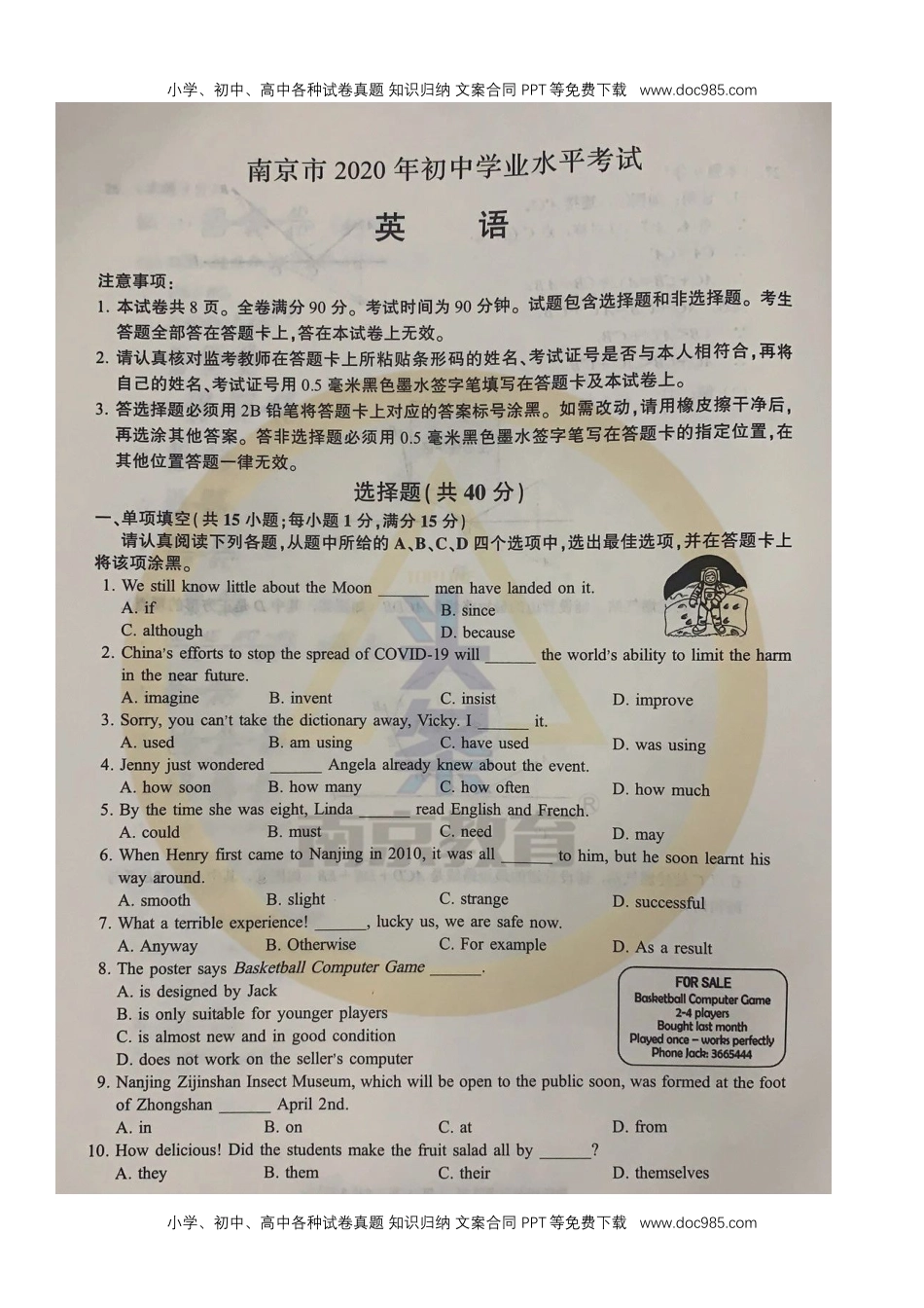 2020年江苏南京英语试卷+答案(图片word版)历年中考真题 电子版免费下载.docx本文件免费下载 【共9页】