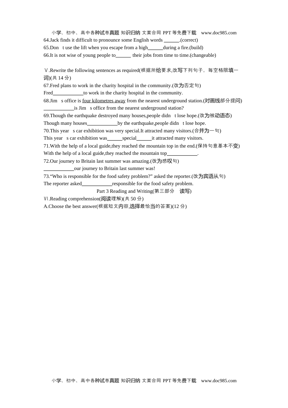 小、初中、高中各卷知文案合同学种试真题识归纳PPT等免下费载www.doc985.com2013年上海市初中一考毕业统学业试英语(含答案全解全析)(分满:150分时间:100分钟)Part1Listening(第一部分听力)Ⅰ.Listeningcomprehension(听力理解)(共30分)(略)Part2VocabularyandGrammar(第二部分和法词汇语)Ⅱ.Choosethebestanswer(最恰的答案选择当)(共20分)31.Perhapsthefamousfootballstarwontplayfootballanylonger.A.aB.anC.theD./32.Myparentsshowedsomeoldpicturesthatbroughtbacksweetmemories.A.IB.meC.myD.mine33.Wow!TenstudentsinourclasswillcelebratetheirfourteenthbirthdaysOctober!A.inB.onC.atD.to34.Thechemicalsinthevegetablesandfruitarebadourhealth.A.fromB.withC.ofD.for35.AlotofforeignersfamiliarwiththefamousplacesofinterestinChina.A.amB.isC.areD.be36.Thestudentdidntfindmuchaboutthetopiconthatwebsite.A.reportB.articleC.informationD.story37.iswaitingforyouatthegate.Hewantstosaythankstoyou.A.SomebodyB.AnybodyC.EverybodyD.Nobody38.—haveyoubeeninthesportsclub?—SincethefirstmonthIcametotheschool.A.HowoldB.HowlongC.HowmuchD.Howsoon39.MyoldneighbourCharlesfeltafterhischildrenmovedout.A.lonelyB.safelyC.angrilyD.happily40.—MustIgotomedicalschoolandbeadoctorlikeyou,Dad?—No,you,son.Yourefreetomakeyourowndecision.A.cantB.mustntC.shouldntD.neednt41.Thevolunteerspokeasasshecouldtomakethevisitorsunderstandher.A.clearlyB.moreclearlyC.mostclearlyD.themostclearly42.Whichdoyouprefertousetokeepintouchwithyourfriends,QQMSN?A.andB.butC.orD.so43.Ihatetravellingbyairyouusuallyhavetowaitforhoursbeforetheplanetakesoff.A.becauseB.thoughC.untilD.unless44.Look,somanypassengerswiththeirsmartphonesontheunderground.A.playedB.willplayC.areplayingD.haveplayed45.Theschoolboytotheblindmanonhiswayhomeyesterdayafternoon.A.apologizesB.apologizedC.willapologizeD.hasapologized小、初中、高中各卷知文案合同学种试真题识归纳PPT等免下费载www.doc985.com小、初中、高中各卷知文案合同学种试真题识归纳PPT等免下费载www.doc985.com46.Theofficialsaidtheyanewlawtoprotectthetouriststhenextyear.A.makesB.wouldmakeC.madeD.havemade47.EvenTonysgranddaughter,afive-year-oldgirl,askedhimsmoking.A.giveupB.gaveupC.togiveupD.givingup48.Theretiredcoupleenjoyphotos.Theyalwaysgooutwiththeircameras.A.takeB.tookC.totakeD.taking49.—TimandIwillvisittheexhibitionthisweekend.Wouldyouliketojoinus?—A.Welldone.B.Thatsright.C.Yourewelcome.D.Idloveto.50.—Wellstudyindifferentschoolsnextterm.Enjoyyourtimeinthenewschool!—A.Illtakeyouradvice.B.Thesametoyou.C.Congratulations!D.Metoo.Ⅲ.Completethefollowingpassagewiththewordsorphrasesinthebox.Eachcanonlybeusedonce(下列或入空格。每空格限一将单词词组填填词,每只能一次词填)(共8分)A.resultsB.outdoorC.recentlyD.takepartinE.wildF.choicesG.goabroadH.gentlyI.offerDoyouknowwhatisspecialaboutNovemberandJuneintheUK?Theyare,possibly,theonlytwomonthswithnoschoolholidays.Anewspaper51didasurveyamongagroupofstudents.Inthesurvey,68percentofthestudentssaidthattheirparentswereatworkintheschoolholidays.73percentsaidthattheywereboredduringtheschoolholidaysand35percentsaidtheywerehappytogobacktoschool!The52ofthesurveyshowthatnoteverybodywantstohavemanyholidays.Ifyoudontwanttostayathomeandgetbored,gooutand53someinterestingactivities.Alotofschoolsorganizevarioustripsduringtheholidays,especiallywhentheyhaveaone-weekholiday.Youhavemany54tomake.Manyschoolstakegroupsofstudentstosometrainingcentres.There,studentscanlearnalotfrom55activities.Forexampl...