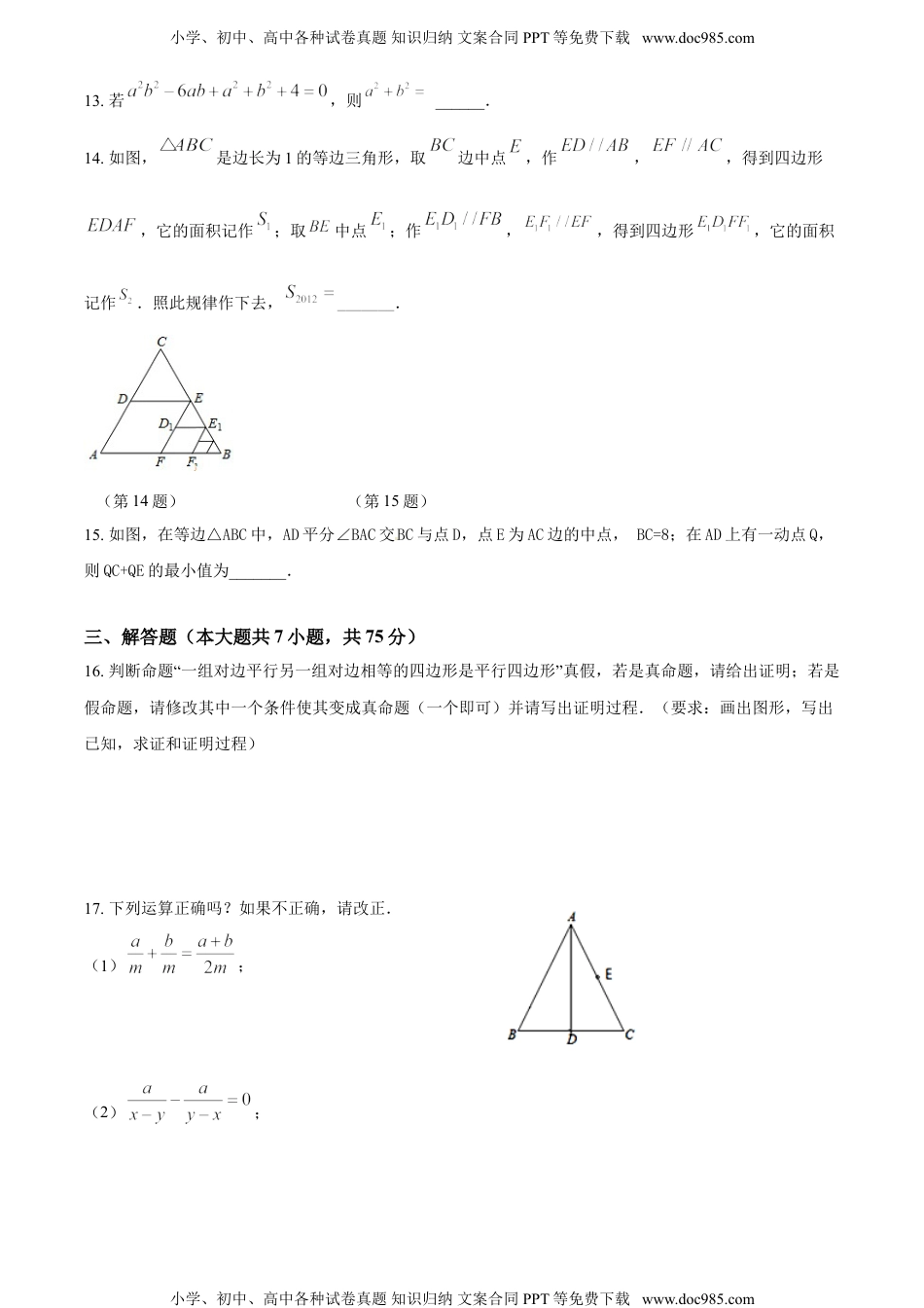 小学、初中、高中各种试卷真题知识归纳文案合同PPT等免费下载www.doc985.com2020-2021学年河南省名校联盟八年级(下)期末数学试卷一、选择题(本大题共10小题,共30分)1.下列图形中是中心对称图形的是()A.B.C.D.2.如图,在中,为上一点,连接、,且、交于点,,则等于()A.B.C.D.3.如果a<b,那么下列各式中,一定成立的是()A.>B.ac<bcC.a-1<b-1D.a2>b24.下列各式从左到右的变形中,是因式分解的为().A.B.C.D.5.如图,Rt△ABC中,∠C=90°,AC=4,BC=3,DE是AC边的中垂线,分别交AC,AB于点E,D,则△DBC的周长为()A.6B.7C.8D.9小学、初中、高中各种试卷真题知识归纳文案合同PPT等免费下载www.doc985.com小学、初中、高中各种试卷真题知识归纳文案合同PPT等免费下载www.doc985.com6.如果关于x的方程的解为非负数,且关于x,y的二元一次方程组解满足,则满足条件的整数a有()个.A.7B.6C.5D.47.在正三角形,正方形,正五边形,正六边形这几个图形中,单独选用一种图形不能进行平面镶嵌的图形是()A.正三角形B.正方形C.正五边形D.正六边形8.“a是正数”用不等式表示为()A.a≤0B.a≥0C.a<0D.a>09.下列计算正确的是().A.B.C.D.10.能判定四边形是平行四边形的是()A.对角线互相垂直B.对角线相等C.对角线互相垂直且相等D.对角线互相平分二、填空题(本大题共5小题,共15分)11.当x=___时,分式的值为零.12.如下表,从左到右在每个小格子中都填入一个整数,使得其中任意四个相邻格子中所填的整数之和都相等,则第2013个格子中的数为_____________.…小学、初中、高中各种试卷真题知识归纳文案合同PPT等免费下载www.doc985.com小学、初中、高中各种试卷真题知识归纳文案合同PPT等免费下载www.doc985.com13.若,则______.14.如图,是边长为1的等边三角形,取边中点,作,,得到四边形,它的面积记作;取中点;作,,得到四边形,它的面积记作.照此规律作下去,_______.(第14题)(第15题)15.如图,在等边△ABC中,AD平分∠BAC交BC与点D,点E为AC边的中点,BC=8;在AD上有一动点Q,则QC+QE的最小值为_______.三、解答题(本大题共7小题,共75分)16.判断命题“一组对边平行另一组对边相等的四边形是平行四边形”真假,若是真命题,请给出证明;若是假命题,请修改其中一个条件使其变成真命题(一个即可)并请写出证明过程.(要求:画出图形,写出已知,求证和证明过程)17.下列运算正确吗?如果不正确,请改正.(1);(2);小学、初中、高中各种试卷真题知识归纳文案合同PPT等免费下载www.doc985.com小学、初中、高中各种试卷真题知识归纳文案合同PPT等免费下载www.doc985.com(3);(4).18.如图,正方形网格中,每个小正方形的边长均为1,每个小正方形的顶点叫格点.(1)在图①中,以格点为端点,画线段MN=;(2)在图②中,以格点为顶点,画正方形ABCD,使它的面积为13.19.已知:如图,ABC为等边三角形,BD为中线,延长BC至E,使CECD,连接DE.(1)证明:BDE是等腰三角形;(2)若AB=2,求DE的长度.20.东东在完成一项“社会调查”作业时,调查了城市送餐员的收入情况,他了解到劳务公司为了鼓励送餐员的工作积极性,实行“月总收入基本工资(固定)+计单奖金”的方法计算薪资,并获得如下信息:小学、初中、高中各种试卷真题知识归纳文案合同PPT等免费下载www.doc985.com小学、初中、高中各种试卷真题知识归纳文案合同PPT等免费下载www.doc985.com营业员小李小杨月送餐单数/单285260月总收入/元33703320送餐每单奖金为a元,送餐员月基本工资为b元.(1)求a、b的值;(2)若月送餐单数超过300单时,超过部分每单奖金增加1元,假设月送餐单数为x单,月总收入为y元,请写出y与x之间的函数关系式,并求出送餐员小李计划月总收入不低于4000元时,小李每月至少要送餐多少单?21.如图,在边长为4的正方形ABCD中,动点E以每秒1个单位长度的速度从点A开始沿边AB向点B运动,动点F以每秒2个单位长度的速度从点B开始沿折线BC﹣CD向点D运动,动点E比动点F先出发1秒,其中一个动点到达终点时,另一个动点也随之停止运动,设点F的运动时间为t秒.(1...