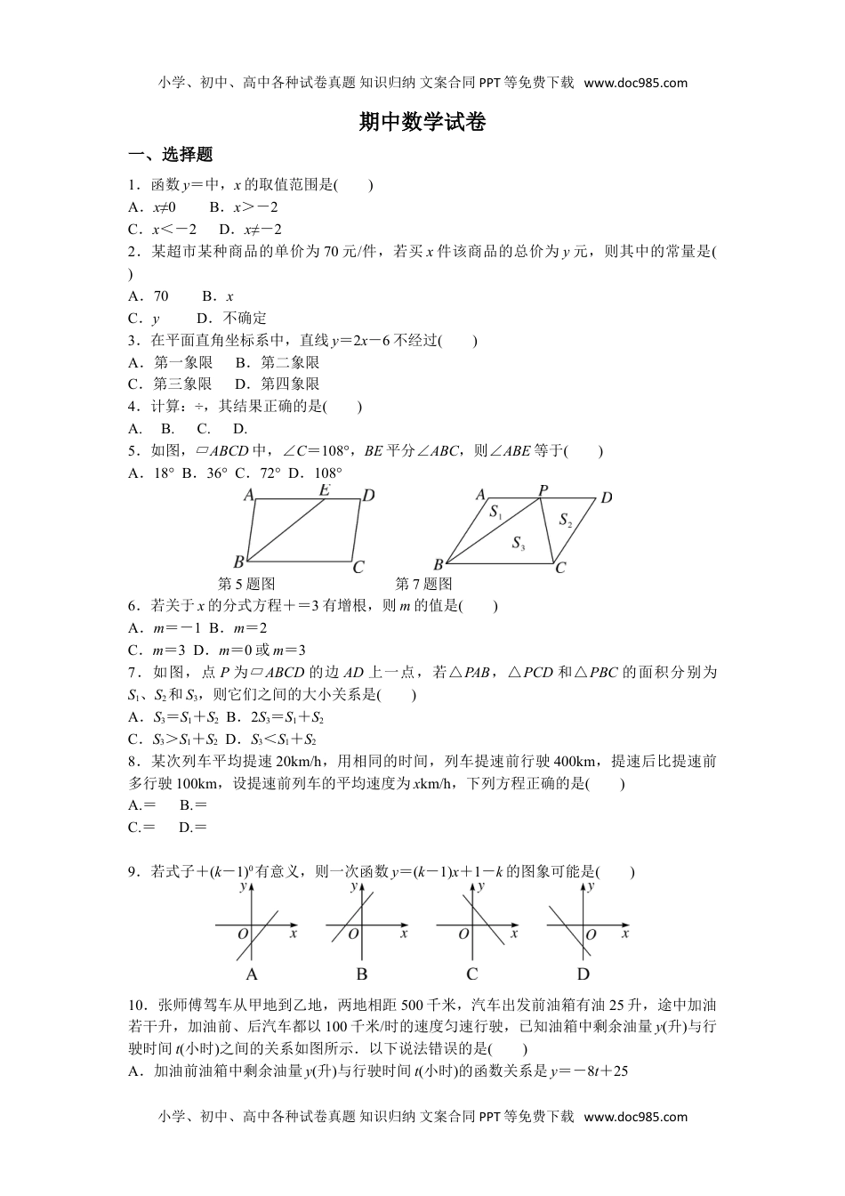 小学、初中、高中各种试卷真题知识归纳文案合同PPT等免费下载www.doc985.com期中数学试卷一、选择题1.函数y=中,x的取值范围是()A.x≠0B.x>-2C.x<-2D.x≠-22.某超市某种商品的单价为70元/件,若买x件该商品的总价为y元,则其中的常量是()A.70B.xC.yD.不确定3.在平面直角坐标系中,直线y=2x-6不经过()A.第一象限B.第二象限C.第三象限D.第四象限4.计算:÷,其结果正确的是()A.B.C.D.5.如图,▱ABCD中,∠C=108°,BE平分∠ABC,则∠ABE等于()A.18°B.36°C.72°D.108°第5题图第7题图6.若关于x的分式方程+=3有增根,则m的值是()A.m=-1B.m=2C.m=3D.m=0或m=37.如图,点P为▱ABCD的边AD上一点,若△PAB,△PCD和△PBC的面积分别为S1、S2和S3,则它们之间的大小关系是()A.S3=S1+S2B.2S3=S1+S2C.S3>S1+S2D.S3<S1+S28.某次列车平均提速20km/h,用相同的时间,列车提速前行驶400km,提速后比提速前多行驶100km,设提速前列车的平均速度为xkm/h,下列方程正确的是()A.=B.=C.=D.=9.若式子+(k-1)0有意义,则一次函数y=(k-1)x+1-k的图象可能是()10.张师傅驾车从甲地到乙地,两地相距500千米,汽车出发前油箱有油25升,途中加油若干升,加油前、后汽车都以100千米/时的速度匀速行驶,已知油箱中剩余油量y(升)与行驶时间t(小时)之间的关系如图所示.以下说法错误的是()A.加油前油箱中剩余油量y(升)与行驶时间t(小时)的函数关系是y=-8t+25小学、初中、高中各种试卷真题知识归纳文案合同PPT等免费下载www.doc985.com小学、初中、高中各种试卷真题知识归纳文案合同PPT等免费下载www.doc985.comB.途中加油21升C.汽车加油后还可行驶4小时D.汽车到达乙地时油箱中还余油6升二、填空题11.0.0000156用科学记数法表示为____________.12.当x=________时,分式的值为0.13.在反比例函数y=图象的每一支上,y随x的增大而________(填“增大”或“减小”).14.如图,在▱ABCD中,BE⊥AB交对角线AC于点E,若∠1=20°,则∠2的度数为________.第14题图第16题图第17题图15.将直线y=2x+1向下平移3个单位长度后所得直线的解析式是____________.16.如图,在四边形ABCD中,AD∥BC,∠B=70°,∠C=40°,DE∥AB交BC于点E.若AD=5cm,BC=12cm,则CD的长是________cm.17.如图,在Rt△AOB中,点A是直线y=x+m与双曲线y=在第一象限的交点,且S△AOB=2,则m的值是________.18.▱ABCD的周长为40cm,对角线AC,BD相交于点O,△AOB的周长比△BOC的周长多4cm,则AB=________cm,BC=________cm.三、解答题19.计算或解方程:(1)20160-|-2|+-;(2)=.小学、初中、高中各种试卷真题知识归纳文案合同PPT等免费下载www.doc985.com小学、初中、高中各种试卷真题知识归纳文案合同PPT等免费下载www.doc985.com20.化简:-÷,然后在不等式x≤2的非负整数解中选择一个适当的数代入求值.21.如图,在▱ABCD中,点O是对角线AC和BD的交点,OE⊥AD于E,OF⊥BC于F.求证:OE=OF.22.某种型号油电混合动力汽车,从A地到B地燃油行驶纯燃油费用为76元,从A地到B地用电行驶纯电费用为26元,已知每行驶1千米,纯燃油费用比纯用电费用多0.5元.(1)求每行驶1千米纯用电的费用;(2)若要使从A地到B地油电混合行驶所需的油、电费用合计不超过39元,则至少用电行驶多少千米?23.如图,反比例函数y=的图象与一次函数y=k′x+b的图象交于点A(1,4)、点B(-4,n).(1)求一次函数和反比例函数的解析式;(2)求△OAB的面积;(3)直接写出一次函数值大于反比例函数值的自变量x的取值范围.小学、初中、高中各种试卷真题知识归纳文案合同PPT等免费下载www.doc985.com小学、初中、高中各种试卷真题知识归纳文案合同PPT等免费下载www.doc985.com24.甲、乙两车从A地驶向B地,并以各自的速度匀速行驶,甲车比乙车早行驶2h,并且甲车途中休息了0.5h,如图是甲、乙两车行驶的距离y(km)与时间x(h)的函数图象.(1)求出图中m,a的值;(2)求出甲车行驶路程y(km)与时间x(h)的函数解析式,并写出相应的x的取值范围;(3)当乙车行驶多长时间时,两车恰好相距50km?小...