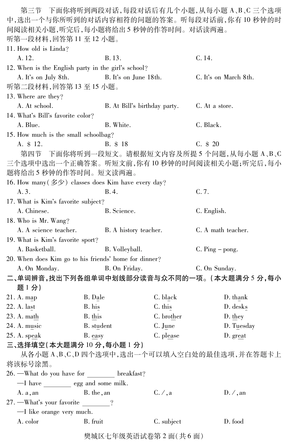 樊城区七年级英语试卷第��面�共�面�樊城区���������学年度上学期期末学业水平测试七年级英语试题�时间����分钟�满分����分���注意事项���答卷前�考生务必将自己的姓名�考试号填写在试题卷和答题卡上���选择题每小题选出答案后�用��铅笔将答题卡上对应题目的答案标号涂黑�如需改动�用橡皮擦干净后�再选涂其它答案标号�答在试题卷上无效���非选择题�主观题�用���毫米的黑色墨水签字笔直接答在答题卡上每题对应的答题区域内�答在试题卷上无效�作图一律用��铅笔或���毫米黑色签字笔���考试结束后�请将本试题卷和答题卡一并上交�口语部分���分��口语测试另行考试�不计入本次考试时间�选择题�共��分�一�听力测试�本大题满分��分�每小题�分�第一节�下面你将听到�个句子�每个句子后有�个应答语�请从每小题所给的�����三个应答语中选出一个你所听到的最佳选项�听完每个句子后你都有��秒钟的时间来作答和阅读下一小题�每个句子读两遍�������������������������������������������������������������������������������������������������������������������������������������������������������������������������������������������������������������������第二节�下面你将听到�段短对话�每段对话后有�个小题�从每小题�����三个选项中选出一个最佳答案�听完每段对话后�你有��秒钟的时间来回答有关小题和阅读下一小题�每段对话读两遍����������������������������������������������������������������������������������������������������������������������������������������������������������������������������������������������������������������������������������������������������������������������������������������������������������������������������������������������樊城区七年级英语试卷第��面�共�面�第三节�下面你将听到两段对话�每段对话后有几个小题�从每小题�����三个选项中�选出一个与你所听到的对话内容相符的问题的答案�听每段对话前�你有��秒钟的时间阅读相关小题�听完后�每小题将给出�秒钟的作答时间�对话读两遍�听第一段材料�回答第��至��小题�����������������������������������������������������������������������������������������������������������������������������听第二段材料�回答第��至��小题�����������������������������������������������������������������������������������������������������������������������������������������������������������������第四节�下面你将听到一段短文�请根据短文内容及所提�个问题�从每小题�����三个选项中选出一个正确答案�听短文前�你有��秒钟的时间阅读相关小题�听完后�每小题将给出�秒钟的作答时间�短文读两遍������������多少���������������������������������������...