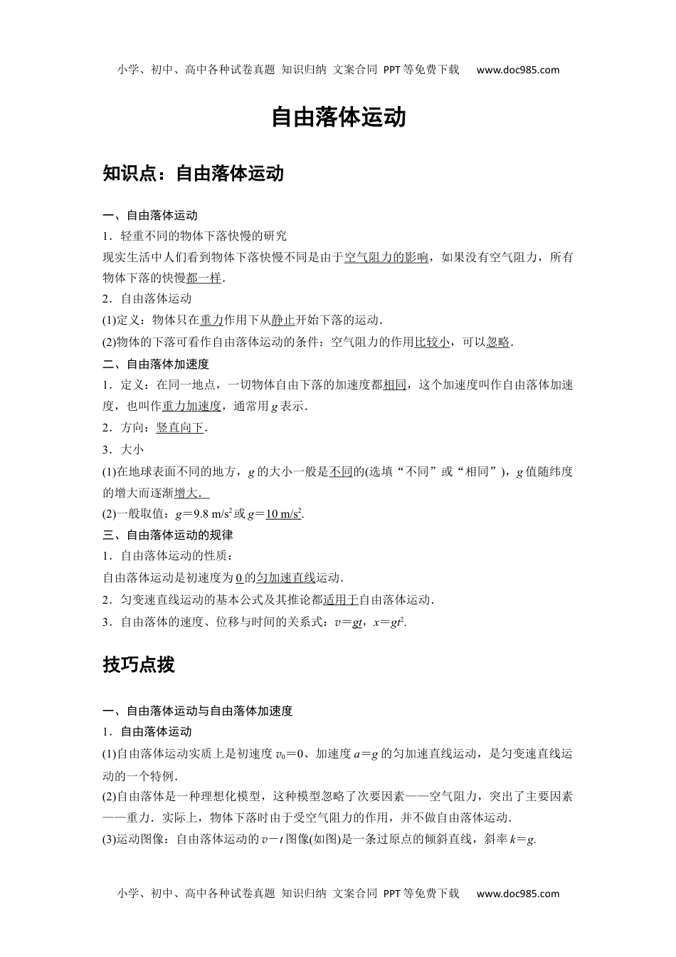 小学、初中、高中各种试卷真题知识归纳文案合同PPT等免费下载www.doc985.com自由落体运动知识点:自由落体运动一、自由落体运动1.轻重不同的物体下落快慢的研究现实生活中人们看到物体下落快慢不同是由于空气阻力的影响,如果没有空气阻力,所有物体下落的快慢都一样.2.自由落体运动(1)定义:物体只在重力作用下从静止开始下落的运动.(2)物体的下落可看作自由落体运动的条件:空气阻力的作用比较小,可以忽略.二、自由落体加速度1.定义:在同一地点,一切物体自由下落的加速度都相同,这个加速度叫作自由落体加速度,也叫作重力加速度,通常用g表示.2.方向:竖直向下.3.大小(1)在地球表面不同的地方,g的大小一般是不同的(选填“不同”或“相同”),g值随纬度的增大而逐渐增大.(2)一般取值:g=9.8m/s2或g=10m/s2.三、自由落体运动的规律1.自由落体运动的性质:自由落体运动是初速度为0的匀加速直线运动.2.匀变速直线运动的基本公式及其推论都适用于自由落体运动.3.自由落体的速度、位移与时间的关系式:v=gt,x=gt2.技巧点拨一、自由落体运动与自由落体加速度1.自由落体运动(1)自由落体运动实质上是初速度v0=0、加速度a=g的匀加速直线运动,是匀变速直线运动的一个特例.(2)自由落体是一种理想化模型,这种模型忽略了次要因素——空气阻力,突出了主要因素——重力.实际上,物体下落时由于受空气阻力的作用,并不做自由落体运动.(3)运动图像:自由落体运动的v-t图像(如图)是一条过原点的倾斜直线,斜率k=g.小学、初中、高中各种试卷真题知识归纳文案合同PPT等免费下载www.doc985.com小学、初中、高中各种试卷真题知识归纳文案合同PPT等免费下载www.doc985.com2.自由落体加速度(重力加速度)(1)方向:总是竖直向下,但不一定垂直地面;(2)大小:①在同一地点,重力加速度都相同.②地球上纬度不同的地点重力加速度不同,其大小随纬度的增加而增大,赤道上最小,两极处最大,但各处的重力加速度都接近9.8m/s2,一般计算中g取9.8m/s2或10m/s2.二、自由落体运动的规律1.自由落体运动的基本公式匀变速直线运动规律――→自由落体运动规律――→2.匀变速直线运动的一切推论公式,如平均速度公式、位移差公式、初速度为零的匀变速直线运动的比例式,都适用于自由落体运动.例题精练1.(浙江模拟)杂技演员每隔相等的时间竖直向上抛出一个小球(不计一切阻力,小球间互不影响),若每个小球上升的最大高度都是1.8米,他一共有5个小球,要想使节目连续不断地表演下去,根据该表演者的实际情况,在他的手中总要有一个小球停留,则每个小球在手中停留的时间应为(g取10m/s2)()A.0.36秒B.0.24秒C.0.2秒D.0.3秒【分析】小球做竖直上抛运动,根据运动学公式求解出运动的时间;然后根据题意分析抛球运动过程.【解答】解:根据h=gt2可知,小球从1.8m的高处自由落下的时间为:t1==s=0.6s,根据竖直上抛运动的对称性可知,小球从手中上升至1.8m高的时间为:t2=t1=0.6s,故小球做竖直上抛运动的总时间为:t=t1+t2=1.2s,由题意知,演员手中总保留一个小球,扔出一球后立即接到另一球,说明若假设手中小球抛出瞬间为起点计时,此时3个球在空中,另外两个小球都在手边,由运动的对称性可知,此时小球之间的时间间隔为:1与2之间;2与3之间;3与4之间以及4与5之间共4段时间间隔,则有:t=4Δt,小学、初中、高中各种试卷真题知识归纳文案合同PPT等免费下载www.doc985.com小学、初中、高中各种试卷真题知识归纳文案合同PPT等免费下载www.doc985.com解得Δt==s=0.3s。故ABC错误,D正确。故选:D。【点评】本题主要考查了竖直上抛运动的特点,尤其是对其运动“对称性”的理解,然后分析清楚几个小球的运动规律即可。随堂练习1.(保定二模)从居民楼某楼层的窗台上掉下一苹果,目测落地前最后一秒的位移约为10m,忽略空气阻力,重力加速度g=10m/s2。则苹果掉下时的楼层为(设每层楼高约2.5m)()A.第三层B.第四层C.第五层D.第六层【分析】苹果做自由落体运动,先由匀变速直线运动中间时刻的速度等于该时间段的平均速度求出下落最后0.5s的初速度,进...