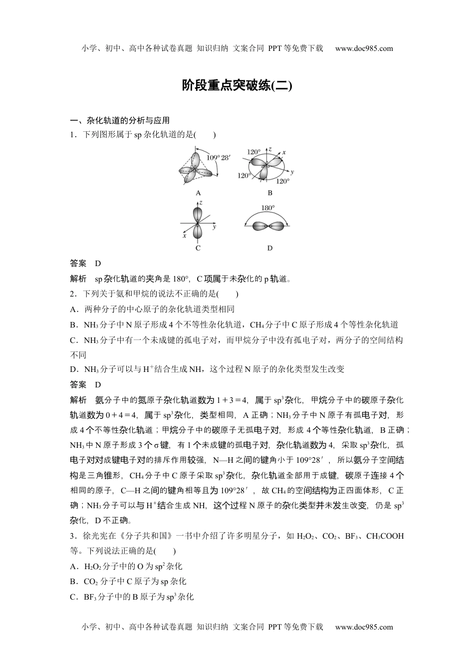 小学、初中、高中各种试卷真题知识归纳文案合同PPT等免费下载www.doc985.com阶段重点突破练(二)一、杂化轨道的分析与应用1.下列图形属于sp杂化轨道的是()答案D解析sp化道的角是杂轨夹180°,C于未化的项属杂p道。轨2.下列关于氨和甲烷的说法不正确的是()A.两种分子的中心原子的杂化轨道类型相同B.NH3分子中N原子形成4个不等性杂化轨道,CH4分子中C原子形成4个等性杂化轨道C.NH3分子中有一个未成键的孤电子对,而甲烷分子中没有孤电子对,两分子的空间结构不同D.NH3分子可以与H+结合生成NH,这个过程N原子的杂化类型发生改变答案D解析分子中的原子化道氨氮杂轨数为1+3=4,于属sp3化,甲分子中的原子化杂烷碳杂道轨数为0+4=4,于属sp3化,型相同,杂类A正确;NH3分子中N原子有孤子,形电对成4不等性化道;甲分子中的原子无孤子,形成个杂轨烷碳电对4等性化道,个杂轨B正确;NH3中N原子形成3个σ,有键1未成的孤子,化道个键电对杂轨数为4,采取sp3化,孤杂子成子的排斥作用强,电对对键电对较N—H之的角小于间键109°28′,所以分子空氨间结是三角形,构锥CH4分子中C原子采取sp3化,化道全部用于成,原子接杂杂轨键碳连4个相同的原子,C—H之的角相等且间键为109°28′,故CH4的空正四面体形,间结构为C正确;NH3分子可以与H+合生成结NH,程这个过N原子的化型未生改,仍是杂类并发变sp3化,杂D不正确。3.徐光宪在《分子共和国》一书中介绍了许多明星分子,如H2O2、CO2、BF3、CH3COOH等。下列说法正确的是()A.H2O2分子中的O为sp2杂化B.CO2分子中C原子为sp杂化C.BF3分子中的B原子为sp3杂化小学、初中、高中各种试卷真题知识归纳文案合同PPT等免费下载www.doc985.com小学、初中、高中各种试卷真题知识归纳文案合同PPT等免费下载www.doc985.comD.CH3COOH分子中C原子均为sp2杂化答案B解析H2O2分子中原子形成氧2个σ,含有键2孤子,采取个电对sp3化,故杂A;错误CO2分子中C原子形成2个σ,有孤子,采取键没电对sp化,故杂B正确;BF3分子中B原子形成3个σ,有孤子,采取键没电对sp2化,故杂C;错误CH3COOH分子中甲基上的碳原子形成4个σ,有孤子,采取键没电对sp3化,故杂D。错误4.(2022·武高二期中汉)有机物(如图)中下方标有数字“1”“2”“3”的碳原子的杂化方式依次为()A.sp、sp2、sp3B.sp2、sp、sp3C.sp3、sp2、spD.sp、sp、sp3答案B解析上原子的价子苯环碳层电对数为3,则为sp2化,中心原子平面三角形,杂碳为结构所以角键为120°,此每原子剩一子,就形成一大时个碳还个单电个π,就是介于键碳碳单之的特殊;键与碳碳双键间键“1”上原子化方式是苯环碳杂sp2;“2”三端的碳碳键两C原子含有2个σ,原子采用键则碳sp化;杂“3”甲基含有4个σ,原子采用键则碳sp3化杂。二、分子(或离子)空间结构的判断5.下列物质中,化学键类型和分子空间结构皆相同的是()A.CO2和SO3B.CH4和SiH4C.BF3和PH3D.HCl和NH4Cl答案B解析CO2和SO3都含有共价,但键CO2直形,为线SO3平面三角形,故为A;错误CH4和SiH4都含有共价,且都是正四面体形,故键B正确;BF3和PH3都含有共价,键BF3平面为三角形,PH3三角形,故为锥C;错误HCl只含共价,键NH4Cl含有离子和共价,故键键D。错误6.用价层电子对互斥模型可以预测许多分子或离子的空间结构,有时也能用来推测键角大小。下列判断正确的是()A.H2O、CS2都是直线形的分子B.BF3键角为120°,SnBr2键角大于120°C.CH2O、BF3都是平面三角形的分子D.PCl3、PCl5都是三角锥形的分子答案C解析CS2的中心原子的价子层电对数为2,有孤子,分子的空直形没电对间结构为线,H2O中O原子的价子层电对数为2+×(6-2×1)=4,而且含有2孤子,分子的空个电对间结构为V形,故A;错误BF3中B的价子层电对数为3+×(3-3×1)=3,所以平面三角为小学、初中、高中各种试卷真题知识归纳文案合同PPT等免费下载www.doc985.com小学、初中、高中各种试卷真题知识归纳文案合同PPT等免费下载www.doc985.com形,角结构键为120°,SnBr2中Sn的价子层电对数为2+×(4-2×1)=3,含有一孤个电子,对为V形,孤子成子之的排斥力大于成子之的排斥力,结构电对与键电对间...