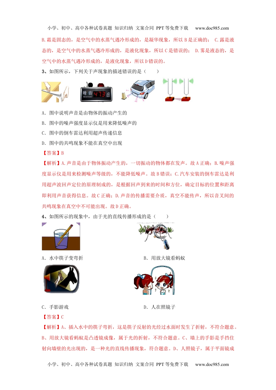 小学、初中、高中各种试卷真题知识归纳文案合同PPT等免费下载www.doc985.com八年级(上)物理期末模拟试卷(六)(全卷四部分,共25题,满分100分,考试时间90分钟)一、选择题(本大题共8个小题,每个小题只有一个正确选项,每小题3分,共24分)1、根据生活经验,以下估测最接近实际的是()A.人洗澡时感觉舒适的水温约为70℃B.八年级物理课本长约6cmC.成年人正常步行的速度约为1.1m/sD.一枚一元硬币的质量约为60g【答案】C.【解析】首先对题目中涉及的物理量有个初步的了解,对于选项中的单位,可根据需要进行相应的换算或转换,排除与生活实际相差较远的选项,找出符合生活实际的答案.A.人体正常体温在37℃左右,洗澡水的温度应该略高于体温,在40℃左右,不可能达到70℃.此选项不符合实际;B.中学生伸开手掌,大拇指指尖到中指指尖的距离大约18cm,物理课本的长度比18cm大一些,在26cm左右.此选项不符合实际;C.成年人正常步行的速度在4km/h=4×m/s≈1.1m/s左右.此选项符合实际;D.一块橡皮的质量在6g左右,一枚一元硬币的质量与此差不多,在6g左右.此选项不符合实际.2、如图所示,自然界中的物态变化让我们领略了许多美妙景色,下列说法中正确的是()A.轻柔的雪是升华现象B.凝重的霜是凝华现象C.晶莹的露是熔化现象D.飘渺的雾是汽化现象【答案】B【解析】A.雪是固态的,是空气中的水蒸气遇冷形成的,是凝华现象,所以A是错误的。小学、初中、高中各种试卷真题知识归纳文案合同PPT等免费下载www.doc985.com小学、初中、高中各种试卷真题知识归纳文案合同PPT等免费下载www.doc985.comB.霜是固态的,是空气中的水蒸气遇冷形成的,是凝华现象,所以B是正确的;C.露是液态的,是空气中的水蒸气遇冷形成的,是液化现象,所以C是错误的;D.雾是液态的,是空气中的水蒸气遇冷形成的,是液化现象,所以D错误的。3、如图所示,下列关于声现象的描述错误的是()A.图中说明声音是由物体的振动产生的B.图中的噪声强度显示仪是用来降低噪声的C.图中的倒车雷达利用超声传递信息D.图中的共鸣现象不能在真空中出现【答案】B【解析】A.声音是由于物体振动产生的,一切振动的物体都在发声。故A正确;B.噪声强度显示仪是用来检测噪声等级的,不能降低噪声。故B错误;C.汽车安装的倒车雷达是利用超声波回声定位的原理制成的,是根据回声到来的时间和方位,确定目标的位置和距离即利用声音获得信息。故C正确;D.声音的传播需要介质,真空不能传声,所以音叉间的共鸣现象在真空中不可能出现。故D正确。4、如图所示的现象中,由于光的直线传播形成的是()A.水中筷子变弯折B.用放大镜看蚂蚁C.手影游戏D.人在照镜子【答案】C【解析】A、插入水中的筷子弯折,这是筷子反射的光经过水面时发生了折射,不符合题意。B、用放大镜看蚂蚁是凸透镜成像,属于光的折射,不符合题意。C、墙上的手影是手挡住射向墙壁的光出现的,是一种光的直线传播现象,符合题意。D、人照镜子,属于平面镜成小学、初中、高中各种试卷真题知识归纳文案合同PPT等免费下载www.doc985.com小学、初中、高中各种试卷真题知识归纳文案合同PPT等免费下载www.doc985.com像,是由光的反射形成的,不符合题意。故选:C。5、如图所示,在”探究凸透镜成像的规律”实验中,烛焰在距离凸透镜8cm处时,在距离凸透镜15cm处的光屏上成倒立的像。保持蜡烛和光屏不动,现把凸透镜向光屏方向移动7cm,下列关于烛焰在光屏上成像的说法正确的是()A.不能成清晰的像B.成倒立的缩小的像C.成倒立的放大的像D.成倒立的等大的像【答案】B【解析】如图所示,在”探究凸透镜成像的规律”实验中,烛焰在距离凸透镜8cm处时,在距离凸透镜15cm处的光屏上成倒立的像。此时物距小于像距,f<u=8cm<2f,解得,4cm<f<8cm,v=15cm>2f,解得f<7.5cm,焦距范围:4cm<f<7.5cm,保持蜡烛和光屏不动,现把凸透镜向光屏方向移动7cm,此时u′=8cm+7cm=15cm>2f,v′=15cm﹣7cm=8cm,f<v′<2f,凸透镜成倒立缩小的实像,故ACD错误,B正确。6、甲、乙两人进行100m赛跑,结果甲比乙超前10m到达终点.如果让甲从原起跑线往后退10m起...