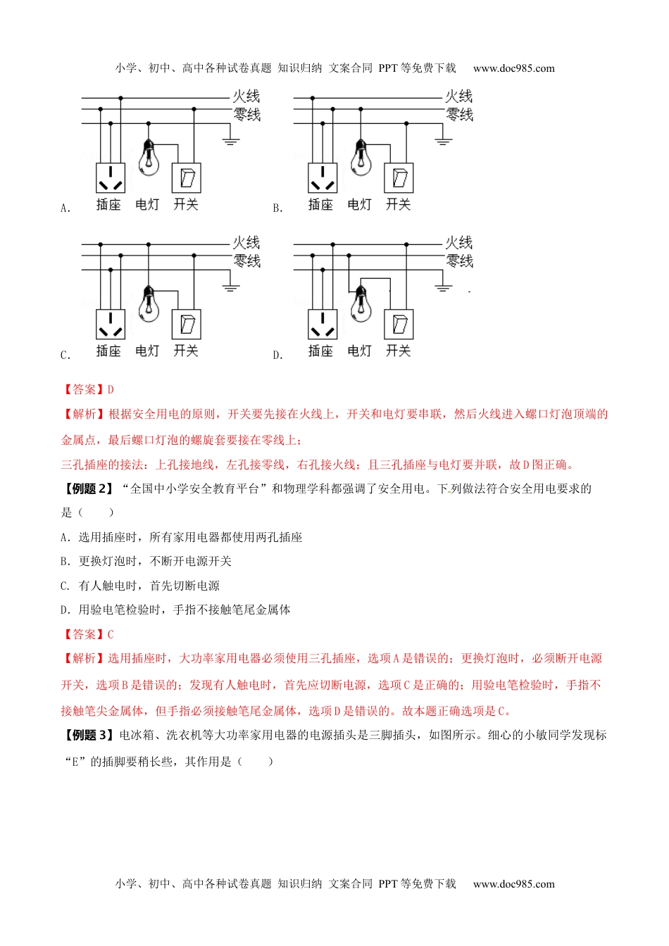 小学、初中、高中各种试卷真题知识归纳文案合同PPT等免费下载www.doc985.com2222230-0物理新课标下九年级全册同步课节减负作业(人教版)第十九章生活用电题专149.《生活用电》单元复习方案一、单元考点归纳总结考点一:家庭电路1.家庭电路的组成部分:进户线→电能表→总开关→保险丝→用电器。2.家庭电路的连接:各种用电器是并联接入电路的,插座与灯座是并联的,控制各用电器工作的开关与用电器是串联的。3.家庭电路各部分的作用(1)低压供电线:家庭电路有两条进户线,是从低压输电线上引下来的,一根叫火线,另一根叫零线,它们之间有220V的电压。测电笔——用来辨别火线和零线。注意:测电笔接触火线时,如果观察不到氖管发光,则产生这种现象的原因可能是:①测电笔氖管已坏;②手没有接触笔尾金属体;③火线断了,若在检修电路时,发现灯泡不亮,火线、零线都能使测电笔发光,可能的原因是:火线完好,零线处有开路,被测段的零线通过用电器和火线构成通路。(2)电能表:安装在家庭电路的干路上,测量用户消耗的电能(电功)的仪表,电路使用时P实应不大于电能表额定功率P额。即P实≤U额I额。(3)闸刀(空气开关):总闸刀开关装在干路上,控制整个电路的通断,以便检测电路和更换设备。(4)保险丝:保险丝是由电阻率大、熔点低的铅锑合金制成,当过大的电流通过时,保险丝产生较多的热量使它的温度达到熔点,于是保险丝熔断,自动切断电路。起到保护电路的作用。不能用较粗的保险丝或铁丝、铜丝、铝丝等代替。因为这些导线的电阻小,产生的热量少,而且铜丝的熔点高,不易熔断。(5)插座:并联在家庭电路中,如图所示,具体接线情况:说明:1接火线;2接零线;3接地线;4接用电器的金属外壳;5接用电部分的线路。把三脚插头插在三孔插座里,在把用电部分连入电路的同时,也把用电器的金属外壳与大地连接起来,防小学、初中、高中各种试卷真题知识归纳文案合同PPT等免费下载www.doc985.com小学、初中、高中各种试卷真题知识归纳文案合同PPT等免费下载www.doc985.com止了外壳带电引起的触电事故。(6)用电器、开关开关和用电器串联,控制用电器,如果开关短路,用电器会一直工作,开关不能控制,但不会烧断干路上的保险丝。根据安全用电原则连接电路,每个开关都可以单独控制灯。4.家庭电路电流过大的原因(1)原因:发生短路或用电器总功率过大。(2)家庭电路保险丝烧断的原因:发生短路、用电器功率过大、选择了额定电流过小的保险丝。考点二:安全用电1.触电事故:一定强度的电流通过人体所引起的伤害,安全电压不高于36V。动力电路电压380V,家庭电路电压220V,它们都超出了安全电压。2.触电形式:(1)家庭电路(低压触电)a.单线触电;b.双线触电。(2)高压触电a.高压电弧触电;b.跨步电压触电。3.安全用电原则:不接触低压带电体,不靠近高压带电体。4.常见电压值划分(1)不高于36V的电压是安全电压;(2)1000V以下的电压叫低压;(3)1000V以上的电压叫高压。5.生活中安全用电常识(1)对于人体安全的电压是不高于36V;(2)不接触火线,有金属外壳的用电器要将金属外壳接地;(3)高大筑要安装避雷针,防止雷击;(4)不靠近高压线路,防止发生高压电弧触电和跨步电压触电;(5)有人一旦触电或家庭电路发生火灾都要立即切断电源,绝对不能用水来扑灭电器火灾。例题二、单元重要及其解析【例题1】将电灯、开关和插座接入家庭电路中,接线正确的是()小学、初中、高中各种试卷真题知识归纳文案合同PPT等免费下载www.doc985.com小学、初中、高中各种试卷真题知识归纳文案合同PPT等免费下载www.doc985.comA.B.C.D.【答案】D【解析】根据安全用电的原则,开关要先接在火线上,开关和电灯要串联,然后火线进入螺口灯泡顶端的金属点,最后螺口灯泡的螺旋套要接在零线上;三孔插座的接法:上孔接地线,左孔接零线,右孔接火线;且三孔插座与电灯要并联,故D图正确。【例题2】“全国中小学安全教育平台”和物理学科都强调了安全用电。下列做法符合安全用电要求的是()A.选用插座时,所有家用电器都使用两孔插座B.更换灯泡时,不断开电源开关C.有人触电时,...