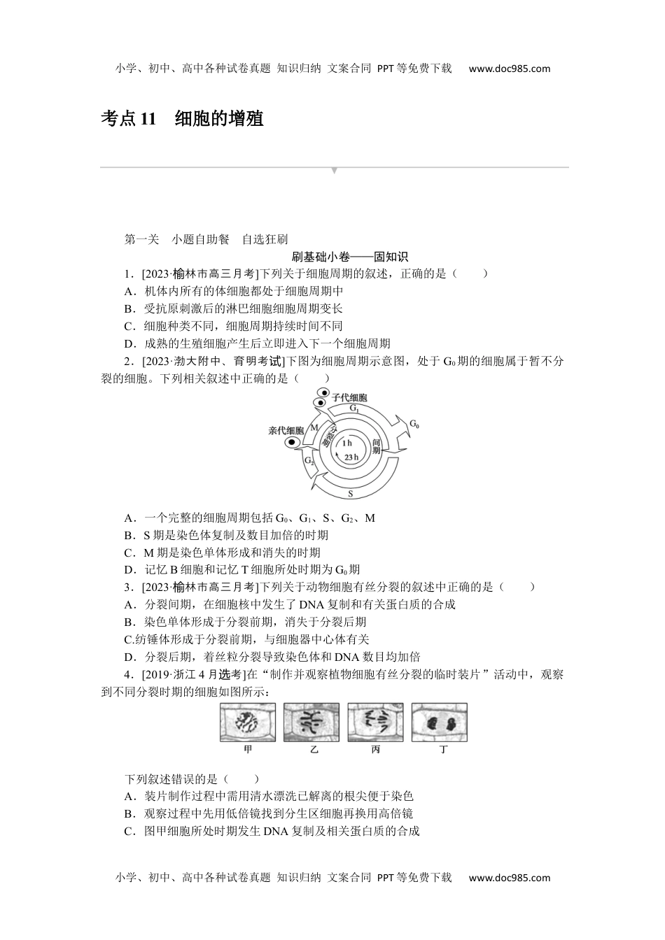 小学、初中、高中各种试卷真题知识归纳文案合同PPT等免费下载www.doc985.com考点11细胞的增殖第一关小题自助餐自选狂刷刷基础小卷——固知识1.[2023·林市高三月考榆]下列关于细胞周期的叙述,正确的是()A.机体内所有的体细胞都处于细胞周期中B.受抗原刺激后的淋巴细胞细胞周期变长C.细胞种类不同,细胞周期持续时间不同D.成熟的生殖细胞产生后立即进入下一个细胞周期2.[2023·渤大附中、育明考试]下图为细胞周期示意图,处于G0期的细胞属于暂不分裂的细胞。下列相关叙述中正确的是()A.一个完整的细胞周期包括G0、G1、S、G2、MB.S期是染色体复制及数目加倍的时期C.M期是染色单体形成和消失的时期D.记忆B细胞和记忆T细胞所处时期为G0期3.[2023·林市高三月考榆]下列关于动物细胞有丝分裂的叙述中正确的是()A.分裂间期,在细胞核中发生了DNA复制和有关蛋白质的合成B.染色单体形成于分裂前期,消失于分裂后期C.纺锤体形成于分裂前期,与细胞器中心体有关D.分裂后期,着丝粒分裂导致染色体和DNA数目均加倍4.[2019·浙江4月考选]在“制作并观察植物细胞有丝分裂的临时装片”活动中,观察到不同分裂时期的细胞如图所示:下列叙述错误的是()A.装片制作过程中需用清水漂洗已解离的根尖便于染色B.观察过程中先用低倍镜找到分生区细胞再换用高倍镜C.图甲细胞所处时期发生DNA复制及相关蛋白质的合成小学、初中、高中各种试卷真题知识归纳文案合同PPT等免费下载www.doc985.com小学、初中、高中各种试卷真题知识归纳文案合同PPT等免费下载www.doc985.comD.图丙细胞中的染色体数目比图乙细胞中的增加了一倍5.[2023·河北省“五一个”考联]人体内的某个细胞正在进行着丝粒分裂,下列相关叙述正确的是()A.着丝粒分裂后,该细胞含有46个核DNA分子B.着丝粒分裂后,该细胞含有92条染色体C.着丝粒分裂后,该细胞可能含有4个染色体组D.着丝粒分裂后,该细胞的细胞质会均等分裂刷提升小卷——培素养6.[2023·浙江校考二模联]已知处于细胞周期各个时期的细胞数量与时长成正比。一个处于培养状态下的胡萝卜根尖细胞株,细胞周期各阶段的时长如下表,下列叙述错误的是()周期G1SG2M合计时间(h)1.32.72.90.67.5A.处在各个时期的细胞都可以进行蛋白质的合成B.用含DNA合成抑制剂的培养液培养4.8h后,所有细胞都停止分裂活动C.用含DNA合成抑制剂的培养液培养4.8h后去除抑制剂,各细胞的分裂进程将“同步”D.胡萝卜各组织细胞周期时间长短不一定相同7.[2023·重南模庆开拟]将某动物(染色体数为2n)用32P充分标记后的精子与未标记的卵细胞结合形成受精卵,随后转入基本培养基(无32P)中继续培养。下列有关叙述,不正确的是()A.第一次有丝分裂中期一个细胞中含有32P标记的染色体有n条B.第一次有丝分裂后期一个细胞中含有32P标记的染色体有n条C.第二次有丝分裂中期一个细胞中含有32P标记的染色体有n条D.第二次有丝分裂后期一个细胞中含有32P标记的染色体有n条8.[2023·浙江模拟]在有丝分裂中期,若出现单附着染色体(染色体的着丝粒只与一侧的纺锤丝相连,如下图所示),细胞将延缓后期的起始,直至该染色体与另一极的纺锤丝相连,并正确排列在赤道板上。此过程受位于前期和错误排列的中期染色体上的MAD2蛋白的监控,正确排列的中期染色体上没有MAD2蛋白。用玻璃微针勾住单附着染色体,模拟施加来自对极的正常拉力时,细胞会进入分裂后期。下列说法错误的是()A.细胞分裂能否进入到后期与来自两极纺锤丝的均衡拉力有关B.当所有染色体上的MAD2蛋白都消失后细胞才能进入分裂后期C.MAD2蛋白功能异常,细胞将在染色体错误排列时停止在分裂中期D.癌细胞的染色体排布异常时仍然能继续分裂可能与监控缺失有关9.[2023·江南京市二模苏]下图为显微镜下观察某二倍体植物的体细胞制作的临时装片结果,下列说法正确的是()小学、初中、高中各种试卷真题知识归纳文案合同PPT等免费下载www.doc985.com小学、初中、高中各种试卷真题知识归纳文案合同PPT等免费下载www.doc985.comA.细胞甲中染色体形态固定、数目清晰,细胞中有一个染色体组B.细胞乙中主要完成DNA的复制,...