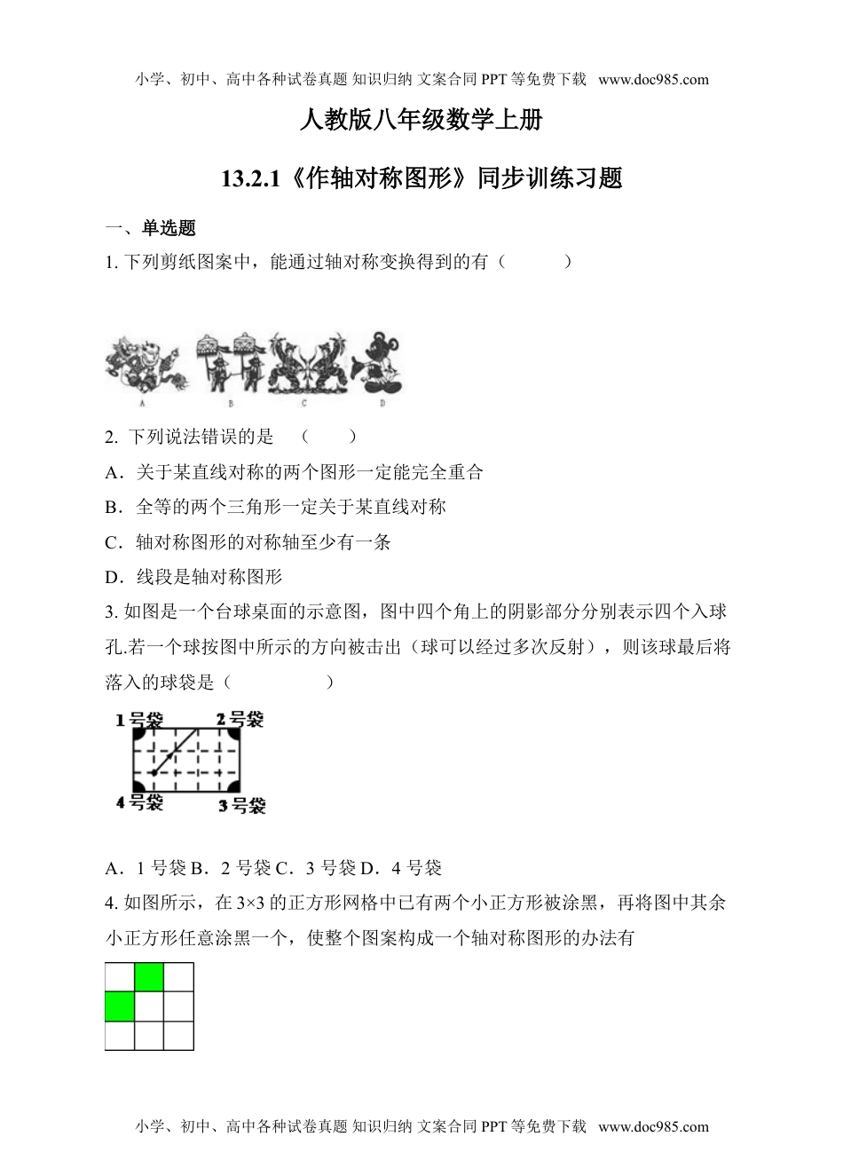 小学、初中、高中各种试卷真题知识归纳文案合同PPT等免费下载www.doc985.com人教版八年级数学上册13.2.1《作轴对称图形》同步训练习题一、单选题1.下列剪纸图案中,能通过轴对称变换得到的有()2.下列说法错误的是()A.关于某直线对称的两个图形一定能完全重合B.全等的两个三角形一定关于某直线对称C.轴对称图形的对称轴至少有一条D.线段是轴对称图形3.如图是一个台球桌面的示意图,图中四个角上的阴影部分分别表示四个入球孔.若一个球按图中所示的方向被击出(球可以经过多次反射),则该球最后将落入的球袋是()21cnjy.comA.1号袋B.2号袋C.3号袋D.4号袋4.如图所示,在3×3的正方形网格中已有两个小正方形被涂黑,再将图中其余小正方形任意涂黑一个,使整个图案构成一个轴对称图形的办法有小学、初中、高中各种试卷真题知识归纳文案合同PPT等免费下载www.doc985.com小学、初中、高中各种试卷真题知识归纳文案合同PPT等免费下载www.doc985.comA.3种B.4种C.5种D.6种5.在如上图由5个小正方形组成的图形中,再补上一个小正方形,使它成为轴对称图形,你有几种不同的方法()2·1·c·n·j·yA.2种B.3种C.4种D.5种6.小强将一张正方形纸片按如图所示对折两次,并在如图位置上剪去一个小正方形,然后把纸片展开,得到的图形应是()7.如图,直线l1与直线l2相交,∠α=60°,点P在∠α内(不在l1,l2上)。小明用下面的方法作P的对称点:先以l1为对称轴作点P关于l1的对称点P1,再以l2为对称轴作P1关于l2的对称点P2,然后再以l1为对称轴作P2关于l1的对称点P3,以l2为对称轴作P3关于l2的对称点P4,……,如此继续,得到一系列点P1,P2,P3,…,。若与P重合,则n的最小值是()A.5B.6C.7D.8小学、初中、高中各种试卷真题知识归纳文案合同PPT等免费下载www.doc985.com小学、初中、高中各种试卷真题知识归纳文案合同PPT等免费下载www.doc985.com二、填空题8.轴对称变换不改图形的和9.一辆汽车的牌号在水中的倒影如图所示,则这辆汽车的牌号应为。10.如右图,在的正方形格纸中,有一个以格点为顶点的,请你找出格纸中所有与成轴对称且也以格点为顶点的三角形,这样的三角形共有▲个.【来源:21·世纪·教育·网】11.如图(1),将一个圆对折,再对折,然后把得到的图形涂色,最后沿着折痕打开就得到了四个完全一样的图形.图(2)中与涂色部分成轴对称.(在符号Ⅰ,Ⅱ,Ⅲ中选择)www-2-1-cnjy-com三、解答题12.如图,仿照例子利用“两个圆、两个三角形和两条平行线段”设计一个轴对称图案,并说明你所要表达的含义.21·世纪*教育网小学、初中、高中各种试卷真题知识归纳文案合同PPT等免费下载www.doc985.com小学、初中、高中各种试卷真题知识归纳文案合同PPT等免费下载www.doc985.com13.如图,以l为对称轴,画出已知图形的对称图形.14.图1、图2分别是的正方形网格,,每个小方格都是边长为1的正方形,点是方格纸的两个格点(即正方形的顶点).www.21-cn-jy.com(1)在图1中确定格点,并画出,使其是面积为1个平方单位的钝角三角形.(2)在图2中确定格点,并画出,使其是面积为1个平方单位的轴对称三角形.2-1-c-n-j-y小学、初中、高中各种试卷真题知识归纳文案合同PPT等免费下载www.doc985.com小学、初中、高中各种试卷真题知识归纳文案合同PPT等免费下载www.doc985.com15.如图,由小正方形组成的L形图中,请你用三种方法分别在下图中添画一个小正方形使它成为轴对称图形:21*cnjy*com16.图6.1、6.2、6.3均为4×4的正方形网格,每个小正方形的边长均为1.请分别在这三个图中各画出一个与△ABC成轴对称、顶点在格点上,且位置不同的三角形.小学、初中、高中各种试卷真题知识归纳文案合同PPT等免费下载www.doc985.com小学、初中、高中各种试卷真题知识归纳文案合同PPT等免费下载www.doc985.com人教版八年级数学上册13.2.1《作轴对称图形》同步训练习题参考答案一、选择题1.C2.B3.B4.C解析:试题分析:如果一个图形沿一条直线对折,直线两旁的部分能互相重合,那么这个图形叫做轴对称图形.选择一个正方形涂黑,使得3个涂黑的正方形组成轴对称图形,选择的位置有以下几...