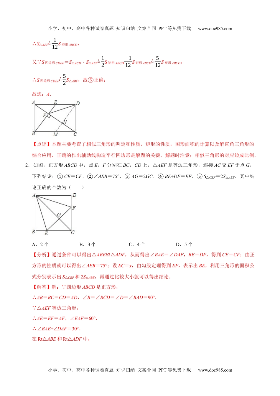 小学、初中、高中各种试卷真题知识归纳文案合同PPT等免费下载www.doc985.com专题31四边形综合练习(提优)一.选择题1.如图,在矩形ABCD中,E是AD边的中点,BE⊥AC于点,连接DF,分析下列五个结论:①△AEF△∽CAB;②CF=2AF;③DF=DC;④tan∠ACD¿❑√2;⑤S四边形CDEF¿52S△ABF其中正确的结论有()A.5个B.4个C.3个D.2个【分析】①四边形ABCD是矩形,BE⊥AC,则∠ABC=∠AFB=90°,又∠BAF=∠CAB,于是△AEF∽△CAB;②由AE¿12AD¿12BC,又AD∥BC,所以AEBC=AFFC=¿2;③过D作DM∥BE交AC于N,得到四边形BMDE是平行四边形,求出BM=DE¿12BC,得到CN=NF,根据线段的垂直平分线的性质可得结论;④设AE=a,AB=b,则AD=2a,由△BAE∽△ADC,得出b¿❑√2a,进而得出tan∠ACD¿ADCD=2ab=2a❑√2a=❑√2;⑤根据△AEF∽△CBF得到EFBF=AEBC=12,求出S△AEF¿12S△ABF,S△ABF¿16S矩形ABCDS四边形CDEF=S△ACD﹣S△AEF¿12S矩形ABCD−112S矩形ABCD¿512S矩形ABCD,即可得到S四边形CDEF¿52S△ABF.【解答】解:如图,过D作DM∥BE交AC于N, 四边形ABCD是矩形,∴AD∥BC,∠ABC=90°,AD=BC, BE⊥AC于点F,∴∠EAC=∠ACB,∠ABC=∠AFE=90°,∴△AEF∽△CAB,故①正确;小学、初中、高中各种试卷真题知识归纳文案合同PPT等免费下载www.doc985.com小学、初中、高中各种试卷真题知识归纳文案合同PPT等免费下载www.doc985.com AD∥BC,∴△AEF∽△CBF,∴AEBC=AFCF, AE¿12AD¿12BC,∴AFCF=12,∴CF=2AF,故②正确; DE∥BM,BE∥DM,∴四边形BMDE是平行四边形,∴BM=DE¿12BC,∴BM=CM,∴CN=NF, BE⊥AC于点F,DM∥BE,∴DN⊥CF,∴DM垂直平分CF,∴DF=DC,故③正确;设AE=a,AB=b,则AD=2a,由△BAE∽△ADC,有ba=2ab,即b¿❑√2a,∴tan∠ACD¿ADCD=2ab=2a❑√2a=❑√2,故④正确; △AEF∽△CBF,∴EFBF=AEBC=12,∴S△AEF¿12S△ABF,S△ABF¿16S矩形ABCD,小学、初中、高中各种试卷真题知识归纳文案合同PPT等免费下载www.doc985.com小学、初中、高中各种试卷真题知识归纳文案合同PPT等免费下载www.doc985.com∴S△AEF¿112S矩形ABCD,又 S四边形CDEF=S△ACD﹣S△AEF¿12S矩形ABCD−112S矩形ABCD¿512S矩形ABCD,∴S四边形CDEF¿52S△ABF,故⑤正确;故选:A.【点评】本题主要考查了相似三角形的判定和性质,矩形的性质,图形面积的计算以及解直角三角形的综合应用,正确的作出辅助线构造平行四边形是解题的关键.解题时注意:相似三角形的对应边成比例.2.如图,正方形ABCD中,点E,F分别在BC,CD上,△AEF是等边三角形,连接AC交EF于点G,下列结论:①CE=CF,②∠AEB=75°,③AG=2GC,④BE+DF=EF,⑤S△CEF=2S△ABE,其中结论正确的个数为()A.2个B.3个C.4个D.5个【分析】通过条件可以得出△ABE△≌ADF,从而得出∠BAE=∠DAF,BE=DF,得到CE=CF;由正方形的性质就可以得出∠AEB=75°;设EC=x,由勾股定理得到EF,表示出BE,利用三角形的面积公式分别表示出S△CEF和2S△ABE,再通过比较大小就可以得出结论.【解答】解: 四边形ABCD是正方形,∴AB=BC=CD=AD,∠B=∠BCD=∠D=∠BAD=90°. △AEF等边三角形,∴AE=EF=AF,∠EAF=60°.∴∠BAE+∠DAF=30°.在Rt△ABE和Rt△ADF中,小学、初中、高中各种试卷真题知识归纳文案合同PPT等免费下载www.doc985.com小学、初中、高中各种试卷真题知识归纳文案合同PPT等免费下载www.doc985.com{AB=ADAE=AF,Rt△ABERt≌△ADF(HL),∴BE=DF,∴CE=CF,故①正确; ∠BAE=∠DAF,∴∠DAF+∠DAF=30°,即∠DAF=15°,∴∠AEB=75°,故②正确;设EC=x,由勾股定理,得EF¿❑√2x,CG¿❑√22x,AG=AEsin60°=EFsin60°=2×CGsin60°¿❑√62x,∴AG≠2GC,③错误; CG¿❑√22x,AG¿❑√62x,∴AC¿❑√2+❑√62x∴AB=AC•❑√22=1+❑√32x,∴BE¿1+❑√32x﹣x¿❑√3−12x,∴BE+DF=(❑√3−¿1)x,∴BE+DF≠EF,故④错误; S△CEF¿12x2,S△ABE¿12×BE×AB¿12×1+❑√32x×❑√3−12x¿14x2,∴2S△ABE═S△CEF,故⑤正确.综上所述,正确的有3个,...