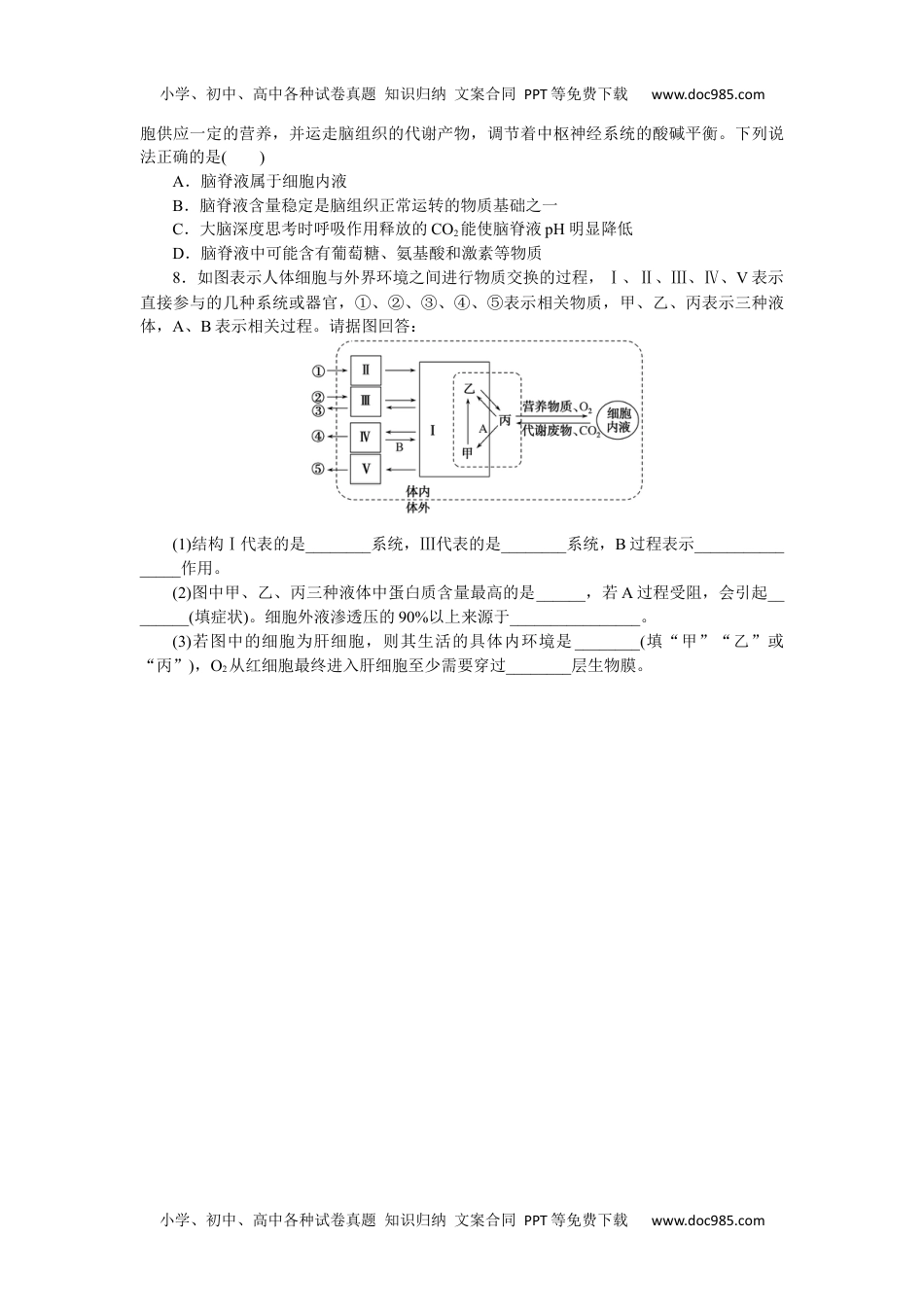 小学、初中、高中各种试卷真题知识归纳文案合同PPT等免费下载www.doc985.com小学、初中、高中各种试卷真题知识归纳文案合同PPT等免费下载www.doc985.com专练63细胞生活的环境1.[2022·广卷东]在2022年的北京冬奥会上,我国运动健儿取得了骄人的成绩。在运动员的科学训练和比赛期间需要监测一些相关指标,下列指标中不属于内环境组成成分的是()A.血红蛋白B.血糖C.肾上腺素D.睾酮2.一般情况下,下列各组物质全属于内环境的成分的是()A.O2、CO2、血红蛋白、H+、Na+B.消化酶、抗体、激素、H2OC.乳酸脱氢酶、Ca2+、载体蛋白、尿素D.K+、葡萄糖、氨基酸、尿素、H2O3.急性肾小球肾炎病人的尿液中有蛋白质,病情严重时,会出现全身浮肿,与正常人相比,这种病人的血浆发生的变化是()A.血浆蛋白增加,血浆渗透压升高B.血浆蛋白增加,血浆渗透压下降C.血浆蛋白减少,血浆渗透压升高D.血浆蛋白减少,血浆渗透压下降4.如图为人体细胞与外界环境进行物质交换的过程示意图,图中a、c代表内环境的组成成分。下列叙述错误的是()A.a中渗透压升高,会引起组织水肿B.b是体内绝大多数细胞直接生活的环境C.a中蛋白质的含量多于b和cD.淋巴细胞可以存在于a和c中5.下列关于人体组织液的叙述,错误的是()A.血浆中的葡萄糖可以通过组织液进入骨骼肌细胞B.肝细胞呼吸代谢产生的CO2可以进入组织液中C.组织液中的O2可以通过自由扩散进入组织细胞中D.运动时,丙酮酸转化成乳酸的过程发生在组织液中6.液体疗法是指通过补充(或限制)某些液体以维持机体体液平衡的治疗方法。临床上,常用5%葡萄糖溶液(血浆等渗溶液)、10%葡萄糖溶液、5%NaHCO3溶液等进行输液治疗。下列叙述错误的是()A.注射5%葡萄糖溶液会导致细胞外液渗透压升高B.治疗低血糖时,10%葡萄糖溶液主要为机体提供能量C.治疗酸中毒时,5%NaHCO3溶液能够维持机体的酸碱平衡D.液体疗法能维持机体正常的体液容量和理化性质的相对稳定7.(不定项)脑脊液充满在各脑室内,能不断产生又不断被吸收回流至静脉。它向脑细小学、初中、高中各种试卷真题知识归纳文案合同PPT等免费下载www.doc985.com小学、初中、高中各种试卷真题知识归纳文案合同PPT等免费下载www.doc985.com胞供应一定的营养,并运走脑组织的代谢产物,调节着中枢神经系统的酸碱平衡。下列说法正确的是()A.脑脊液属于细胞内液B.脑脊液含量稳定是脑组织正常运转的物质基础之一C.大脑深度思考时呼吸作用释放的CO2能使脑脊液pH明显降低D.脑脊液中可能含有葡萄糖、氨基酸和激素等物质8.如图表示人体细胞与外界环境之间进行物质交换的过程,Ⅰ、Ⅱ、Ⅲ、Ⅳ、V表示直接参与的几种系统或器官,①、②、③、④、⑤表示相关物质,甲、乙、丙表示三种液体,A、B表示相关过程。请据图回答:(1)结构Ⅰ代表的是________系统,Ⅲ代表的是________系统,B过程表示________________作用。(2)图中甲、乙、丙三种液体中蛋白质含量最高的是______,若A过程受阻,会引起________(填症状)。细胞外液渗透压的90%以上来源于________________。(3)若图中的细胞为肝细胞,则其生活的具体内环境是________(填“甲”“乙”或“丙”),O2从红细胞最终进入肝细胞至少需要穿过________层生物膜。