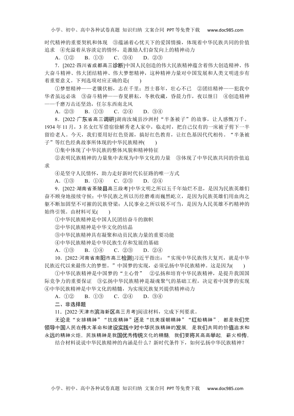 小学、初中、高中各种试卷真题知识归纳文案合同PPT等免费下载www.doc985.com小学、初中、高中各种试卷真题知识归纳文案合同PPT等免费下载www.doc985.com专练33弘扬中华优秀传统文化与民族精神一、选择题:在每小题给出的四个选项中,只有一项是符合题目要求的。1.[2022·湖南卷]革命题材电视剧《觉醒年代》激发了人们对建党先驱的无限怀念。2021年夏天,在上海龙华烈士陵园赵世炎等先烈的墓前,堆放着“寄”往百年前的信笺。“肉体已逝,脊梁仍在。”“自从知道你的故事,我爱上了历史。谢谢你,让我能坐在阳光下读书。”从这些与革命先烈跨越时空的对话中,我们感受到()①现代传媒显示出丰富民族精神的强大功能②伟大建党精神早已融入中国人民、中华民族的血脉③即使时代变迁,中华民族精神依然是中华民族永远的精神火炬④中华民族精神作为人们文化素养的核心和标志,能增强人的精神力量A.①③B.①④C.②③D.②④2.[2022·宁省考辽选择]几千年来,中华民族在同疫病斗争中能一次次转危为安,靠的就是中医药,同时,中华民族在此过程中产生了《伤寒杂病论》《温病条辨》《温热论》等经典著作。新冠肺炎临床治疗筛选出的,三药三方;(指金花清感颗粒、连花清瘟胶囊、血必净注射液和清肺排毒汤、化湿败毒方、宣肺败毒方),也是以古典医籍的经方为基础化裁而来的。这告诉我们()①中医药文化源自实践并服务于实践②中医药文化的发展要融汇多种文化特质③要推动优秀中医药文化创新性发展④要批判继承优秀的中医药文化A.①②B.①③C.②④D.③④3.[2022·河北高三调研]“神舟”系列载人飞船的成功发射是广大科技工作者共同努力的结果,中国发射“神舟”系列飞船的目的是和平利用太空,为人类谋福。这体现了中华民族精神的()A.自强不息爱好和平B.团结统一爱好和平C.勤劳勇敢自强不息D.团结统一勤劳勇敢4.[2022·河北省石家庄市高三调研]在五千多年的发展中,中华民族形成了以爱国主义为核心,团结统一,爱好和平,勤劳勇敢、自强不息的伟大民族精神。下列与民族精神对应最恰当的是()①昭君出塞——勤劳勇敢②大禹治水——团结统一③土尔扈特部东归——爱好和平④闻鸡起舞——自强不息⑤苏武牧羊——爱国主义A.①③B.②④C.③⑤D.④⑤5.[2022·福建省厦市高三门质检]爱国不是一句口号,而是一种情怀和行动。面对疫情防控常态化的严峻形势,大力弘扬救死扶伤的大爱精神、无私无悔的奉献精神、勇往直前的牺牲精神和众志成城的互助精神,不仅是新时代爱国主义的最新诠释,也是最终打赢疫情防控人民战争的“钢铁长城”。这印证了爱国主义()①不是抽象的而是具体的②是我国文化发展的“主心骨”③是人们文化素养的核心④是鼓舞人们团结奋斗的一面旗帜A.①③B.①④C.②③D.②④6.[2022·福建省高三检测]宋代理学大师朱熹在任福建漳州知州时,曾为创办的白云岩书院写过一副对联:“地位清高,日月每从肩上过;门庭开豁,江山常在掌中看。”这是千百年来中国仁人志士的崇高精神追求。这种精神追求()①凝聚着自信自尊,是决定民族生存和发展的重要因素②体现着与时俱进,是弘扬小学、初中、高中各种试卷真题知识归纳文案合同PPT等免费下载www.doc985.com小学、初中、高中各种试卷真题知识归纳文案合同PPT等免费下载www.doc985.com时代精神的重要契机和体现③蕴涵着心忧天下的爱国情操,体现着中华民族共同的价值追求④充溢着从容淡定的情怀,是激励人们奋发向上的精神动力A.①②B.①③C.③④D.②③7.[2022·四川省成都高三诊断]中国人民创造的伟大民族精神蕴含着伟大创造精神、伟大奋斗精神、伟大团结精神、伟大梦想精神,这种精神力量对中国发展和人类文明进步有着重要意义。下列选项对应正确的是()①梦想精神——老骥伏枥,志在千里;烈士暮年,壮心不已②团结精神——犯我中华者虽远必诛③奋斗精神——春夏耕耘,冬秋收藏,昏晨力作,夜以继日④创造精神——千磨万击还坚劲,任尔东西南北风A.②③B.①③C.②④D.③④8.[2022·广省高三东调研]湖南汝城县沙洲村“半条被子”的故事,让人感慨万千。1934年11月,3名女红军借宿徐解秀老人家中,临走时,把自己仅有...