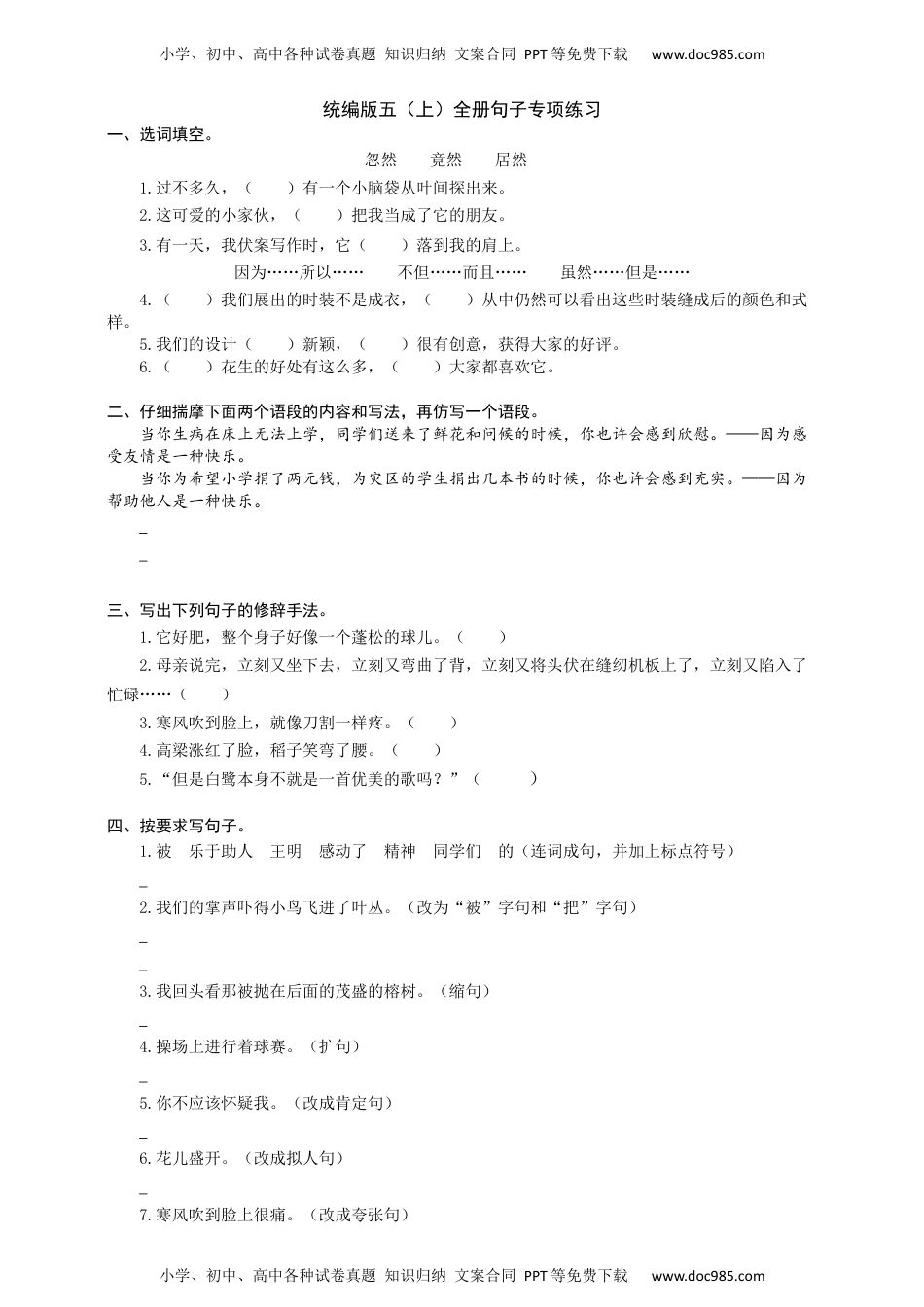 小学、初中、高中各种试卷真题知识归纳文案合同PPT等免费下载www.doc985.com小学、初中、高中各种试卷真题知识归纳文案合同PPT等免费下载www.doc985.com统编版五(上)全册句子专项练习一、选词填空。忽然竟然居然1.过不多久,()有一个小脑袋从叶间探出来。2.这可爱的小家伙,()把我当成了它的朋友。3.有一天,我伏案写作时,它()落到我的肩上。因为……所以……不但……而且……虽然……但是……4.()我们展出的时装不是成衣,()从中仍然可以看出这些时装缝成后的颜色和式样。5.我们的设计()新颖,()很有创意,获得大家的好评。6.()花生的好处有这么多,()大家都喜欢它。二、仔细揣摩下面两个语段的内容和写法,再仿写一个语段。当你生病在床上无法上学,同学们送来了鲜花和问候的时候,你也许会感到欣慰。——因为感受友情是一种快乐。当你为希望小学捐了两元钱,为灾区的学生捐出几本书的时候,你也许会感到充实。——因为帮助他人是一种快乐。三、写出下列句子的修辞手法。1.它好肥,整个身子好像一个蓬松的球儿。()2.母亲说完,立刻又坐下去,立刻又弯曲了背,立刻又将头伏在缝纫机板上了,立刻又陷入了忙碌……()3.寒风吹到脸上,就像刀割一样疼。()4.高梁涨红了脸,稻子笑弯了腰。()5.“但是白鹭本身不就是一首优美的歌吗?”()四、按要求写句子。1.被乐于助人王明感动了精神同学们的(连词成句,并加上标点符号)2.我们的掌声吓得小鸟飞进了叶丛。(改为“被”字句和“把”字句)3.我回头看那被抛在后面的茂盛的榕树。(缩句)4.操场上进行着球赛。(扩句)5.你不应该怀疑我。(改成肯定句)6.花儿盛开。(改成拟人句)7.寒风吹到脸上很痛。(改成夸张句)小学、初中、高中各种试卷真题知识归纳文案合同PPT等免费下载www.doc985.com小学、初中、高中各种试卷真题知识归纳文案合同PPT等免费下载www.doc985.com8.太阳照射着大地。(改成比喻句)9.班长乐于助人。同学们喜欢班长。(将两句话合并成一句话)五、修改病句。1.听了她的报告,受到了深刻的教育。2.最近,我们学校许多好人好事。3.天空乌云密布,阳光照得人睁不开眼睛。4.平静的河面上,有一只小船迎着风浪向岸边驶来。5.妈妈今天买回来很多水果,有苹果、香蕉、西红柿、梨、黄瓜等。六、把下面的句子填写完整,并写出句子的意思。1.我劝天公重抖擞,不拘一格降人才。2.美哉,我少年中国,!壮哉,我中国少年,!3.山一程,,身向榆关那畔行,。4.空山新雨后,。明月松间照,。5.三到之中,心到最急。七、乱句重组。()呀,校园里传来了朗朗的读书声。()有的把书放在身后,抬起头来背诵着,有的拿起书看上一眼,继续背下去。()清晨,太阳公公露出了笑脸,大地满目金光,充满生机。()新的一天开始了!()教室里,走廊上,公园旁,同学们有三五成群的,有独自踱步的,在朗读着、背诵着。()他们有的捧着书本,认真地朗读。参考答案一、选词填空。小学、初中、高中各种试卷真题知识归纳文案合同PPT等免费下载www.doc985.com小学、初中、高中各种试卷真题知识归纳文案合同PPT等免费下载www.doc985.com忽然竟然居然1.过不多久,(忽然)有一个小脑袋从叶间探出来。2.这可爱的小家伙,(竟然)把我当成了它的朋友。3.有一天,我伏案写作时,它(居然)落到我的肩上。因为……所以……不但……而且……虽然……但是……4.(虽然)我们展出的时装不是成衣,(但是)从中仍然可以看出这些时装缝成后的颜色和式样。5.我们的设计(不但)新颖,(而且)很有创意,获得大家的好评。6.(因为)花生的好处有这么多,(所以)大家都喜欢它。二、仔细揣摩下面两个语段的内容和写法,再仿写一个语段。当你生病在床上无法上学,同学们送来了鲜花和问候的时候,你也许会感到欣慰。——因为感受友情是一种快乐。当你为希望小学捐了两元钱,为灾区的学生捐出几本书的时候,你也许会感到充实。——因为帮助他人是一种快乐。示例:当你身处异乡孤立无助,有人向你伸出援助之手,你一也许会感到温暖。——因为摆脱困境是一种快乐。三、写出下列句子的修辞手法。1.它好肥,整个身子好像一个蓬松的球儿。...