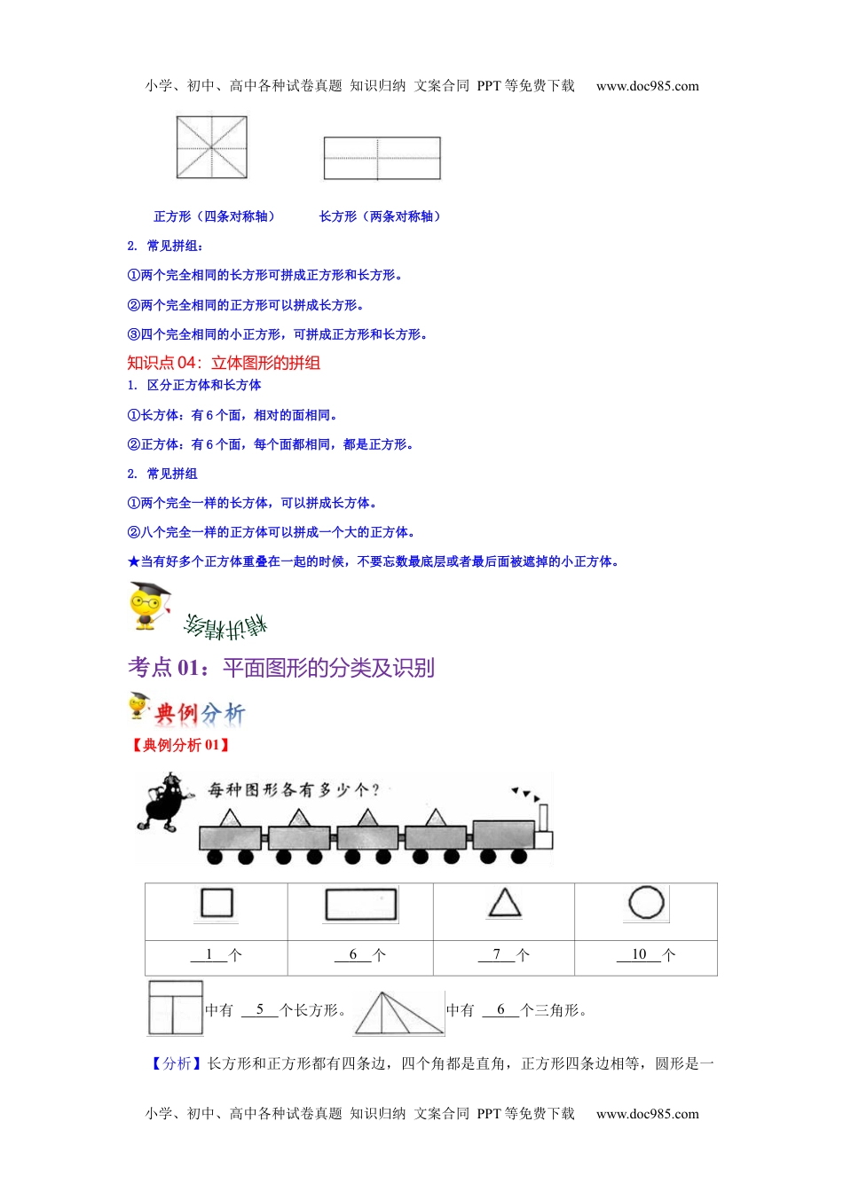 小学、初中、高中各种试卷真题知识归纳文案合同PPT等免费下载www.doc985.com小学、初中、高中各种试卷真题知识归纳文案合同PPT等免费下载www.doc985.com人教版数学一年级下册第一单元认识图形(二)知识点01:认识和会画知识点02:七巧板是由1个正方形、1个平行四边形、5个三角形组成的知识点03:平面图形的拼组1.区分正方形和长方形①长方形的特点:相对的两条长边相等,相对的两条短边相等。②正方形的特点:四条边长度都相等。小学、初中、高中各种试卷真题知识归纳文案合同PPT等免费下载www.doc985.com小学、初中、高中各种试卷真题知识归纳文案合同PPT等免费下载www.doc985.com正方形(四条对称轴)长方形(两条对称轴)2.常见拼组:①两个完全相同的长方形可拼成正方形和长方形。②两个完全相同的正方形可以拼成长方形。③四个完全相同的小正方形,可拼成正方形和长方形。知识点04:立体图形的拼组1.区分正方体和长方体①长方体:有6个面,相对的面相同。②正方体:有6个面,每个面都相同,都是正方形。2.常见拼组①两个完全一样的长方体,可以拼成长方体。②八个完全一样的正方体可以拼成一个大的正方体。★当有好多个正方体重叠在一起的时候,不要忘数最底层或者最后面被遮掉的小正方体。考点01:平面图形的分类及识别【典例分析01】1个6个7个10个中有5个长方形。中有6个三角形。【分析】长方形和正方形都有四条边,四个角都是直角,正方形四条边相等,圆形是一小学、初中、高中各种试卷真题知识归纳文案合同PPT等免费下载www.doc985.com小学、初中、高中各种试卷真题知识归纳文案合同PPT等免费下载www.doc985.com条曲线围成的,三角形是由三条边、三个角组成,平行四边形的对边平行且相等,据此解答。【解答】解:1个6个7个10个中有5个长方形。中有6个三角形。故答案为:1,6,7,10,5,6。【点评】本题考查了长方形、正方形、圆形及三角形的特征。【变式训练01】把各种图形的序号填在横线里。长方形①④正方形③三角形②⑥圆⑤【分析】根据长方形、正方形、三角形和圆的特征进行分类识别。【解答】解:把各种图形的序号填在横线里。长方形①④正方形③三角形②⑥圆⑤故答案为:①④,③,②⑥,⑤。【点评】本题考查了长方形、正方形、三角形和圆的特征,从而进行分类识别。【变式训练02】数一数,填一填。小学、初中、高中各种试卷真题知识归纳文案合同PPT等免费下载www.doc985.com小学、初中、高中各种试卷真题知识归纳文案合同PPT等免费下载www.doc985.com长方形正方形三角形圆平行四边形个数51242【分析】长方形和正方形都有四条边,四个角都是直角,正方形四条边相等,圆形是一条曲线围成的,三角形是由三条边、三个角组成,平行四边形的对边平行且相等,据此解答。【解答】解:长方形正方形三角形圆平行四边形个数51242【点评】本题考查了长方形、正方形、圆形及三角形的特征。【变式训练03】把下面的图形按要求分类。【分析】有些几何图形(如线段、角、三角形、长方形、圆等)的各个部分都在同一平面内,它们是平面图形;从实物中抽象出来的各种图形,统称为几何图形,几何图形是数学研究的主要对象之一,有些几何图形(如长方体、正方体、圆柱、圆锥、球等)的各个部分不都在同一平面内,它们是立体图形。【解答】解:如图:小学、初中、高中各种试卷真题知识归纳文案合同PPT等免费下载www.doc985.com小学、初中、高中各种试卷真题知识归纳文案合同PPT等免费下载www.doc985.com【点评】本题考查了长方形、正方形、圆形及三角形的特征。一.选择题(共5小题)1.用可以画出()A.B.C.【分析】圆柱的上下是由两个大小相等的圆和一个侧面组成。据此解答。【解答】解:用可以画出。故选:A。【点评】本题考查了圆柱的特征。2.教室黑板的表面是()。A.圆形B.长方形C.三角形【分析】根据长方形的特征选择即可。【解答】解:教室黑板的表面是长方形。故选:B。【点评】本题主要考查了平面图形的分类及识别,解题的关键是掌握长方形的特征。3.一套七巧板有()个三角形.A.3B.4C.5【分析】根据七巧板的基本知识,仔细观察,认真完成填空即可.小学、初中、...
