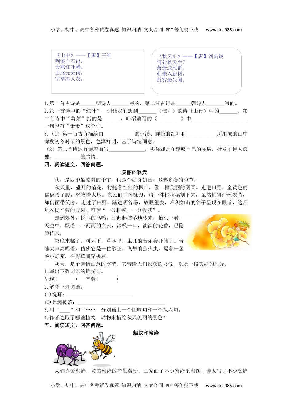 小学、初中、高中各种试卷真题知识归纳文案合同PPT等免费下载www.doc985.com小学、初中、高中各种试卷真题知识归纳文案合同PPT等免费下载www.doc985.com课外阅读归类专项训练(人教三上)一、阅读短文,回答问题。可爱的小溪清晨,小溪多美啊。溪水映照着灿烂的朝霞,像浮动的彩色绸带。我喜欢在溪边读书,清新湿润的空气滋润着我的喉咙,淙淙流水伴随着我的琅琅读书声。中午,我也要到溪边站上一会儿。微风吹来,水面上泛起层层鱼鳞波纹。倒映在溪中的景物,一会儿聚拢,一会儿散开,又聚拢,又散开……等到水波平静时,树儿、草儿的倒影更绿更新了。晚上,月影静静地躺在水底,星星也在水底眨着眼睛,云彩也高兴地跑到水里来了,给溪水增添了银色。小溪好像把我带进了一个神话世界里。1.根据短文内容把下列词语补充完整。()的朝霞()的空气2.根据短文内容填空。清晨“我”喜欢在小溪边(做什么),中午“我”也要。3.这篇短文是按什么顺序来写的,找出有关词语用“▲”标出。4.为什么说晚上的小溪好像把我带进了一个神话世界里呢?二、阅读短文,回答问题。美丽的晚霞红红的太阳落山了,它收起余晖,只剩下一个柔和、鲜艳的火球,颜色金黄透亮,就是技艺再高的画家也难以描绘。太阳的身影消失了,只剩下一片神奇的、美丽的云,令人想到仙境,想到梦幻的世界。我出神地望着,眼睛朦胧起来了,天空仿佛出现了一条金色的龙。它上游下窜,吞云吐雾,喷吐出鲜艳美丽的水花。随着云彩的移动,飞龙仿佛进入一片原始森林,看不见了。森林里一棵枝繁叶茂的大树上,飞起一只洁白如玉、顶冠赤色的仙鹤。鹤背上,坐着一个头顶光亮、胡子洁白的老头儿,他还拄着拐杖哩。这不是动画片《哪吒闹海》中的师傅—太乙真人吗?那么哪吒呢,他在哪里?哦,看到了,这不!一个坚实强健、系着红兜兜的小男孩,正张开双手,向他师傅飘去。我从幻境中看到了一个又一个好看的故事,一幅又一幅如画的美景。当我回到现实中来时,晚霞已经消失了。1.“我”在幻境里看到了哪些东西?______________________________________________________________________________2.判断下列句子是否正确。(1)文中的“出神”,表示看得很不认真的意思。()(2)“飞龙仿佛进入一片原始森林”中的“仿佛”一词改为“好像”句意不变。()(3)“神奇”就是“神秘”的意思。()3.把画线句子改写成不用问号的句子,不改变句意。______________________________________________________________________________4.你认为文中哪些词句描写十分生动传神,请写在下面,读一读,背一背。______________________________________________________________________________三、古诗对比阅读小学、初中、高中各种试卷真题知识归纳文案合同PPT等免费下载www.doc985.com小学、初中、高中各种试卷真题知识归纳文案合同PPT等免费下载www.doc985.com1.第一首古诗是______朝诗人_______写的,第二首古诗是______朝诗人_______写的。2.第一首诗中的“红叶”一词让我们想到_______(谁?)的诗《山行》中的_______。第二首诗中“萧萧”指的是_______,叶绍翁写的《_________》中______________________一句也有“萧萧”这个词。3.(1)第一首古诗描绘由____________的小溪、鲜艳的红叶和____________所组成的山中深秋初冬时节的景色,色泽鲜明,富于诗情画意。(2)第二首诗这首诗表面写______________,实际却是在感叹自己的际遇,抒发了诗人孤独、__________的感情。四、阅读短文,回答问题。美丽的秋天秋,是四季最凉爽的季节,也是个如诗如画、多彩多姿的季节。秋天里,盛开的菊花,衬托着红红的枫叶,像一幅美丽的图画。走进田野,金黄色的稻穗弯了腰,轻吻着大地。农民们手挥镰刀,将一株株稻穗割下来,虽然忙得汗流浃背,却仍面带笑容。走过了田野,踏进晒谷场,放眼望去,堆积如山的谷子呈现在眼前,这都是农民辛劳的成果。可谓“一分耕耘,一分收获”。走到郊外,悦耳的鸟鸣,正此起彼落地传来,抬头一看,天空中,飘着三三两两的白云,深吸一口,淡淡的花香,已隐隐传来。夜晚来临了,树木下,草丛里,虫儿的音乐会开始了。青...