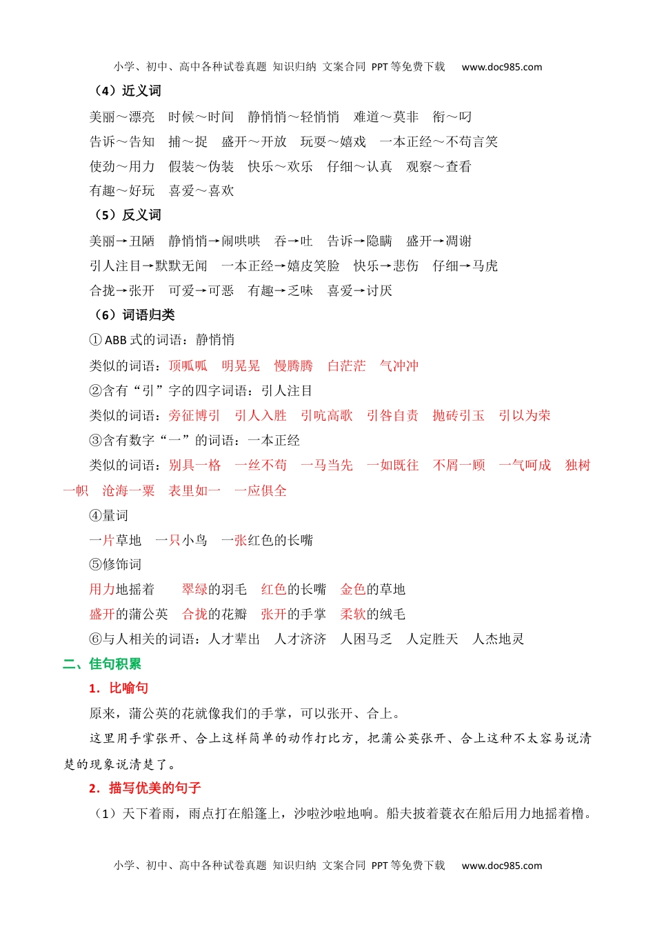 小学、初中、高中各种试卷真题知识归纳文案合同PPT等免费下载www.doc985.com小学、初中、高中各种试卷真题知识归纳文案合同PPT等免费下载www.doc985.com第五单元核心知识点一、字词盘点1.字(1)易读错的字悄(qiāo)鹦(yīng)鹉(wǔ)蒲(pú)耍(shuǎ)钓(diào)拢(lngǒ)英(yīng)欠(qiàn)啦(lā)(2)易写错的字搭:左右结构,左窄右宽。“合”的撇、捺要舒展开。翠:上下结构。“羽”没有钩。悄:左右结构,左窄右宽。“肖”写得瘦长一些。察:上下结构。“祭”右上部分为横撇、捺。趣:半包围结构。“走”的捺要长。蒲:上下结构。“艹”宽扁,“浦”左窄右宽。(3)多音字①必须掌握的多音字啦{lā(沙啦)la(来啦)②拓展积累的多音字漂{piào(漂亮)piāo(漂浮)piǎo(漂白)悄{qiāo(静悄悄)qiǎo(悄然)盛{shèng(盛开)chéng(盛满)2.词(1)必须掌握的词母亲外祖父雨点船夫用力船头羽毛翠绿静悄悄翠鸟捕鱼窗前蒲公英盛开玩耍绒毛假装哈欠钓鱼观察合拢手掌有趣喜爱(2)四字词语沙啦沙啦四季常绿又酸又软(3)成语一本正经引人注目小学、初中、高中各种试卷真题知识归纳文案合同PPT等免费下载www.doc985.com小学、初中、高中各种试卷真题知识归纳文案合同PPT等免费下载www.doc985.com(4)近义词美丽~漂亮时候~时间静悄悄~轻悄悄难道~莫非衔~叼告诉~告知捕~捉盛开~开放玩耍~嬉戏一本正经~不苟言笑使劲~用力假装~伪装快乐~欢乐仔细~认真观察~查看有趣~好玩喜爱~喜欢(5)反义词美丽→丑陋静悄悄→闹哄哄吞→吐告诉→隐瞒盛开→凋谢引人注目→默默无闻一本正经→嬉皮笑脸快乐→悲伤仔细→马虎合拢→张开可爱→可恶有趣→乏味喜爱→讨厌(6)词语归类①ABB式的词语:静悄悄类似的词语:顶呱呱明晃晃慢腾腾白茫茫气冲冲②含有“引”字的四字词语:引人注目类似的词语:旁征博引引人入胜引吭高歌引咎自责抛砖引玉引以为荣③含有数字“一”的词语:一本正经类似的词语:别具一格一丝不苟一马当先一如既往不屑一顾一气呵成独树一帜沧海一粟表里如一一应俱全④量词一片草地一只小鸟一张红色的长嘴⑤修饰词用力地摇着翠绿的羽毛红色的长嘴金色的草地盛开的蒲公英合拢的花瓣张开的手掌柔软的绒毛⑥与人相关的词语:人才辈出人才济济人困马乏人定胜天人杰地灵二、佳句积累1.比喻句原来,蒲公英的花就像我们的手掌,可以张开、合上。这里用手掌张开、合上这样简单的动作打比方,把蒲公英张开、合上这种不太容易说清楚的现象说清楚了。2.描写优美的句子(1)天下着雨,雨点打在船篷上,沙啦沙啦地响。船夫披着蓑衣在船后用力地摇着橹。小学、初中、高中各种试卷真题知识归纳文案合同PPT等免费下载www.doc985.com小学、初中、高中各种试卷真题知识归纳文案合同PPT等免费下载www.doc985.com“下着雨”“沙啦沙啦地响”“用力地摇着橹”几个词语把雨中行船的场景勾勒得生动形象,也展现了作者对雨的喜爱之情。(2)它的羽毛是翠绿的,翅膀带着一些蓝色,比鹦鹉还漂亮。它还有一张红色的长嘴。“羽毛”“翅膀”“长嘴”各有各的颜色,加在一起便凑成了一只活泼可爱的小鸟。这两句不仅写出了翠鸟的外表,也表达了作者对翠鸟的喜爱之情。3.重点句多么可爱的草地!多么有趣的蒲公英!从那时起,蒲公英成了我们最喜爱的一种花。这三句话把蒲公英当成人来写,表达了“我们”对蒲公英的喜爱之情。三、单元复习要点1.阅读并理解《搭船的鸟》中描写翠鸟外形和捕鱼动作的段落。2.掌握《金色的草地》中草地颜色的变化和原因。3.会写观察事物的作文。四、“1+X”阅读推荐篇目:[美]玛格丽特·华纳·莫利《种子的旅行》推荐理由:这本书介绍了关于生命生存和繁衍的问题。这本书充满田园风味,作者莫利通过细致入微的观察,让我们去发现种子旅行的秘密,感受生命的神奇。阅读方式:这本书图文结合,可以边阅读文字边想象画面,把诗一般的语言和清晰简洁的插图结合起来,感受生命的奥秘。