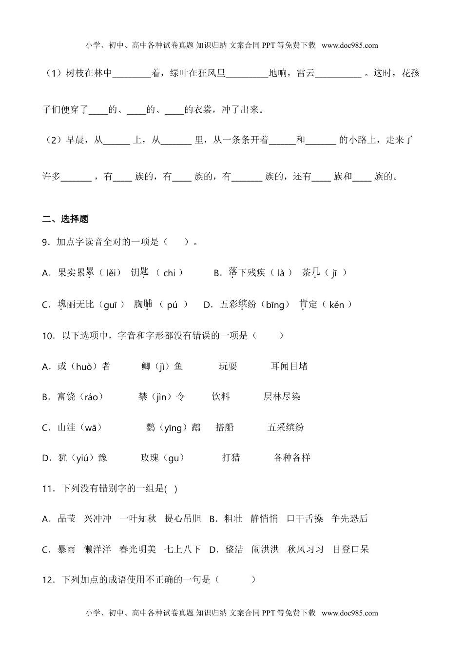 小学、初中、高中各种试卷真题知识归纳文案合同PPT等免费下载www.doc985.com【培优导航·高效练习】人教部编版三年级上册语文培优拔高一课一练2花的学校(同步练习)温馨提示:学业的精深和造诣源于勤奋和刻苦,高效精练是培优最佳途径!一、填空题1.看拼音写词语。shuāngbìkuánghuānfàngjiàhùxiāngtiàowǔ2.比较下面的字,再组词。碰(___________)猜(___________)舞(___________)扬(___________)湿(___________)情(___________)降(___________)杨(___________)3.查字典,填空。用部首查字法查找“刺”字,先查________部,再查________画;用音序查字法查找“刺”字,先查首字母________,再查音节________。“刺”在字典里的解释有:①用尖刻的话指摘、嘲笑;②尖锐像针的东西;③暗杀;④用有尖的东西穿进或杀伤。在“带刺的朋友”里,“刺”的意思是________;在“刺破”里,“刺”的意思是________;在“讽刺”里,“刺”的意思是________。(填序号)4.在括号里填上恰当的词语。(___________)地跳舞(___________)地响(___________)的碰撞小学、初中、高中各种试卷真题知识归纳文案合同PPT等免费下载www.doc985.com小学、初中、高中各种试卷真题知识归纳文案合同PPT等免费下载www.doc985.com(___________)的国旗(___________)的小鸟(___________)地走5.写出下列词语的近义词和反义词。近义词。急急忙忙(___________)狂欢(___________)能够(___________)反义词。喜欢(___________)合拢(___________)湿润(___________)6.按要求在句子中填上合适的词语(1)整天呆在这儿_____是没有收获的。(与“动物”有关的成语)(2)蒙汉情深何忍别,我们真是_____。(与“手”的词有关的成语)(3)为了_____纯净的镭,居里夫妇终日对成吨的工业废渣进行_____,艰苦的环境和简陋的条件_____出他们顽强的意志。(用“炼”字组成的词语填空,不得重复。)(4)我们都明白自信是通往成功必需的精神状态,_____要拥有一份真正的自信并非易事,_____我们都明白它比自负或还未奋斗就已灰心自卑来得更困难。(填关联词)7.在括号里填上合适的关联词语。⑴(_________)明天下雨,运动会(________)不开了。⑵(_______)妈妈给姐姐缠足,(_______)这件事深深地刺痛了孙中山的心。⑶(__________)黑黝黝的泥土,(________)是蒲公英的种子生根长叶的地方。8.根据课文内容填空。小学、初中、高中各种试卷真题知识归纳文案合同PPT等免费下载www.doc985.com小学、初中、高中各种试卷真题知识归纳文案合同PPT等免费下载www.doc985.com(1)树枝在林中__________着,绿叶在狂风里___________地响,雷云____________。这时,花孩子们便穿了_____的、_____的、_____的衣裳,冲了出来。(2)早晨,从_______上,从________里,从一条条开着_______和________的小路上,走来了许多________,有_____族的,有_____族的,有________族的,还有_____族和_____族的。二、选择题9.加点字读音全对的一项是()。A.果实累累(lěi)钥匙(chi)B.落下残疾(là)茶几(jī)C.瑰丽无比(uīɡ)胸脯(pú)D.五彩缤纷(bīnɡ)肯定(kěn)10.以下选项中,字音和字形都没有错误的一项是()A.或(huò)者鲫(jì)鱼玩耍耳闻目堵B.富饶(ráo)禁(jìn)令饮料层林尽染C.山洼(wā)鹦(yīng)鹉搭船五采缤纷D.犹(yiú)豫玫瑰(gu)打猎各种各样11.下列没有错别字的一组是()A.晶莹兴冲冲一叶知秋提心吊胆B.粗壮静悄悄口干舌操争先恐后C.暴雨懒洋洋春光明美七上八下D.整洁闹洪洪秋风习习目登口呆12.下列加点的成语使用不正确的一句是()小学、初中、高中各种试卷真题知识归纳文案合同PPT等免费下载www.doc985.com小学、初中、高中各种试卷真题知识归纳文案合同PPT等免费下载www.doc985.comA.每次看到他的时候,他都是一本正经地看着书。B.秋天的月湖公园金桂飘香,五谷丰登。C.今天吃苹果的时候,苹果里突然出现的一条虫子让我大吃一惊。D.这些并不引人注目的蒲公英,给我们带来了不少快乐。13.下列句子无语病的一项是(...