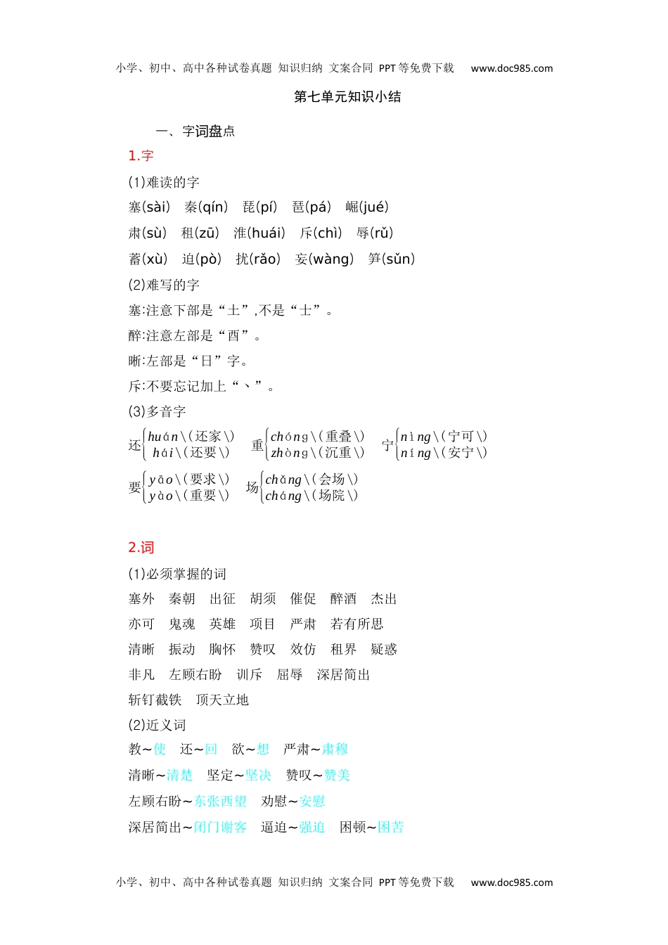 小学、初中、高中各种试卷真题知识归纳文案合同PPT等免费下载www.doc985.com小学、初中、高中各种试卷真题知识归纳文案合同PPT等免费下载www.doc985.com第七单元知识小结一、字点词盘1.字(1)难读的字塞(sài)秦(qín)琵(pí)琶(pá)崛(jué)肃(sù)租(zū)淮(huái)斥(chì)辱(rǔ)蓄(xù)迫(pò)扰(rǎo)妄(wàng)笋(sǔn)(2)难写的字塞:注意下部是“土”,不是“士”。醉:注意左部是“酉”。晰:左部是“日”字。斥:不要忘记加上“丶”。(3)多音字还{huán\(还家\)hái\(还要\)重{chónɡ\(重叠\)zhònɡ\(沉重\)宁{nìng\(宁可\)níng\(安宁\)要{yāo\(要求\)yào\(重要\)场{chǎng\(会场\)cháng\(场院\)2.词(1)必须掌握的词塞外秦朝出征胡须催促醉酒杰出亦可鬼魂英雄项目严肃若有所思清晰振动胸怀赞叹效仿租界疑惑非凡左顾右盼训斥屈辱深居简出斩钉截铁顶天立地(2)近义词教~使还~回欲~想严肃~肃穆清晰~清楚坚定~坚决赞叹~赞美左顾右盼~东张西望劝慰~安慰深居简出~闭门谢客逼迫~强迫困顿~困苦小学、初中、高中各种试卷真题知识归纳文案合同PPT等免费下载www.doc985.com小学、初中、高中各种试卷真题知识归纳文案合同PPT等免费下载www.doc985.com骚扰~打扰优厚~优越斩钉截铁~当机立断妄想~野心昔日~往日满目琳琅~林林总总探索~探究美妙~奇妙毫不犹豫~当机立断(3)反义词笑→哭生→死严肃→活泼清晰→模糊坚定→动摇疑惑不解→醍醐灌顶干干净净→邋邋遢遢困顿→安逸斩钉截铁→犹豫不决破旧→崭新毫不犹豫→犹豫不决温暖→寒冷(4)词语归类①AABC式的词语:翩翩归来类似的词语:头头是道念念不忘欣欣向荣斤斤计较②含有反义词的词语:顶天立地左顾右盼类似的词语:贪生怕死开天辟地取长补短口是心非有头无尾③形容十分热闹的词语:热闹非凡类似的词语:门庭若市热火朝天川流不息④形容人品格高尚的词语:精忠报国大义凛然视死如归铁面无私秉公执法英勇无畏刚正不阿⑤量词:一个严肃的问题一个星期天一团烈火一个艺术大师一场“大病”一个军医一排排高楼大厦一件件家用电器⑥动词:追寻信念追寻温暖追寻光明渡过难关惹出麻烦虚度生命⑦修饰词:严肃的问题沉郁的表情高超的艺术高兴地宣布清晰地回答坚定地回答金色的理想明媚的春光火红的太阳二、佳句累积1.比句喻这个问题像一团烈火一直燃烧在周恩来心中。把“”比作“烈火”问题,出了周恩的着和衷。写来对这个问题执热比句是考中的一常考考点喻试个,常的考形式有见查:(1)判是否是比句断喻,比句是把什比成什。这个喻么喻么(2)仿比句。写喻小学、初中、高中各种试卷真题知识归纳文案合同PPT等免费下载www.doc985.com小学、初中、高中各种试卷真题知识归纳文案合同PPT等免费下载www.doc985.com2.反句问醉卧沙场君莫笑,古来征战几人回?“醉沙”表出的不是豪放、朗、的感情卧场现来仅开兴奋,而且有着死如还视的勇。一句通反的手法归气这过问,出了的酷。写战争残3.感句叹为中华之崛起而读书!句用感的形式出了周恩宏大的志向这话叹写来,体了他强烈的精神。现爱国三、考点试热1.《古三首》常以空形式考句诗填查诗,常考字理解、句的查词诗释义,也考古的含会查诗义,以及人所表的思想感情。诗达2.《中之崛起而》以形式考文的理解为华读书会课内阅读查对课,也考会查托的手法。衬3.《梅芳蓄》以空形式考感知人物形象和精神。兰须会填查4.《延安,我把追》以空形式考文的主要容。你寻会填查课内四、“1+X”阅读推荐篇目《海军将领邓世昌》推荐理由甲午海战中,邓世昌那大义凛然的行为,那掷地有声的语言,那慷慨激昂的神情,无不深深地震撼了我们的心。文章按事情发展的顺序讲了甲午海战时,邓世昌带领“致远”舰英勇杀敌、誓与敌人同归于尽的场面。这是一篇故小学、初中、高中各种试卷真题知识归纳文案合同PPT等免费下载www.doc985.com小学、初中、高中各种试卷真题知识归纳文案合同PPT等免费下载www.doc985.com事性很强的课文,我们的心随激战的变化与发展而被牵动着,无限的敬意涌动心间。方法阅读一边读一边找出令你感动的情节,然后想一想从这些情节中你感受到人物怎样的品质。