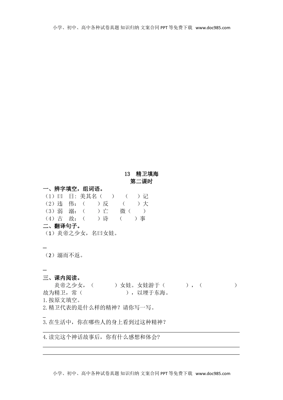 小学、初中、高中各种试卷真题知识归纳文案合同PPT等免费下载www.doc985.com13精卫填海第一课时一、在加点字的正确注音后的括号内打“√”。shǎo()rì()wéi()少女名曰故为精卫shào()yuē()wèi()二、看拼音,写词语。dìwánɡnìshuǐfǎnhuíxiántǔ()()()()xiándìfǎnnìyuē()接皇()往()沉()美其名()三、根据课文给写出下面词语的正确解释。少女:溺:故:堙:四、选择填空。1.这篇文言文出自于《》。A.《三字经》B.《山海经》2.精卫"衔西山之木石,以堙于东海"的原因是:()A.善良的精卫不希望再有人像自己那样被大海淹死。B.精卫不自量力,她只是在做无用功。3.“以堙于东海”的“堙”读音是:()A.yānB.yīn五、课文整体梳理。传说精卫因为而填海,用西山上的_____和____经过不懈的努力,最后终于填平了的故事。13精卫填海第一课时答案一、shàoyuēwéi二、帝王溺水返回衔土衔帝返溺曰三、小女儿。淹没。因此。填塞。四、1.B2.A3.B五、游泳溺亡树枝和石块东海小学、初中、高中各种试卷真题知识归纳文案合同PPT等免费下载www.doc985.com小学、初中、高中各种试卷真题知识归纳文案合同PPT等免费下载www.doc985.com13精卫填海第二课时一、辨字填空,组词语。(1)曰日:美其名()()记(2)违伟:()反()大(3)弱溺:()亡微()(4)古故:()诗()事二、翻译句子。(1)炎帝之少女,名曰女娃。(2)溺而不返。三、课内阅读。炎帝之少女,()女娃。女娃游于(),()故为精卫,常(),以堙于东海。1.按原文填空。2.精卫代表的是什么样的精神?请你写一写。3.在生活中,你在哪些人的身上看到过这种精神?4.读完这个神话故事后,你有什么感想和体会?小学、初中、高中各种试卷真题知识归纳文案合同PPT等免费下载www.doc985.com小学、初中、高中各种试卷真题知识归纳文案合同PPT等免费下载www.doc985.com13精卫填海第二课时答案一、(1)美其名曰;日记(2)违反;伟大(3)溺亡;微弱(4)古诗;故事二、(1)它原来是炎帝的小女儿名字叫女娃。(2)溺水而死未能回来。三、1.名曰东海溺而不返衔西山之木石2.不怕困难,与困难斗争到底的精神3.我在祖国的边疆战士身上看到了这种精神。4.示例:这个神话故事刻画了英勇顽强的精卫鸟的形象。反映了古代人民征服水患的强烈愿望和不畏艰苦、勤奋不止、不达目的、誓不罢休的精神。小学、初中、高中各种试卷真题知识归纳文案合同PPT等免费下载www.doc985.com