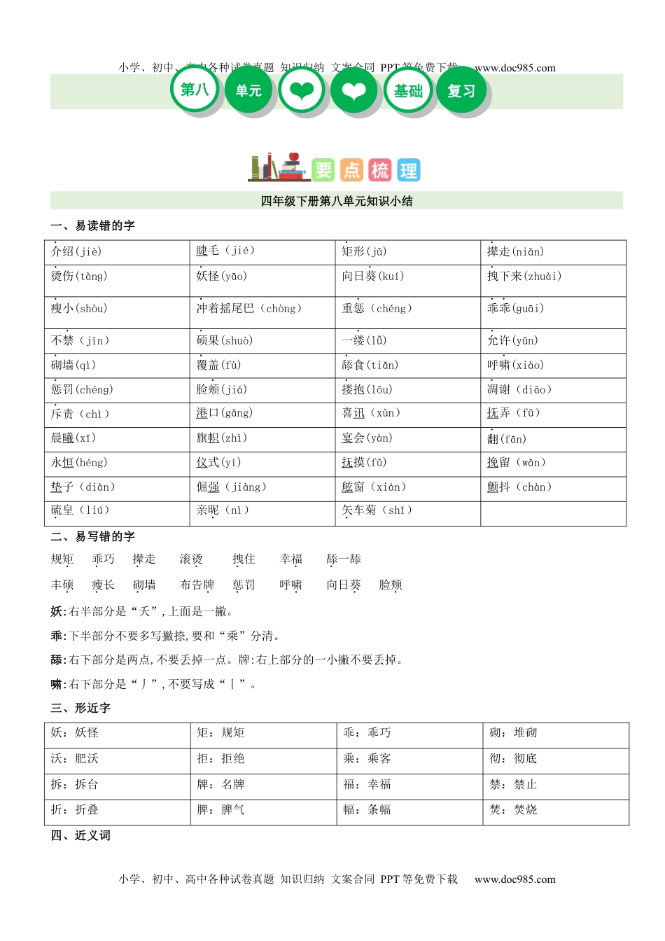 小学、初中、高中各种试卷真题知识归纳文案合同PPT等免费下载www.doc985.com小学、初中、高中各种试卷真题知识归纳文案合同PPT等免费下载www.doc985.com四年级下册第八单元知识小结一、易读错的字介绍(jiè)睫毛(jié)矩形(jǔ)撵走(niǎn)烫伤(tànɡ)妖怪(yāo)向日葵(kuí)拽下来(zhuài)瘦小(shòu)冲着摇尾巴(chòng)重惩(chéng)乖乖(ɡuāi)不禁(jīn)硕果(shuò)一缕(lǚ)允许(yǔn)砌墙(qì)覆盖(fù)舔食(tiǎn)呼啸(xiào)惩罚(chénɡ)脸颊(jiá)搂抱(lǒu)凋谢(diāo)斥责(chì)港口(gǎng)喜讯(xùn)抚弄(fǔ)晨曦(xī)旗帜(zhì)宴会(yàn)翻(fān)永恒(héng)仪式(yí)抚摸(fǔ)挽留(wǎn)垫子(diàn)倔强(jiàng)舷窗(xián)颤抖(chàn)硫皇(liú)亲昵(nì)矢车菊(shǐ)二、易写错的字规矩乖巧撵走滚烫拽住幸福舔一舔丰硕瘦长砌墙布告牌惩罚呼啸向日葵脸颊妖:右半部分是“夭”,上面是一撇。乖:下半部分不要多写撇捺,要和“乘”分清。舔:右下部分是两点,不要丢掉一点。牌:右上部分的一小撇不要丢掉。啸:右下部分是“丿”,不要写成“丨”。三、形近字妖:妖怪矩:规矩乖:乖巧砌:堆砌沃:肥沃拒:拒绝乘:乘客彻:彻底拆:拆台牌:名牌福:幸福禁:禁止折:折叠脾:脾气幅:条幅焚:焚烧四、近义词复习❤基础❤单元第八小学、初中、高中各种试卷真题知识归纳文案合同PPT等免费下载www.doc985.com小学、初中、高中各种试卷真题知识归纳文案合同PPT等免费下载www.doc985.com叱责→训斥柔嫩→娇嫩规矩→规则踪迹→踪影覆盖→遮盖禁止→不许凄凉→悲凉装饰→装扮呼啸→咆哮明亮→明朗奇异→奇怪漫长→长久闪烁→闪耀洁白→雪白沉静→安静茂盛→繁茂渇望→昐望凝望→凝视准许→允许平平常常→普普通通五、反义词幸福→痛苦幻想→现实禁止→允许奇特→普通凶狠→和善明亮→昏暗柔软→坚硬聪明→愚笨漫长→短暂燃烧→熄灭容易→困难沉静→喧闹新奇→普通茂盛→枯萎平平常常→超乎寻常六、词语归类AABB式词语:平平常常、堂堂正正、慢慢吞吞、指指点点、絮絮叨叨ABCC式的词语:可怜巴巴、怒气冲冲、白发苍苍、生机勃勃、议论纷纷ABAB式的词语:介绍介绍、参观参考、思考思考、观察观察又A又B式的词语:又大又圆、又白又胖、又瘦又长、又高又大七、常考句型:仿照例句,写一写其他季节。雪用他的白色大衣覆盖着青草,霜把所有的树枝涂成了银色。他们还请来北风同住。北风身上裹着皮衣,整天在花园里呼啸着。分析:例句把“雪、霜、北风”看作人,使用拟人的修辞,写出了冬天的景色。仿写句要用拟人的修辞,写出自己喜欢的季节。示例:春——春姑娘来了,春风拂过大地,唤醒了沉睡的小草。泉水唱着悦耳的歌,向前奔流。示例:夏——青蛙在荷叶上跳舞,蟋蟀在草丛中唱歌。他们还请来知了玩要,知了每天坐在树上为他们伴奏。单元课文知识梳理第26课:《宝葫芦的秘密》1.《宝葫芦的秘密》作者张天翼,体裁童话。主要讲了王葆听了奶奶讲宝葫芦的故事后着了迷,总想得到一个宝葫芦,并通过宝葫芦轻松地达到自己目标的故事。课文告诉我们“幸福要靠自己的双手来创造”的道理。我来给你们讲个《宝葫芦的秘密》的故事,那是我奶奶讲给我听的。有了宝葫芦要什么有什么,所以我要是有了一个宝葫芦,做算术题可就省心了,还能种出最好最好的向日葵。2.“我”想拥有一个宝葫芦,课文说了三个事例,第一件事:是遇到难题不知道如何解答时;第二件事:是“我”和同学们比赛种向日葵,但是“我”的向日葵长得又瘦又长时;第三件事:是“我”和科学小组的同学闹翻时。小学、初中、高中各种试卷真题知识归纳文案合同PPT等免费下载www.doc985.com小学、初中、高中各种试卷真题知识归纳文案合同PPT等免费下载www.doc985.com3.重点句子(1)“我不干,我怕烫。”我总是一面溜开,一面摆手。【动作描写】“一面撵我,一面招手”和“一面溜开,一面摆手”形象地写出了祖孙之间你追我赶的欢乐场景。(2)“那,我怕冷。”【语言描写】“我”和奶奶的对话表现了“我”的淘气、顽皮,以及祖孙之间浓浓的亲情。(3)我只好让步。不过我有一个条件:“你爱洗就让你洗。你...