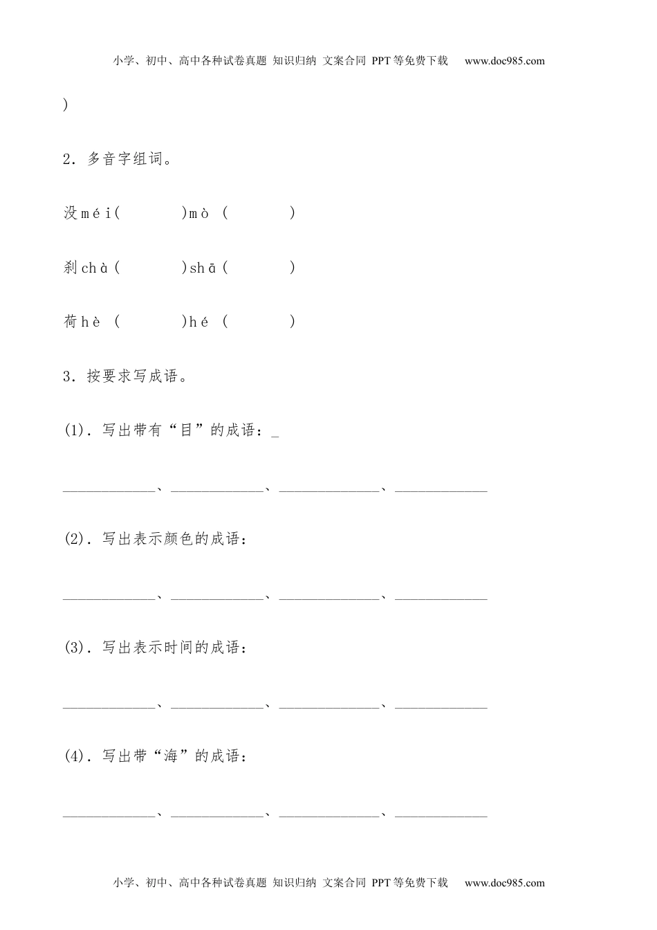 小学、初中、高中各种试卷真题知识归纳文案合同PPT等免费下载www.doc985.com小学、初中、高中各种试卷真题知识归纳文案合同PPT等免费下载www.doc985.com四年级语文下册《海上日出》课时练提高篇一、看拼音,写词语。fànwéiqīngjìngchànàkuòdàzhònghèduómùxiāngqiàncànlàndàitìnǔlì二、填空题1.写出下列词语的近义词或反义词。近义词:夺目——()灿烂——()伟大——()反义词:清静——()分辨——()努力——(小学、初中、高中各种试卷真题知识归纳文案合同PPT等免费下载www.doc985.com小学、初中、高中各种试卷真题知识归纳文案合同PPT等免费下载www.doc985.com)2.多音字组词。没méi()mò()刹chà()shā()荷hè()hé()3.按要求写成语。(1).写出带有“目”的成语:_____________、____________、_____________、____________(2).写出表示颜色的成语:____________、____________、_____________、____________(3).写出表示时间的成语:____________、____________、_____________、____________(4).写出带“海”的成语:____________、____________、_____________、____________小学、初中、高中各种试卷真题知识归纳文案合同PPT等免费下载www.doc985.com小学、初中、高中各种试卷真题知识归纳文案合同PPT等免费下载www.doc985.com4.我们一起参加叠词大聚会。ABB式的词语热辣辣毛_______光_______羞_______白______火_______金_______鼓_______阴______5.填同音字。xiāng()嵌()信音()()音kuò宽()()大()号辽()Chà()那()劲劈()()不多三、判断下列句子是否正确,在括号里对的打“√”,错的打“×”。1.《海上日出》这篇课文的作者是巴金写的。()2.“一刹那、一瞬间、眨眼间、猛然间”这些词语都是形容时间很快。()小学、初中、高中各种试卷真题知识归纳文案合同PPT等免费下载www.doc985.com小学、初中、高中各种试卷真题知识归纳文案合同PPT等免费下载www.doc985.com3.“在那个地方出现了太阳的小半边脸,红是真好,却没有亮光。”这句话运用了比喻的修辞方法。()4.这篇文章体现了日出的壮观景色,体现了作者对大自然的热爱和赞美之情。()四、语言表达下面是小丽和妈妈的对话,假如你是小丽,你该如何劝说妈妈?小丽:妈妈,老师让我们回家跟家长学做一道菜,您教教我吧!妈妈:你把功课做好就行啦,学做菜干什么?小丽:______________________________________________________五、信息匹配1.给下列加点字选择正确的解释。(填序号)搭:①支;架起②共同创造③搭配;配合④乘;坐(车、船、飞机等)(1)是坐我的摩托车去还是我们搭车去?()小学、初中、高中各种试卷真题知识归纳文案合同PPT等免费下载www.doc985.com小学、初中、高中各种试卷真题知识归纳文案合同PPT等免费下载www.doc985.com(2)奶奶给葡萄树的枝条搭了个架子。()(3)妈妈的围巾和大衣很搭调。()(4)我国和其他国家正在共同搭建交流合作的平台。()六、现代文阅读《海上日出》片段为了看日出,我常常早起。那时天还没有大亮,周围很静,只听见船里机器的声音。天空还是一片浅(蓝篮),很浅很浅的。转眼间,天水相接的地方出现了一道红霞。红霞的(犯范)围慢慢扩大,越来越亮。我知道太阳就要从天边升起来了,便目不转(晴睛)地望着那里。果然,过了一会儿,那里出现了太阳的小半边脸,红是红得很,却没有亮光。太阳像负着什么重担似的,慢慢儿,一纵一纵地,使劲儿向上升。到了最后,它终于冲破了云霞,完全跳出了海面,颜色真红得可爱。一刹那间,那深红的圆东西发出夺目的亮光,射得人眼睛发痛。它旁边的云也突然有了光彩。小学、初中、高中各种试卷真题知识归纳文案合同PPT等免费下载www.doc985.com小学、初中、高中各种试卷真题知识归纳文案合同PPT等免费下载www.doc985.com1.第2自然段中的括号选择正确的汉字,完全正确的一项是()A.蓝范睛B.篮犯晴C.蓝犯晴2.文中的第2第3自然段主要是写什么的,正确的一项是()A.描写多云和天边有黑云时日出的情景。B.描写晴朗天气的日出。C.描写下雨时的日出。3.“出现小半边脸”“努力上升”“冲破云霞”“完全跳...