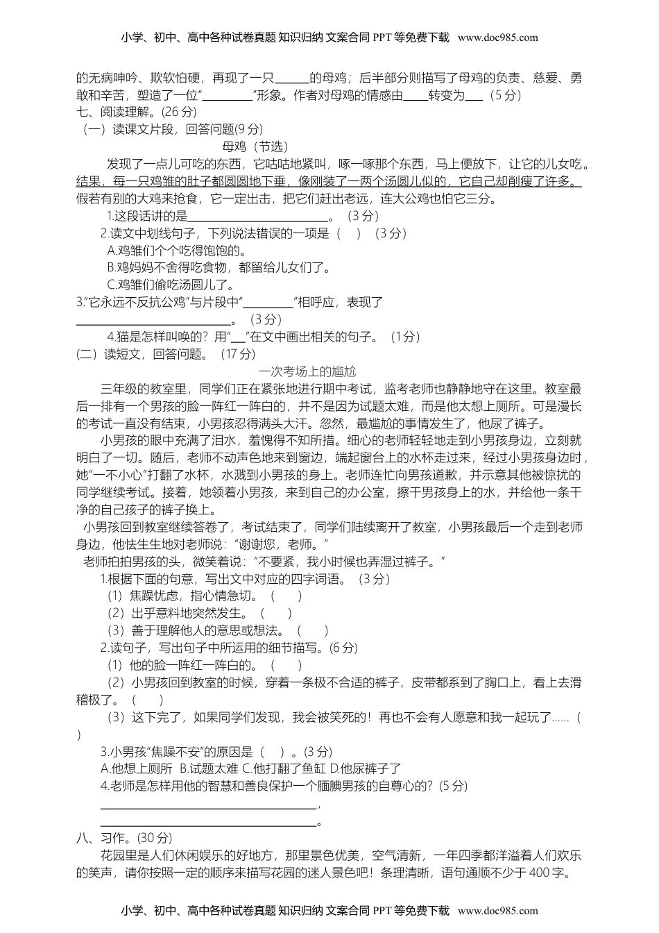 小学、初中、高中各种试卷真题知识归纳文案合同PPT等免费下载www.doc985.com下学期四年级期末检测卷(五)班级:姓名:满分:100分考试时间:60分钟题序一二三四五六七八总分得分一、下面字声母相同的一组是()。(2分)A.朴蔬徐浦哺B.稿嘹妖燥姥C.宴挽焉秆砚D.丫役愈遗予二、读拼音,写词语。(12分)péngdàténgluòjǐngjièmǐnjiéménglóngpìrú()()()()()()éjiǎofēngshuòhuāngmángmáoyánchāichúfùjìn()()()()()()三、写出下列加点词语的近义词(8分)1.小小的天窗会使你的想象锐利起来!()2.鸡,乡下人家照例总要养几只的。()3.刀落下来的地方,浪花迸发出一道耀眼的红光。()4.可是它又那么勇猛吗,不要说见着小虫和老鼠,就是遇到蛇也敢斗一斗。()四、按要求写句子。(8分)1.他肩上插着子弹袋,腰里背着手榴弹,背上还披着一杆长长的步枪。(修改病句)。2.他等待着。(扩写句句)。3.芦花鞋不是一般的好看,而是特别的好看。(用加点的词语写句子)。4.这不是很伟大的奇观吗?(仿写句子)。五、将下面的句子组成词意连贯的一段话,排列正确的一项是()。(4分)①踏着溪中的几块垫脚石过了溪,路旁有茅棚,住着一两家老百姓。②右手下坡去约十来步,就是一条小溪,水却不深。③小屋前面有一条小路,曲折向外,在松林中行约数百米,便“豁然开朗”。④还有很多美丽的骨牌草,有的还是很青翠,有的已经很枯黄。⑤左手上坡去是一条较为正式的路,隔路又是一片松林,坡头草长满了半人高的茅草。A.①④②③⑤B.③④②⑤①C.①⑤②④③D.③⑤④②①六、根据课文内容完成练习。(10分)1.《纳米技术就在我们身边》一文中作者列举了哪些纳米材料应用的例子?()(多选题)(2分)A.除臭B.清洁C.除菌D.防止火灾E.结实F.产生静电2.《巨人的花园》一文中巨人对待孩子们的态度有明显的变化。巨人先是,后来是与孩子们,作者在这里运用了的写法。3.《母鸡》一文以为线索,描写了作者对母鸡看法的变化,前半部分写母鸡小学、初中、高中各种试卷真题知识归纳文案合同PPT等免费下载www.doc985.com小学、初中、高中各种试卷真题知识归纳文案合同PPT等免费下载www.doc985.com的无病呻吟、欺软怕硬,再现了一只的母鸡;后半部分则描写了母鸡的负责、慈爱、勇敢和辛苦,塑造了一位“”形象。作者对母鸡的情感由转变为(5分)七、阅读理解。(26分)(一)读课文片段,回答问题(9分)母鸡(节选)发现了一点儿可吃的东西,它咕咕地紧叫,啄一啄那个东西,马上便放下,让它的儿女吃。结果,每一只鸡雏的肚子都圆圆地下垂,像刚装了一两个汤圆儿似的,它自己却削瘦了许多。假若有别的大鸡来抢食,它一定出击,把它们赶出老远,连大公鸡也怕它三分。1.这段话讲的是。(3分)2.读文中划线句子,下列说法错误的一项是()(3分)A.鸡雏们个个吃得饱饱的。B.鸡妈妈不舍得吃食物,都留给儿女们了。C.鸡雏们偷吃汤圆儿了。3.“它永远不反抗公鸡”与片段中“”相呼应,表现了。(3分)4.猫是怎样叫唤的?用“”在文中画出相关的句子。(1分)(二)读短文,回答问题。(17分)一次考场上的尴尬三年级的教室里,同学们正在紧张地进行期中考试,监考老师也静静地守在这里。教室最后一排有一个男孩的脸一阵红一阵白的,并不是因为试题太难,而是他太想上厕所。可是漫长的考试一直没有结束,小男孩忍得满头大汗。忽然,最尴尬的事情发生了,他尿了裤子。小男孩的眼中充满了泪水,羞愧得不知所措。细心的老师轻轻地走到小男孩身边,立刻就明白了一切。随后,老师不动声色地来到窗边,端起窗台上的水杯走过来,经过小男孩身边时,她“一不小心”打翻了水杯,水溅到小男孩的身上。老师连忙向男孩道歉,并示意其他被惊扰的同学继续考试。接着,她领着小男孩,来到自己的办公室,擦干男孩身上的水,并给他一条干净的自己孩子的裤子换上。小男孩回到教室继续答卷了,考试结束了,同学们陆续离开了教室,小男孩最后一个走到老师身边,他怯生生地对老师说:“谢谢您,老师。”老师拍拍男孩的头,微笑着说:“不要紧,我小时候也弄湿过裤子。”1.根据下面的句意,写出文...