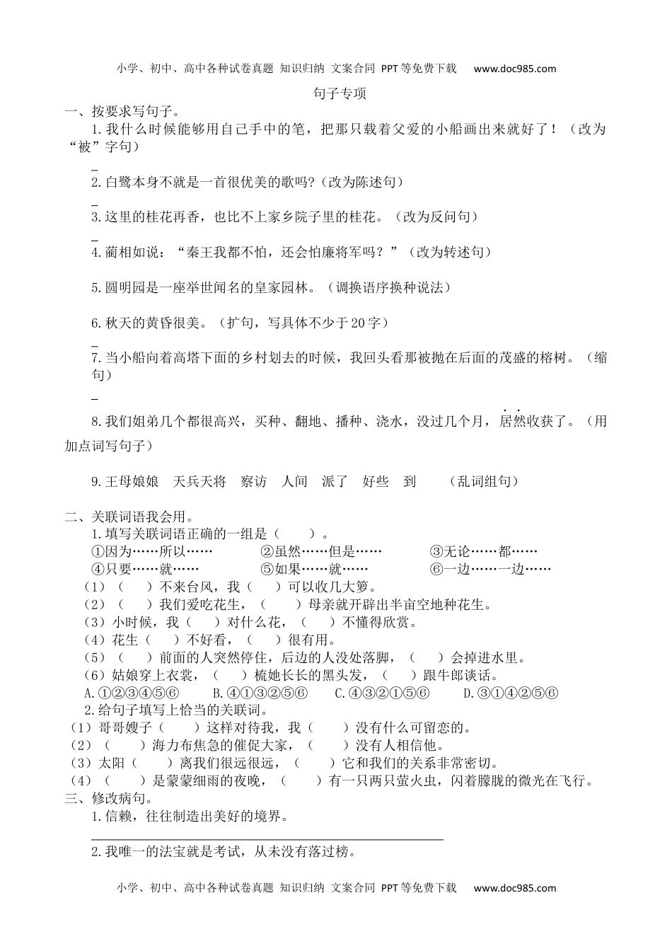 小学、初中、高中各种试卷真题知识归纳文案合同PPT等免费下载www.doc985.com小学、初中、高中各种试卷真题知识归纳文案合同PPT等免费下载www.doc985.com句子专项一、按要求写句子。1.我什么时候能够用自己手中的笔,把那只载着父爱的小船画出来就好了!(改为“被”字句)2.白鹭本身不就是一首很优美的歌吗?(改为陈述句)3.这里的桂花再香,也比不上家乡院子里的桂花。(改为反问句)4.蔺相如说:“秦王我都不怕,还会怕廉将军吗?”(改为转述句)5.圆明园是一座举世闻名的皇家园林。(调换语序换种说法)6.秋天的黄昏很美。(扩句,写具体不少于20字)7.当小船向着高塔下面的乡村划去的时候,我回头看那被抛在后面的茂盛的榕树。(缩句)8.我们姐弟几个都很高兴,买种、翻地、播种、浇水,没过几个月,居然收获了。(用加点词写句子)9.王母娘娘天兵天将察访人间派了好些到(乱词组句)二、关联词语我会用。1.填写关联词语正确的一组是()。①因为……所以……②虽然……但是……③无论……都……④只要……就……⑤如果……就……⑥一边……一边……(1)()不来台风,我()可以收几大箩。(2)()我们爱吃花生,()母亲就开辟出半亩空地种花生。(3)小时候,我()对什么花,()不懂得欣赏。(4)花生()不好看,()很有用。(5)()前面的人突然停住,后边的人没处落脚,()会掉进水里。(6)姑娘穿上衣裳,()梳她长长的黑头发,()跟牛郎谈话。A.①②③④⑤⑥B.④①③②⑤⑥C.④③②①⑤⑥D.③①④②⑤⑥2.给句子填写上恰当的关联词。(1)哥哥嫂子()这样对待我,我()没有什么可留恋的。(2)()海力布焦急的催促大家,()没有人相信他。(3)太阳()离我们很远很远,()它和我们的关系非常密切。(4)()是蒙蒙细雨的夜晚,()有一只两只萤火虫,闪着朦胧的微光在飞行。三、修改病句。1.信赖,往往制造出美好的境界。2.我唯一的法宝就是考试,从未没有落过榜。小学、初中、高中各种试卷真题知识归纳文案合同PPT等免费下载www.doc985.com小学、初中、高中各种试卷真题知识归纳文案合同PPT等免费下载www.doc985.com3.又见到了爷爷养的那只小狗。4.云层里小水滴越聚越多,就变成雨飘下来。5.我估计太阳表面温度一定有六千摄氏度。四、修辞手法大比拼。1.夸张句。(1)读了“桂花开得最茂盛时,不说香闻十里,至少前后左右十几家邻居,没有不浸在桂花香里的。”这句话,让我们想到的夸张句是:(2)下列哪些诗句中运用了夸张的修辞手法?()A.飞流直下三千尺,疑是银河落九天。B.不知细叶谁裁出,二月春风似剪刀。C.燕山雪花大如席,片片吹落轩辕台。D.忽如一夜春风来,千树万树梨花开。2.回忆课文补充作家笔下的动物。①白鹭是一首,一首。②珍珠鸟好肥,整个身子好像。③珍珠鸟竞趴在我的肩头睡着了,盖住眸子,刚好被胸脯上盖住。④松鼠面容,眼睛,身体,四肢,非常敏捷,非常。3.读句子,判断修辞手法。(1)桂花树的样子笨笨的,不像梅树那样有姿态。()(2)这么远,箭哪能射得到呢?()五、根据句意判断所运用的说明方法,并运用这种说明方法仿写一句话。A.列数字B.打比方C.作比较1.它的果实埋在地里,不像桃子、石榴、苹果那样,把鲜红嫩绿的果实高高地挂在枝头上,使人一见就生爱慕之心。()我仿写的句子是:2.有的流星体运动的瞬时速度能达到二十五万千米每小时,是火箭运动速度的六倍多。()我仿写的句子是:3.太阳会发光,会发热,是个大火球。()我仿写的句子是:六、看图完成练习。1.看到这幅图,让我想到了民间故事《》,每年的农历月日,也就是人们常说了节,这一天是和在(地方)相见的日子。唐朝的林杰写过有关的诗,诗句是,。2.左边这幅图中的人物小学、初中、高中各种试卷真题知识归纳文案合同PPT等免费下载www.doc985.com小学、初中、高中各种试卷真题知识归纳文案合同PPT等免费下载www.doc985.com(从左到右)是和,他们都是国人,故事发生在时期,这个故事让我想到的成语是,这个故事出自《》。七、品析句子。1.回忆课文《桂花雨》,对母亲说:“这里的桂花再香,也比不上家乡院子里的桂花。”这句话理解正确的是()。...