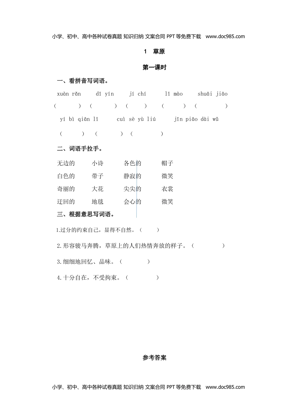 小学、初中、高中各种试卷真题知识归纳文案合同PPT等免费下载www.doc985.com1草原第一课时一、看拼音写词语。xuànrǎndīyínjíchílǐmàoshuāijiāo()()()()()yíbìqiānlǐcuìsèyùliújīnpiāodàiwǔ()()()二、词语手拉手。无边的小诗各色的帽子白色的带子静寂的微笑奇丽的大花尖尖的衣裳迂回的地毯会心的微笑三、根据意思写词语。1.过分的约束自己,显得不自然。()2.形容骏马奔腾,草原上的人们热情奔放的样子。()3.细细地回忆、品味。()4.十分自在,不受拘束。()参考答案小学、初中、高中各种试卷真题知识归纳文案合同PPT等免费下载www.doc985.com小学、初中、高中各种试卷真题知识归纳文案合同PPT等免费下载www.doc985.com第一课时一、渲染低吟疾驰礼貌摔跤一碧千里翠色欲流襟飘带舞二、无边的绿毯白色的大花奇丽的小诗迂回的带子各色的衣裳静寂的草原尖尖的帽子会心的微笑三1.拘束2.群马疾驰3.回味4.大方1草原小学、初中、高中各种试卷真题知识归纳文案合同PPT等免费下载www.doc985.com小学、初中、高中各种试卷真题知识归纳文案合同PPT等免费下载www.doc985.com第二课时一、辨字组词。镜()蹄()羞()裳()境()啼()差()赏()二、选择恰当的关联词填空。那么…那么…既…又…不管…总…1.这种境界,()使人惊叹,()叫人舒服,()愿久立四望,()想坐下低吟一首奇丽的小诗。2.()唱的是什么,听者()会露出会心的微笑。3.那里的天比别处更可爱,空气是()清鲜,天空是()明朗。三、读句子,根据提示完成练习。这次,我看到了草原。那里的天比别处的更可爱,空气是那么(新鲜清鲜),天空是那么(晴朗明朗),使我总想高歌一曲,表示我满心的愉快。在天底下,一碧千里,而并不茫茫。四面都有小丘,平地是绿的,小丘也是绿的。羊群一会儿上了小丘,一会儿又下来,走在哪里都像给无边的绿毯绣上了白色的大花。那些小丘的线条是那么(柔美柔软),就像只用绿色渲染,不用墨线勾勒的中国画那样,到处翠色欲流,轻轻流入云际。这种境界,既使人(惊叹惊讶),又叫人舒服,既愿久立四望,又想坐下低吟一首奇丽的小诗。在这境界里,连骏马与大牛都有时候静立不动,好像回味着草原的无限乐趣。1用“√”在文段中的括号里选择恰当的词。小学、初中、高中各种试卷真题知识归纳文案合同PPT等免费下载www.doc985.com小学、初中、高中各种试卷真题知识归纳文案合同PPT等免费下载www.doc985.com2.这段话作者是按从()到()顺序写的。这段话写出了草原()的特点,作者用了()、()、()不同的词来描写草原的色彩。参考答案第二课时一、镜子环境马蹄啼叫羞涩差不多衣裳欣赏二、1.既…又…2.不管…总…3.那么…那么…三、1.清鲜明朗柔美惊叹2.天空天底下辽阔碧绿一碧千里翠色欲流绿色渲染。小学、初中、高中各种试卷真题知识归纳文案合同PPT等免费下载www.doc985.com