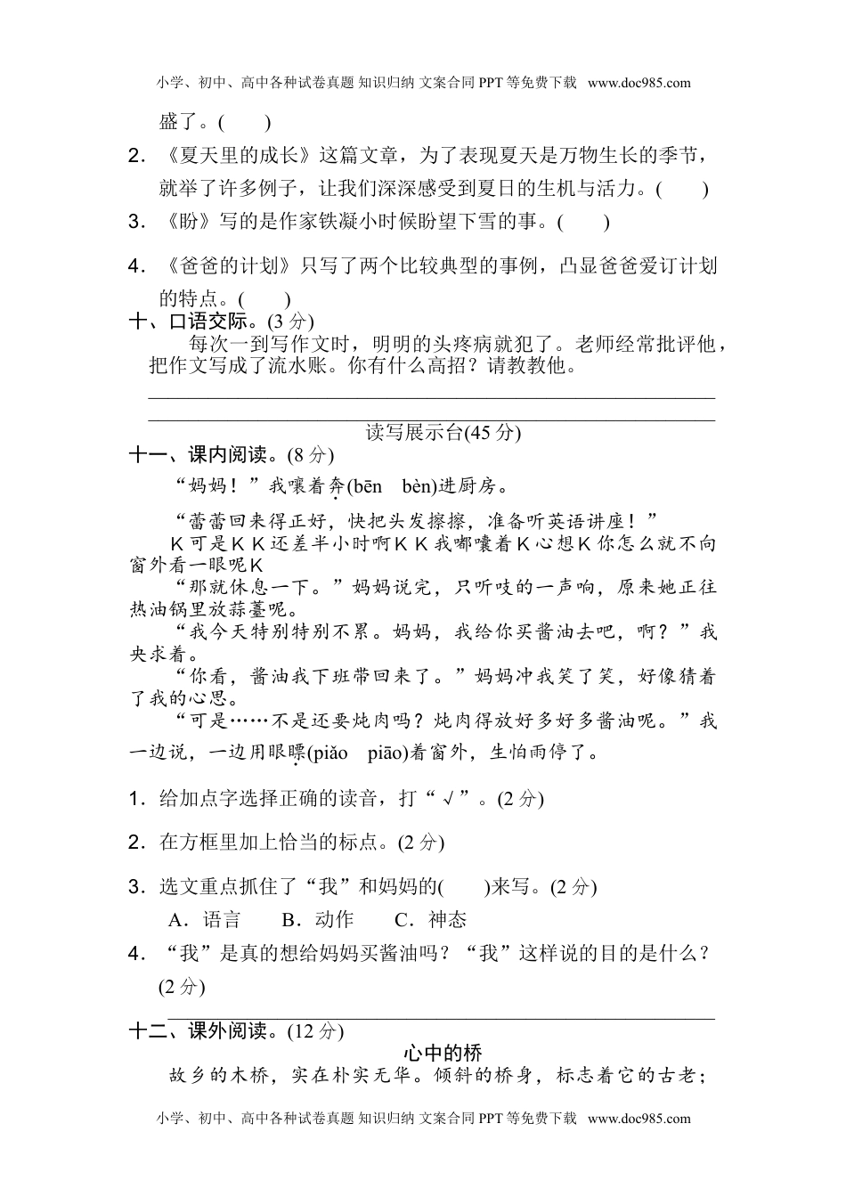 小学、初中、高中各种试卷真题知识归纳文案合同PPT等免费下载www.doc985.com第五单元达标检测卷基础百花园(40分)一、用“√”给下列加点字选择正确的读音。(3分)烽(fēngfēn)火山坳(āoào)腥(xīnxīng)味焖(mēnmèn)上痱(fēifèi)子铁轨(guǐguí)二、读拼音写词语。(8分)pùbùyànyǔshēnsuōjiàngyóu()()()()zuǐchúnlóutīzhàngpengwǎlán()()()()三、查字典填空。(6分)1.“缝”用音序查字法应先查大写字母(),再查音节();用部首查字法应先查部首(),再查()画。在“缝隙”一词中,“缝”读();在“缝衣服”一词中,“缝”的读音是()。(3分)2.下面是“缝”的字义,请选择恰当的填入相应的括号里。(3分)A.用针线连缀。B.缝隙,裂开或自然露出的窄长口子。C.物体接合的地方。(1)天衣无缝()(2)缝补()(3)裂缝()四、选字组词。(6分)[苞饱胞]同()吃()花()[苔抬治]()头()病()藓[攘嚷襄]()阳叫()()除[袖抽油]香()()筒()查五、读一读,连一连。(8分)六、根据意思写成语。(4分)1.形容环境非常清洁。()2.形容喜悦或得意。()3.形容很满。()小学、初中、高中各种试卷真题知识归纳文案合同PPT等免费下载www.doc985.com小学、初中、高中各种试卷真题知识归纳文案合同PPT等免费下载www.doc985.com4.理由充分,因而说话做事有气势或心里无愧,无所畏惧。()七、按要求写句子。(5分)1.这是一个在北方山区常见的小站。(缩句)________________________________________________________2.我被搞得晕头转向。(改为比喻句)________________________________________________________3.我打开一看,是淡绿色的、透明的一件新雨衣。(修改病句)________________________________________________________4.路边的小杨树忽然沙啦啦地响。(改为拟人句)________________________________________________________5.我兴奋地仰起头,甩打着书包就大步跑进了楼门。(用一连串的动词写句子)________________________________________________________主题训练营(15分)八、初试身手。(8分)下面是一位同学围绕“体育迷老爸”这个题目选择的材料,请判断一下,哪些材料可以用来表达中心意思,在后面的括号里打“√”。1.喜欢看电视的体育频道栏目。()2.双休日喜欢登山、骑车,常参加俱乐部骑行活动。()3.没事的时候喜欢唱歌。()4.到体育馆观看篮球比赛、羽毛球比赛等,一场也不落下。()5.是单位里的运动健将,经常代表单位参加市里的体育比赛。()6.每天看书一小时。()7.边吃饭边教育我要专心学习。()九、理解课本内容,判断对错,对的打“√”,错的打“×”。(4分)1.写文章必须先确立中心,好像树木一样,它的根深,枝叶也就茂小学、初中、高中各种试卷真题知识归纳文案合同PPT等免费下载www.doc985.com小学、初中、高中各种试卷真题知识归纳文案合同PPT等免费下载www.doc985.com盛了。()2.《夏天里的成长》这篇文章,为了表现夏天是万物生长的季节,就举了许多例子,让我们深深感受到夏日的生机与活力。()3.《盼》写的是作家铁凝小时候盼望下雪的事。()4.《爸爸的计划》只写了两个比较典型的事例,凸显爸爸爱订计划的特点。()十、口语交际。(3分)每次一到写作文时,明明的头疼病就犯了。老师经常批评他,把作文写成了流水账。你有什么高招?请教教他。__________________________________________________________________________________________________________________读写展示台(45分)十一、课内阅读。(8分)“妈妈!”我嚷着奔(bēnbèn)进厨房。“蕾蕾回来得正好,快把头发擦擦,准备听英语讲座!”K可是KK还差半小时啊KK我嘟囔着K心想K你怎么就不向窗外看一眼呢K“那就休息一下。”妈妈说完,只听吱的一声响,原来她正往热油锅里放蒜薹呢。“我今天特别特别不累。妈妈,我给你买酱油去吧,啊?”我央求着。“你看,酱油我下班带回来了。”妈妈冲我笑了笑,好像猜着了我的心思。“可是……不是还要炖肉吗?炖肉得放好多好多酱油呢。”我一边说,一边用眼瞟(piǎopiāo)着窗外,生怕雨停了。1.给加点字选择正确的读音,打“√”。(2分)2.在方框里加上恰当的...