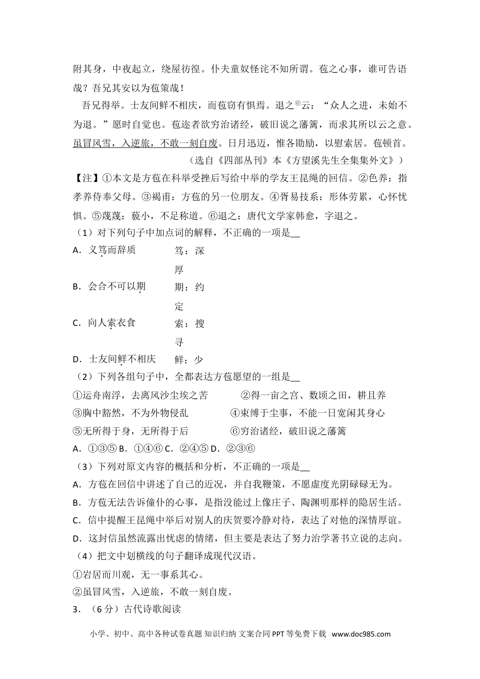 2015年福建省高考语文试卷一、古代诗文阅读(27分)1.(6分)默写常见的名句名篇中的空缺部分。(1)入则无法家拂士,,国恒亡。(孟子《生于忧患,死于安乐》)(2)师者,。(韩愈《师说》)(3)宁溘死以流亡兮,。(屈原《离骚》)(4),长河落日圆。(王维《使至塞上》)(5),家书抵万金。(杜甫《春望》)(6)夕阳西下,。(马致远《天净沙•秋思》)二、文言文阅读2.(15分)阅读下面的文言文,完成下列各题。与王昆绳书①[清]方苞苞顿首:自斋中交手,未得再见。接手书,义笃而辞质。虽古之为交者,岂有过哉!苞从事朋游间近十年,心事臭味相同,知其深处,有如吾兄者乎!出都门,运舟南浮,去离风沙尘埃之苦,耳目开涤;又违膝下色养②久,得归省视,颇忘其身之贱贫。独念二三友朋,乖隔异地,会合不可以期,梦中时时见兄与褐甫③辈抵掌今故,酣嬉笑呼,觉而怛然增离索之恨。苞以十月下旬至家,留八日,便饥驱宣、歙,间入泾河。路见左右高峰刺天,水清泠见底,崖岩参差万叠,风云往还,古木、奇藤、修篁郁盘有生气。聚落居人,貌甚闲暇。因念古者庄周、陶潜之徒,逍遥纵脱,岩居而川观,无一事系其心。天地日月山川之精,浸灌胸臆,以郁其奇,故其文章皆肖以出。使苞于此间得一亩之宫、数顷之田,耕且养,穷经而著书,胸中豁然,不为外物侵乱,其所成就,未必遂后于古人。乃终岁仆仆,向人索衣食,或山行水宿,颠顿怵迫,或胥易技系④,束缚于尘事,不能一日宽闲其身心。君子固穷,不畏其身辛苦憔悴,诚恐神智滑昏,学殖荒落,抱无穷之志而卒事不成也。苞之生二十六年矣。使蹉跎昏忽,常如既往,则由此而四十、五十,岂有难哉!无所得于身,无所得于后,是将与众人同其蔑蔑⑤也。每念兹事,如沉疴之小学、初中、高中各种试卷真题知识归纳文案合同PPT等免费下载www.doc985.com附其身,中夜起立,绕屋彷徨。仆夫童奴怪诧不知所谓。苞之心事,谁可告语哉?吾兄其安以为苞策哉!吾兄得举。士友间鲜不相庆,而苞窃有惧焉。退之⑥云:“众人之进,未始不为退。”愿时自觉也。苞迩者欲穷治诸经,破旧说之藩篱,而求其所以云之意。虽冒风雪,入逆旅,不敢一刻自废。日月迅迈,惟各勖励,以慰索居。苞顿首。(选自《四部丛刊》本《方望溪先生全集集外文》)【注】①本文是方苞在科举受挫后写给中举的学友王昆绳的回信。②色养:指孝养侍奉父母。③褐甫:方苞的另一位朋友。④胥易技系:形体劳累,心怀忧惧。⑤蔑蔑:藐小,不足称道。⑥退之:唐代文学家韩愈,字退之。(1)对下列句子中加点词的解释,不正确的一项是A.义笃而辞质笃:深厚B.会合不可以期期:约定C.向人索衣食索:搜寻D.士友间鲜不相庆鲜:少(2)下列各组句子中,全都表达方苞愿望的一组是①运舟南浮,去离风沙尘埃之苦②得一亩之宫、数顷之田,耕且养③胸中豁然,不为外物侵乱④束缚于尘事,不能一日宽闲其身心⑤无所得于身,无所得于后⑥穷治诸经,破旧说之藩篱A.①③⑤B.①④⑥C.②④⑤D.②③⑥(3)下列对原文内容的概括和分析,不正确的一项是A.方苞在回信中讲述了自己的近况,并自我鞭策,不愿虚度光阴碌碌无为。B.方苞无法告诉僮仆的心事,是指没能过上像庄子、陶渊明那样的隐居生活。C.信中提醒王昆绳中举后对别人的庆贺要冷静对待,表达了对他的深情厚谊。D.这封信虽然流露出忧虑的情绪,但主要是表达了努力治学著书立说的志向。(4)把文中划横线的句子翻译成现代汉语。①岩居而川观,无一事系其心。②虽冒风雪,入逆旅,不敢一刻自废。3.(6分)古代诗歌阅读小学、初中、高中各种试卷真题知识归纳文案合同PPT等免费下载www.doc985.com阅读下面的诗歌,完成后面的题目。秋夜纪怀【宋】陆游北斗垂莽苍,明河①浮太清②。风林一叶下,露草百虫鸣。病入新凉减,诗从半睡成。还思散关③路,炬火驿前迎。④(选自《四库全书》本《放翁诗选》)【注】①眀河:银河。②太清:指天空。③散关:即大散关。④炬火驿前迎:举着火把到驿馆前迎接。(1)第二联写景精细,请简要分析。(2)三、四两联抒发了诗人怎样的情怀?请简要分析。二、文学名著、文化经典阅读(12分)4.(6分)文学名著阅读...