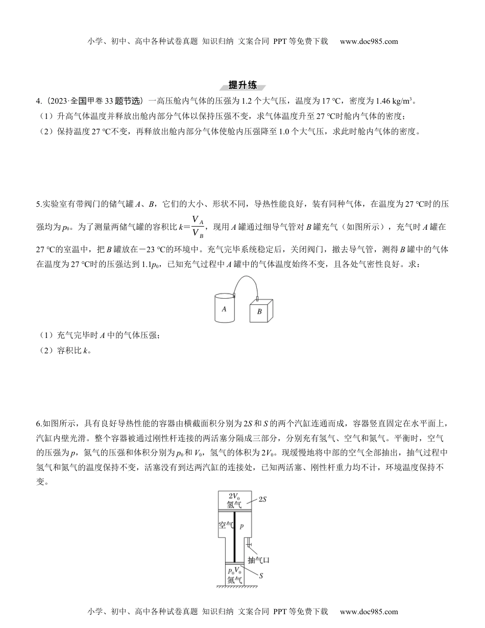 小学、初中、高中各种试卷真题知识归纳文案合同PPT等免费下载www.doc985.com小学、初中、高中各种试卷真题知识归纳文案合同PPT等免费下载www.doc985.com素养提升25气体状态变化的四类变质量问题1.“早穿皮袄午穿纱,抱着火炉吃西瓜”形容的是我国新疆吐鲁番市昼夜温差大的自然现象,利用这一特点可以制作品质优良的葡萄干。现有一葡萄晾房四壁开孔,如图,房间内晚上温度为7℃,中午温度升为37℃,假设中午大气压强比晚上减少7%,则中午房间内逸出的空气质量与晚上房间内空气质量之比为()A.425B.421C.331D.3282.现从一体积不变的容器中抽气,假设温度保持不变,每一次抽气后,容器内气体的压强均减小到原来的34,要使容器内剩余气体的压强减为原来的2431024,抽气次数应为()A.2次B.3次C.4次D.5次3.如图所示,蹦蹦球是一种训练平衡的健身玩具,蹦蹦球上未站人时,球内气体的体积为2L、压强为1.2atm,此时周围的环境温度为-3℃。(1)某人站在此蹦蹦球上保持平衡不动时,球内体积变为1.2L,球内气体可看成理想气体且温度保持不变,则此时蹦蹦球内气体压强为多少?(2)当把此蹦蹦球从-3℃的室外拿到27℃的室内,放置足够长时间后,用充气筒充气,充气筒每次充入体积为0.4L,压强为1atm的室内空气(可视为理想气体),不考虑整个过程中球体积的变化和充气过程中的温度变化,要使球内压强达到3atm,至少需要充气几次?小学、初中、高中各种试卷真题知识归纳文案合同PPT等免费下载www.doc985.com小学、初中、高中各种试卷真题知识归纳文案合同PPT等免费下载www.doc985.com4.(2023·全甲卷国33题节选)一高压舱内气体的压强为1.2个大气压,温度为17℃,密度为1.46kg/m3。(1)升高气体温度并释放出舱内部分气体以保持压强不变,求气体温度升至27℃时舱内气体的密度;(2)保持温度27℃不变,再释放出舱内部分气体使舱内压强降至1.0个大气压,求此时舱内气体的密度。5.实验室有带阀门的储气罐A、B,它们的大小、形状不同,导热性能良好,装有同种气体,在温度为27℃时的压强均为p0。为了测量两储气罐的容积比k=VAVB,现用A罐通过细导气管对B罐充气(如图所示),充气时A罐在27℃的室温中,把B罐放在-23℃的环境中。充气完毕系统稳定后,关闭阀门,撤去导气管,测得B罐中的气体在温度为27℃时的压强达到1.1p0,已知充气过程中A罐中的气体温度始终不变,且各处气密性良好。求:(1)充气完毕时A中的气体压强;(2)容积比k。6.如图所示,具有良好导热性能的容器由横截面积分别为2S和S的两个汽缸连通而成,容器竖直固定在水平面上,汽缸内壁光滑。整个容器被通过刚性杆连接的两活塞分隔成三部分,分别充有氢气、空气和氮气。平衡时,空气的压强为p,氮气的压强和体积分别为p0和V0,氢气的体积为2V0。现缓慢地将中部的空气全部抽出,抽气过程中氢气和氮气的温度保持不变,活塞没有到达两汽缸的连接处,已知两活塞、刚性杆重力均不计,环境温度保持不变。小学、初中、高中各种试卷真题知识归纳文案合同PPT等免费下载www.doc985.com小学、初中、高中各种试卷真题知识归纳文案合同PPT等免费下载www.doc985.com(1)比较抽气前氢气分子和氮气分子平均速率的大小,并说明理由;(2)求抽气前氢气的压强;(3)求抽气后氢气的压强和体积。7.如图所示为某车胎压监测界面,图中胎压的单位为bar(1bar=0.987atm)。夏季某司机将汽车停在树荫下,左前轮由于未在树荫下经太阳暴晒后温度上升到47℃,压强上升到3.0bar,司机认为轮胎气压过高影响安全。快速放出了适量气体,此时胎压监测显示的胎压为2.0bar、温度为37℃,已知左前轮轮胎内的气体体积为20L,设轮胎内部体积始终保持不变,气体视为理想气体。已知T=(t+273)K。(1)求放出气体的质量与原来气体的质量之比;(2)放气后司机发现轮胎压(2.0bar)较低,又用充气泵将压强为0.5bar的气体冲入左前轮使其和其他三个轮胎胎压(2.5bar)相同,忽略充气时轮胎内温度及轮胎体积的变化,求充气泵冲入轮胎内气体的体积。十八实验用油膜法估油酸分子的大小测1.在“用油膜法估测油酸分子的大小”实验中:(1)以下操作不正确的是(填选项前字...