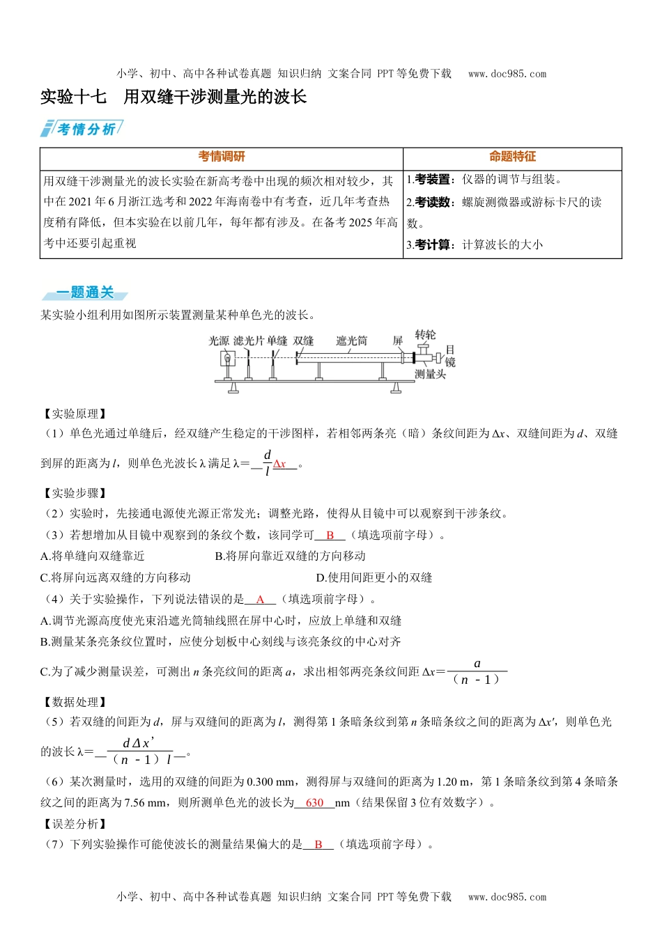 小学、初中、高中各种试卷真题知识归纳文案合同PPT等免费下载www.doc985.com小学、初中、高中各种试卷真题知识归纳文案合同PPT等免费下载www.doc985.com实验十七用双缝干涉测量光的波长考情调研命题特征用双缝干涉测量光的波长实验在新高考卷中出现的频次相对较少,其中在2021年6月浙江选考和2022年海南卷中有考查,近几年考查热度稍有降低,但本实验在以前几年,每年都有涉及。在备考2025年高考中还要引起重视1.考装置:仪器的调节与组装。2.考读数:螺旋测微器或游标卡尺的读数。3.考计算:计算波长的大小某实验小组利用如图所示装置测量某种单色光的波长。【实验原理】(1)单色光通过单缝后,经双缝产生稳定的干涉图样,若相邻两条亮(暗)条纹间距为Δx、双缝间距为d、双缝到屏的距离为l,则单色光波长λ满足λ=dlΔx。【实验步骤】(2)实验时,先接通电源使光源正常发光;调整光路,使得从目镜中可以观察到干涉条纹。(3)若想增加从目镜中观察到的条纹个数,该同学可B(填选项前字母)。A.将单缝向双缝靠近B.将屏向靠近双缝的方向移动C.将屏向远离双缝的方向移动D.使用间距更小的双缝(4)关于实验操作,下列说法错误的是A(填选项前字母)。A.调节光源高度使光束沿遮光筒轴线照在屏中心时,应放上单缝和双缝B.测量某条亮条纹位置时,应使分划板中心刻线与该亮条纹的中心对齐C.为了减少测量误差,可测出n条亮纹间的距离a,求出相邻两亮条纹间距Δx=a(n-1)【数据处理】(5)若双缝的间距为d,屏与双缝间的距离为l,测得第1条暗条纹到第n条暗条纹之间的距离为Δx',则单色光的波长λ=dΔx'(n-1)l。(6)某次测量时,选用的双缝的间距为0.300mm,测得屏与双缝间的距离为1.20m,第1条暗条纹到第4条暗条纹之间的距离为7.56mm,则所测单色光的波长为630nm(结果保留3位有效数字)。【误差分析】(7)下列实验操作可能使波长的测量结果偏大的是B(填选项前字母)。小学、初中、高中各种试卷真题知识归纳文案合同PPT等免费下载www.doc985.com小学、初中、高中各种试卷真题知识归纳文案合同PPT等免费下载www.doc985.comA.双缝间距d的测量值偏小B.相邻亮条纹间距Δx的测量值偏大C.双缝到屏之间的距离l的测量值偏大解析:(1)根据条纹间距公式Δx=ldλ可得λ=dlΔx。(3)若想增加从目镜中观察到的条纹个数,需要减小条纹间距,由公式Δx=ldλ可知,可以减小双缝到屏的距离l或增大双缝间的距离d,故B正确,A、C、D错误。(4)在“用双缝干涉测光的波长”实验中,应先调节器件的高度,使光束能沿遮光筒轴线把屏照亮,再安装单缝和双缝,故选项A错误,符合题意;根据实验操作可知选项B、C正确,不符合题意。(5)由题意可知Δx'n-1=ldλ,所以λ=dΔx'(n-1)l。(6)将已知条件代入(5)中解得λ'=630nm。(7)由λ=Δx·dl可得,若双缝间距d的测量值偏小,波长的测量结果将偏小,A错误;若相邻亮条纹间距Δx偏大,波长的测量结果将偏大,B正确;若双缝到屏之间的距离l的测量值偏大,波长的测量结果将偏小,C错误。1.数据处理(1)条纹间距的计算:转动测量头的手轮,分划板中心刻线在第1条亮条纹中央时读数为a1,在第n条亮条纹中央时读数为a2,则Δx=a2-a1n-1。(2)根据条纹间距与波长的关系Δx=ldλ,得λ=dlΔx,其中d为双缝间距,l为双缝到光屏的距离。2.误差分析(1)双缝到光屏的距离l的测量存在误差。(2)测条纹间距Δx带来的误差。①干涉条纹没有调整到最清晰的程度。②误认为Δx为亮条纹的宽度。③分划板中心刻线与干涉条纹不平行,中心刻线没有恰好位于亮条纹中心。④测量多条亮条纹间的距离时读数不准确,此间距中的条纹数未数清。3.注意事项(1)调节双缝干涉仪时,要注意调整光源的高度,使它发出的光束能够沿着遮光筒的轴线把屏照亮。(2)放置单缝和双缝时,缝要相互平行,中心大致位于遮光筒的轴线上。(3)调节测量头时,应使分划板中心刻线和亮条纹的中心对齐,记下此时手轮上的读数,转动手轮,使分划板中心刻线和另一亮条纹的中心对齐,记下此时手轮上的读数,两次读数之差就表示这两条亮条纹间的距离。(4)不要直接测Δx,要测多条亮...