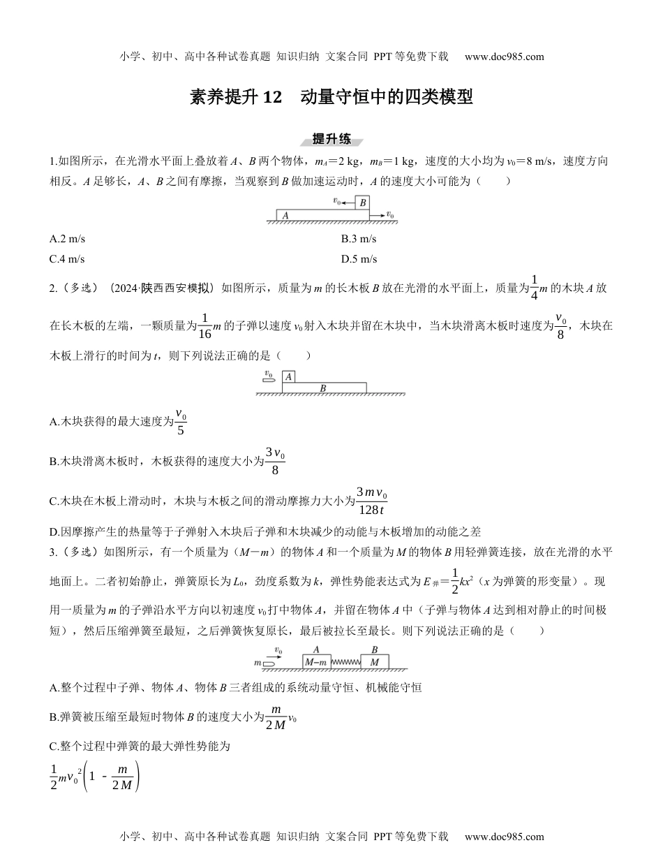 小学、初中、高中各种试卷真题知识归纳文案合同PPT等免费下载www.doc985.com小学、初中、高中各种试卷真题知识归纳文案合同PPT等免费下载www.doc985.com素养提升12动量守恒中的四类模型1.如图所示,在光滑水平面上叠放着A、B两个物体,mA=2kg,mB=1kg,速度的大小均为v0=8m/s,速度方向相反。A足够长,A、B之间有摩擦,当观察到B做加速运动时,A的速度大小可能为()A.2m/sB.3m/sC.4m/sD.5m/s2.(多选)(2024·西西安模陕拟)如图所示,质量为m的长木板B放在光滑的水平面上,质量为14m的木块A放在长木板的左端,一颗质量为116m的子弹以速度v0射入木块并留在木块中,当木块滑离木板时速度为v08,木块在木板上滑行的时间为t,则下列说法正确的是()A.木块获得的最大速度为v05B.木块滑离木板时,木板获得的速度大小为3v08C.木块在木板上滑动时,木块与木板之间的滑动摩擦力大小为3mv0128tD.因摩擦产生的热量等于子弹射入木块后子弹和木块减少的动能与木板增加的动能之差3.(多选)如图所示,有一个质量为(M-m)的物体A和一个质量为M的物体B用轻弹簧连接,放在光滑的水平地面上。二者初始静止,弹簧原长为L0,劲度系数为k,弹性势能表达式为E弹=12kx2(x为弹簧的形变量)。现用一质量为m的子弹沿水平方向以初速度v0打中物体A,并留在物体A中(子弹与物体A达到相对静止的时间极短),然后压缩弹簧至最短,之后弹簧恢复原长,最后被拉长至最长。则下列说法正确的是()A.整个过程中子弹、物体A、物体B三者组成的系统动量守恒、机械能守恒B.弹簧被压缩至最短时物体B的速度大小为m2Mv0C.整个过程中弹簧的最大弹性势能为12mv02(1-m2M)小学、初中、高中各种试卷真题知识归纳文案合同PPT等免费下载www.doc985.com小学、初中、高中各种试卷真题知识归纳文案合同PPT等免费下载www.doc985.comD.物体B的最大加速度大小为mv0M❑√k2M4.(多选)如图甲所示,曲面为四分之一圆弧、质量为M的滑块静止在光滑水平地面上,一光滑小球以某一速度水平冲上滑块的圆弧面,且没有从滑块上端冲出去,若测得在水平方向上小球与滑块的速度大小分别为v1、v2,作出v1-v2图像如图乙所示,重力加速度为g,不考虑任何阻力,则下列说法正确的是()A.小球的质量为baMB.小球运动到最高点时的速度为aba+bC.小球能够上升的最大高度为a22(a+b)gD.若a>b,小球在与滑块分离后向左做平抛运动5.如图所示,在水平面上依次放置物块A以及曲面劈B,其中物块A的质量为m=1kg,曲面劈B的质量M=3kg,曲面劈B的曲面下端与水平面相切,且曲面劈B足够高,所有的摩擦均不考虑。现给物块A一个正对曲面劈B的初速度,使物块A冲上曲面。若曲面劈B固定在地面上,则物块A能够达到的最大高度为H1,随后物块A从曲面劈B上滑离时的速度为v1;若将曲面劈B自由放置在地面上,则物块A能够达到的最大高度为H2,随后物块A从曲面劈B上滑离时的速度为v2。求:(1)H1与H2的比值;(2)v1与v2的比值。6.(2024·福建福州模拟)如图,一水平轻弹簧左端固定,右端与一质量为m的小物块a连接,a静止在水平地面上的A处,此时弹簧处于原长状态,A左侧地面光滑;另一质量为12m的小滑块b静止在B处,b与地面间的动摩擦因数为μ。现对b施加一水平向左、大小为F=32μmg的恒定推力,经时间t后b与a发生弹性正碰(碰撞时间极短),碰前瞬间撤去推力,a与b不再相碰。已知重力加速度大小为g。求:(1)b与a碰撞前瞬间的速度大小v以及A与B间的距离x0;小学、初中、高中各种试卷真题知识归纳文案合同PPT等免费下载www.doc985.com小学、初中、高中各种试卷真题知识归纳文案合同PPT等免费下载www.doc985.com(2)弹簧的最大弹性势能Epm以及碰后b运动的路程L。小学、初中、高中各种试卷真题知识归纳文案合同PPT等免费下载www.doc985.com小学、初中、高中各种试卷真题知识归纳文案合同PPT等免费下载www.doc985.com7.(2024·中大附中模华师拟)如图所示,质量mC=4.5kg的长木板C静止在光滑的水平面上,长木板C右端与竖直固定挡板相距x0,左端放一个质量mB=3.0kg的小物块B(可视为质点),与长木板C间的动摩擦因数为μ=0.05。在小物块B的正上方,用不可伸长、长度l...