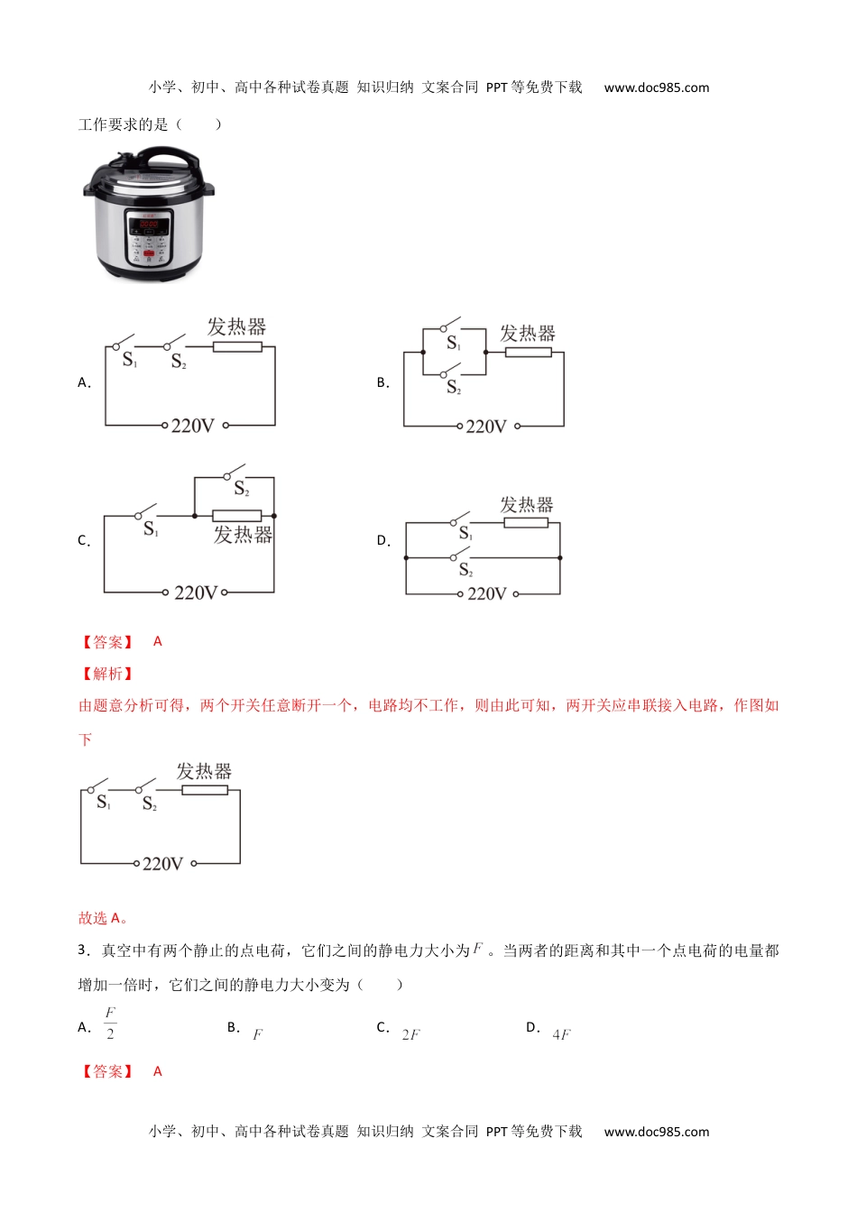 小学、初中、高中各种试卷真题知识归纳文案合同PPT等免费下载www.doc985.com小学、初中、高中各种试卷真题知识归纳文案合同PPT等免费下载www.doc985.com2022年广东省普通高中学业水平合格性考试物理仿真模拟卷(新课程)(B)第一部分选择题一、单项选择题Ⅰ:本大题共20小题,每小题3分,共60分。在每小题列出的四个选项中,只有一项最符合题意1.三根规格相同的长直导线a、b、c互相平行,它们处于其中一个角为30°的直角三角形abc的三个顶点处,导线中通有方向如图所示的电流,电流大小相等,若a处通电导线在斜边ac的中点O处产生的磁感应强度大小为B,则斜边中点O处磁感应强度的大小为()A.0B.BC.D.【答案】C【解析】根据右手螺旋定则,各电流产生的磁场的方向如图ac导线电流产生磁场都沿左下方,而b导线产生磁场都沿左上方,由于各电流产生的磁场的大小都是B,磁场强度是矢量,利用平行四边形定则可求出合磁场强度,大小等于;故选C。2.如图所示为一台电压力锅,它结合了高压锅和电饭锅的优点,省时省电、安全性高。当电压力锅内部气压过大或温度过高时,发热器都会停止工作。图乙中S1为过压保护开关,S2为过热保护开关,压强过大时开关S1自动断开,温度过高时开关S2自动断开。图乙表示S1、S2和锅内发热器的连接情况,其中符合上述小学、初中、高中各种试卷真题知识归纳文案合同PPT等免费下载www.doc985.com小学、初中、高中各种试卷真题知识归纳文案合同PPT等免费下载www.doc985.com工作要求的是()A.B.C.D.【答案】A【解析】由题意分析可得,两个开关任意断开一个,电路均不工作,则由此可知,两开关应串联接入电路,作图如下故选A。3.真空中有两个静止的点电荷,它们之间的静电力大小为。当两者的距离和其中一个点电荷的电量都增加一倍时,它们之间的静电力大小变为()A.B.C.D.【答案】A小学、初中、高中各种试卷真题知识归纳文案合同PPT等免费下载www.doc985.com小学、初中、高中各种试卷真题知识归纳文案合同PPT等免费下载www.doc985.com【解析】由库仑定律可得,原来的静电力大小为当两者的距离和其中一个点电荷的电量都增加一倍时,它们之间的静电力大小变为A正确。故选A。4.关于重力做功和重力势能的变化,下列叙述正确的是()A.做竖直上抛运动的物体,在上升段,重力做负功,重力势能减少B.做竖直上抛运动的物体,在下落段,重力做正功,重力势能增加C.做平抛运动的物体,重力势能在不断减少D.物体高度降低了,重力势能可能不变【答案】C【解析】根据重力势能的表达式,有只要物体相对地面的高度增加了,重力势能便会增大,反之,便会减小。故选C。5.关于开普勒行星运动的公式=k,以下理解不正确的是()A.k是一个与行星无关的常量B.T表示行星运动的自转周期C.T表示行星运动的公转周期D.a是指半长轴,粗略计算时可以表示半径【答案】B【解析】A.k是一个与行星无关的常,只与中心天体(太阳)的质量有关,A正确,不符合题意;BC.T表示行星运动的公转周期,B错误,符合题意,C正确,不符合题意;D.a是指半长轴,若椭圆轨道近似圆,粗略计算时可以表示半径,D正确,不符合题意。小学、初中、高中各种试卷真题知识归纳文案合同PPT等免费下载www.doc985.com小学、初中、高中各种试卷真题知识归纳文案合同PPT等免费下载www.doc985.com故选B。6.如图所示,一同学将自行车悬挂处于静止状态,转动脚踏板使轮盘匀速转动。M为前轮盘边缘上的一点N为后轮盘边缘上一点,前后轮盘的半径比为21∶,则M、N两点的向心加速度之比为()A.12∶B.11∶C.21∶D.14∶【答案】A【解析】M、N两点的线速度大小相等,根据可知,故选A。7.如图所示,物体静止于水平桌面上,则()A.桌面对物体的支持力的大小等于物体的重力,这两个力是一对平衡力B.物体所受的重力和桌面对它的支持力是一对作用力与反作用力C.物体对桌面的压力就是物体的重力,这两个力是同一种力D.物体对桌面的压力和桌面对物体的支持力是一对平衡的力【答案】A【解析】AB.桌面对物体的支持力的大小等于物体的重力,这两个力是一对平衡力,A正确,B错误;小学、初中、高中各种试卷真题知...