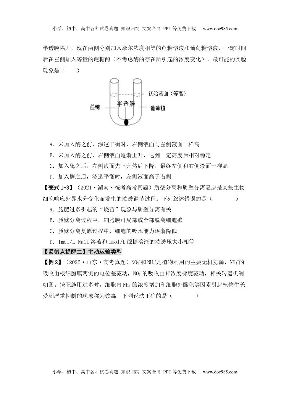 小学、初中、高中各种试卷真题知识归纳文案合同PPT等免费下载www.doc985.com小学、初中、高中各种试卷真题知识归纳文案合同PPT等免费下载www.doc985.com易错点03渗透作用和主动运输的深度解读目录01易错陷阱(3大陷阱)02举一反三【易错点提醒一】质量浓度≠物质的量浓度【易错点提醒二】主动运输不都是ATP直接供能【易错点提醒三】温度不只影响主动运输速率03易错题通关易错陷阱1:质量浓度就是物质的量浓度【分析】渗透系统的溶液浓度指物质的量浓度而非质量浓度,实质是指渗透压,大小取决于溶液中溶质微粒数目。错陷阱2:主动运输都是ATP直接供能【分析】第一类:直接消耗ATP的主动运输,通常称为泵(ATP驱动泵),ATP驱动泵既是载体同时也是催化ATP水解的酶。第二类:间接消耗ATP的主动运输。小肠上皮细胞逆浓度吸收葡萄糖时,没有直接消耗ATP,而是利用Na+浓度差的能量。但是Na+浓度差的建立是依靠Na+-K+泵的,而Na+-K+需要消耗ATP。第三类:光驱动:一种噬盐的厌氧细胞膜上特有的蛋白质(细菌视紫红质),可在光能的激发下,逆浓度将H+运出细胞,造成细胞外积累高能浓度H+,这种H+浓度差可被另一种蛋白利用合成ATP。易错陷阱3:温度仅影响主动运输速率【分析】温度可以通过影响酶的活性进而影响呼吸作用的能量释放来影响物质运输速率,也可以通过影响生物膜的流动性来影响物质运输。【易错点提醒一】质量浓度≠物质的量浓度(U形管分析)小学、初中、高中各种试卷真题知识归纳文案合同PPT等免费下载www.doc985.com小学、初中、高中各种试卷真题知识归纳文案合同PPT等免费下载www.doc985.com【例1】U形管中装有两种不同的溶液R和S(R溶液为质量分数为10%的蔗糖溶液,S溶液为质量分数为10%的葡萄糖溶液,两种溶质均不能透过半透膜X),两溶液被一半透膜X隔开,如图所示。当U形管内达到平衡时,液面与浓度的关系应是()A.右侧较高,且平衡时两溶液浓度相等B.两侧高度相等,浓度相等C.右侧较高,且平衡时右侧浓度较大D.左侧较高,且平衡时左侧浓度较大易错分析:渗透压,大小取决于溶液中溶质微粒数目,即物质的量浓度。【变式1-1】图中X、Y分别为不同的溶液(浓度均以质量分数表示),且水和单糖能通过半透膜,而二糖、多糖等不能通过半透膜。下列相关叙述错误的是()A.若X为蒸馏水,Y为30%葡萄糖溶液,现象是左侧液面先下降后上升,最终左右液面持平B.若X为30%葡萄糖溶液,Y为30%淀粉溶液,现象是左侧液面先上升后下降,最终左右液面持平C.若X为30%蔗糖溶液,Y为30%淀粉溶液,现象是左侧液面先上升后稳定D.若X为蒸馏水,Y为30%淀粉溶液,现象是左侧液面先下降后稳定【变式1-2】如图所示U形管中间被一种水分子和单糖可以通过而二糖不能透过的小学、初中、高中各种试卷真题知识归纳文案合同PPT等免费下载www.doc985.com小学、初中、高中各种试卷真题知识归纳文案合同PPT等免费下载www.doc985.com半透膜隔开,现在两侧分别加入摩尔浓度相等的蔗糖溶液和葡萄糖溶液,一定时间后在左侧加入等量的蔗糖酶(不考虑酶的存在所引起的浓度变化)。最可能的实验现象是()A.未加入酶之前,渗透平衡时,右侧液面与左侧液面一样高B.未加入酶之前,右侧液面逐渐上升,达到一定高度后相对稳定C.加入酶之后,左侧液面先上升然后下降,最终左侧和右侧液面一样高D.加入酶之后,渗透平衡时,左侧液面高于右侧【变式1-3】(2021·湖南·统考高考真题)质壁分离和质壁分离复原是某些生物细胞响应外界水分变化而发生的渗透调节过程。下列叙述错误的是()A.施肥过多引起的“烧苗”现象与质壁分离有关B.质壁分离过程中,细胞膜可局部或全部脱离细胞壁C.质壁分离复原过程中,细胞的吸水能力逐渐降低D.1mol/LNaCl溶液和1mol/L蔗糖溶液的渗透压大小相等【易错点提醒二】主动运输类型【例2】(2022·山东·高考真题)NO3-和NH4+是植物利用的主要无机氮源,NH4+的吸收由根细胞膜两侧的电位差驱动,NO3-的吸收由H+浓度梯度驱动,相关转运机制如图。铵肥施用过多时,细胞内NH4+的浓度增加和细胞外酸化等因素引起植物生长受到严重抑制的现象称为铵毒。下列说法正确的是()小学、初中、高中各...