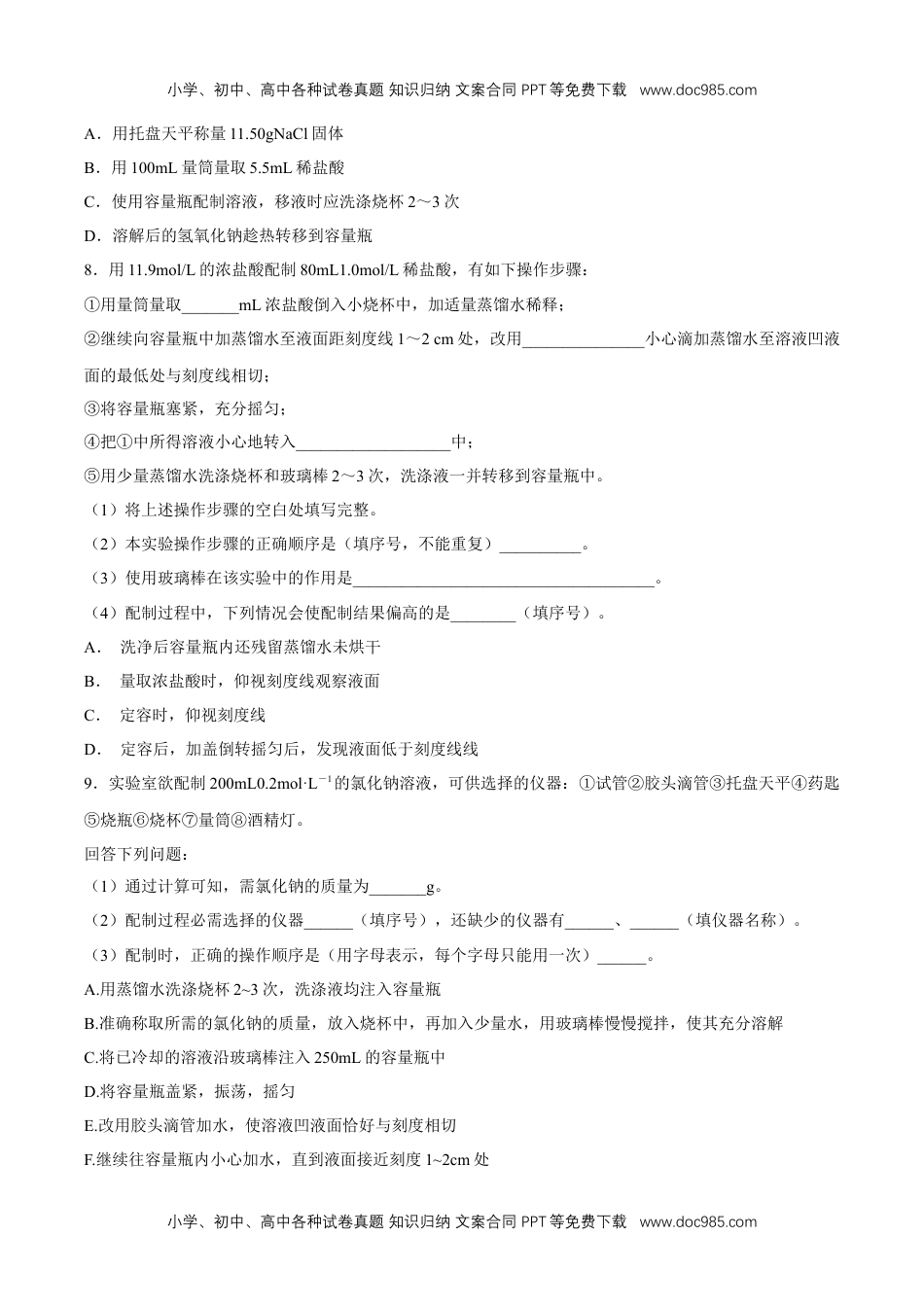 小学、初中、高中各种试卷真题知识归纳文案合同PPT等免费下载www.doc985.com小学、初中、高中各种试卷真题知识归纳文案合同PPT等免费下载www.doc985.com2.3.3物质的量浓度练习(原卷版)1.下列溶液中,Cl﹣的物质的量浓度最小的是()A.1L1mol•L1﹣的NaCl溶液B.0.1L2mol•L1﹣的KCl溶液C.0.1L1mol•L1﹣的MgCl2溶液D.10mL1mol•L1﹣的AlCl3溶液2.下列各溶液中n(Na+)与100mL0.1mol/LNa2SO4溶液中n(Na+)相同的是A.100mL0.1mol/LNaCl溶液B.50mL0.2mol/LNaNO3溶液C.100mL0.1mol/LNaHSO4溶液D.200mL0.2mol/LHCl溶液与100mL0.2mol/LNaHCO3溶液混合3.下列溶液中溶质的物质的量浓度为1mol/L的是()A.将58.5gNaCl溶解在1L水中B.将1L10mol/L的硫酸加入9L水中C.将11.2LHCl气体溶于水配成0.5L溶液D.将40gNaOH溶解在少量水中,再加蒸馏水直到溶液体积为1L4.下列叙述中正确的是()A.摩尔是国际单位制中七个基本物理量之一B.铁的摩尔质量就是铁原子的相对原子质量C.含有NA个氧原子的硫酸的物质的量是0.25molD.40gNaOH溶于1L水,溶质的物质的量浓度为1mol·L-15.已知:溶液呈电中性的原因是溶液中阴、阳离子所带的负、正电荷总数相等,在KCl、CaCl2、Ca(NO3)2形成的混合溶液中,c(K+)=0.2mol/L,c(Ca2+)=0.5mol/L,c(Cl-)=0.4mol/L,计算分析判断,则c(NO3-)为()A.0.3mol/LB.0.8mol/LC.0.4mol/LD.0.5mol/L6.将一质量分数为ω的KOH溶液蒸发掉mg水后,质量分数恰好变为为2ω,体积为V(溶液中无晶体析出),则浓缩后溶液的物质的量浓度为()A.mol·L-1B.mol·L-1C.mol·L-1D.mol·L-17.下列实验操作正确的是()小学、初中、高中各种试卷真题知识归纳文案合同PPT等免费下载www.doc985.com小学、初中、高中各种试卷真题知识归纳文案合同PPT等免费下载www.doc985.comA.用托盘天平称量11.50gNaCl固体B.用100mL量筒量取5.5mL稀盐酸C.使用容量瓶配制溶液,移液时应洗涤烧杯2~3次D.溶解后的氢氧化钠趁热转移到容量瓶8.用11.9mol/L的浓盐酸配制80mL1.0mol/L稀盐酸,有如下操作步骤:①用量筒量取_______mL浓盐酸倒入小烧杯中,加适量蒸馏水稀释;②继续向容量瓶中加蒸馏水至液面距刻度线1~2cm处,改用_______________小心滴加蒸馏水至溶液凹液面的最低处与刻度线相切;③将容量瓶塞紧,充分摇匀;④把①中所得溶液小心地转入___________________中;⑤用少量蒸馏水洗涤烧杯和玻璃棒2~3次,洗涤液一并转移到容量瓶中。(1)将上述操作步骤的空白处填写完整。(2)本实验操作步骤的正确顺序是(填序号,不能重复)__________。(3)使用玻璃棒在该实验中的作用是_____________________________________。(4)配制过程中,下列情况会使配制结果偏高的是________(填序号)。A.洗净后容量瓶内还残留蒸馏水未烘干B.量取浓盐酸时,仰视刻度线观察液面C.定容时,仰视刻度线D.定容后,加盖倒转摇匀后,发现液面低于刻度线线9.实验室欲配制200mL0.2mol·L-1的氯化钠溶液,可供选择的仪器:①试管②胶头滴管③托盘天平④药匙⑤烧瓶⑥烧杯⑦量筒⑧酒精灯。回答下列问题:(1)通过计算可知,需氯化钠的质量为_______g。(2)配制过程必需选择的仪器______(填序号),还缺少的仪器有______、______(填仪器名称)。(3)配制时,正确的操作顺序是(用字母表示,每个字母只能用一次)______。A.用蒸馏水洗涤烧杯2~3次,洗涤液均注入容量瓶B.准确称取所需的氯化钠的质量,放入烧杯中,再加入少量水,用玻璃棒慢慢搅拌,使其充分溶解C.将已冷却的溶液沿玻璃棒注入250mL的容量瓶中D.将容量瓶盖紧,振荡,摇匀E.改用胶头滴管加水,使溶液凹液面恰好与刻度相切F.继续往容量瓶内小心加水,直到液面接近刻度1~2cm处小学、初中、高中各种试卷真题知识归纳文案合同PPT等免费下载www.doc985.com小学、初中、高中各种试卷真题知识归纳文案合同PPT等免费下载www.doc985.com(4)若出现如下情况,对所配溶液浓度将有何影响(填“偏高”、“偏低”或“无影响”)。①容量瓶用蒸馏水洗净后,内壁有少量蒸馏水______。②若没有进行A操作______。③E操作时,若定容时俯视刻度线______。④D操作后,发现液面下降,再加水至刻度线______。