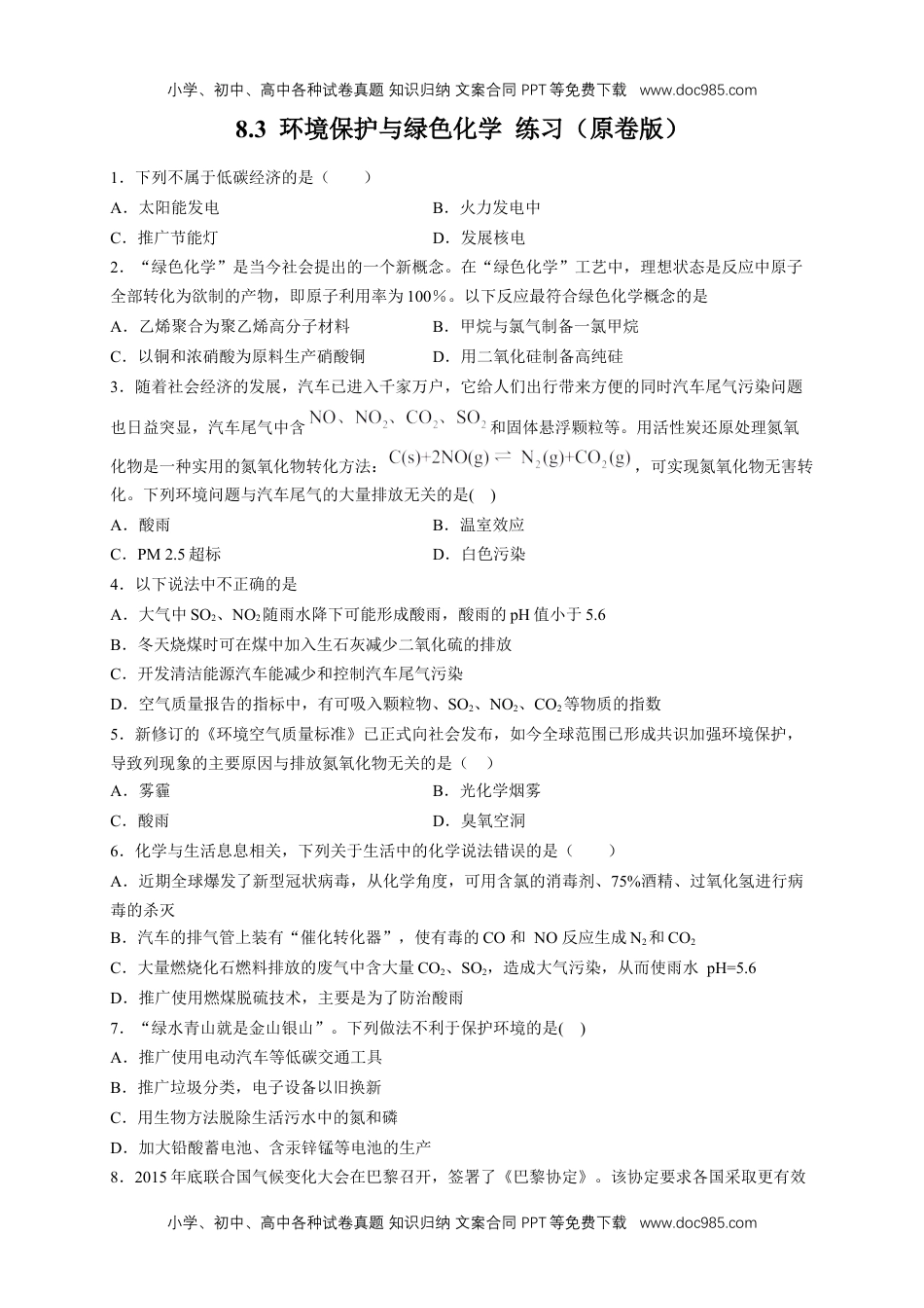 小学、初中、高中各种试卷真题知识归纳文案合同PPT等免费下载www.doc985.com小学、初中、高中各种试卷真题知识归纳文案合同PPT等免费下载www.doc985.com8.3环境保护与绿色化学练习(原卷版)1.下列不属于低碳经济的是()A.太阳能发电B.火力发电中C.推广节能灯D.发展核电2.“绿色化学”是当今社会提出的一个新概念。在“绿色化学”工艺中,理想状态是反应中原子全部转化为欲制的产物,即原子利用率为100%。以下反应最符合绿色化学概念的是A.乙烯聚合为聚乙烯高分子材料B.甲烷与氯气制备一氯甲烷C.以铜和浓硝酸为原料生产硝酸铜D.用二氧化硅制备高纯硅3.随着社会经济的发展,汽车已进入千家万户,它给人们出行带来方便的同时汽车尾气污染问题也日益突显,汽车尾气中含和固体悬浮颗粒等。用活性炭还原处理氮氧化物是一种实用的氮氧化物转化方法:,可实现氮氧化物无害转化。下列环境问题与汽车尾气的大量排放无关的是()A.酸雨B.温室效应C.PM2.5超标D.白色污染4.以下说法中不正确的是A.大气中SO2、NO2随雨水降下可能形成酸雨,酸雨的pH值小于5.6B.冬天烧煤时可在煤中加入生石灰减少二氧化硫的排放C.开发清洁能源汽车能减少和控制汽车尾气污染D.空气质量报告的指标中,有可吸入颗粒物、SO2、NO2、CO2等物质的指数5.新修订的《环境空气质量标准》已正式向社会发布,如今全球范围已形成共识加强环境保护,导致列现象的主要原因与排放氮氧化物无关的是()A.雾霾B.光化学烟雾C.酸雨D.臭氧空洞6.化学与生活息息相关,下列关于生活中的化学说法错误的是()A.近期全球爆发了新型冠状病毒,从化学角度,可用含氯的消毒剂、75%酒精、过氧化氢进行病毒的杀灭B.汽车的排气管上装有“催化转化器”,使有毒的CO和NO反应生成N2和CO2C.大量燃烧化石燃料排放的废气中含大量CO2、SO2,造成大气污染,从而使雨水pH=5.6D.推广使用燃煤脱硫技术,主要是为了防治酸雨7.“绿水青山就是金山银山”。下列做法不利于保护环境的是()A.推广使用电动汽车等低碳交通工具B.推广垃圾分类,电子设备以旧换新C.用生物方法脱除生活污水中的氮和磷D.加大铅酸蓄电池、含汞锌锰等电池的生产8.2015年底联合国气候变化大会在巴黎召开,签署了《巴黎协定》。该协定要求各国采取更有效小学、初中、高中各种试卷真题知识归纳文案合同PPT等免费下载www.doc985.com小学、初中、高中各种试卷真题知识归纳文案合同PPT等免费下载www.doc985.com的“节能减排”措施控制温室效应。下列做法不利于“节能减排”的是()A.减少使用化石燃料B.大力发展火力发电C.改变能源结构,开发使用清洁能源D.将煤气化或液化,以提高其综合利用率9.“绿色化学”的理想状态是反应物的原子全部转化为目标产物。以下反应不符合绿色化学原则的是()A.工业生产环氧乙烷:B.水煤气合成甲醇:CO+2H2CH3OHC.制取硫酸铜:Cu+2H2SO4(浓)CuSO4+SO2↑+2H2OD.合成甲基丙烯酸甲酯:CH3C≡CH+CO+CH3OHCH2=C(CH3)COOCH310.科学家认为,氢气是一种高效而无污染的理想能源,近20年来,对氢能源的研究获得了迅速发展。(1)已知1molH2完全燃烧时放出285.8kJ的热量,试写出H2燃烧的热化学方程式:_________。(2)为了有效发展民用氢能源,首先必须制得廉价的氢气,下列可供开发又较经济且资源可持续利用的制氢气的方法是_________(填序号)。A.电解水B.锌和稀硫酸反应C.光解海水(3)某学生查阅大量资料,提出下列用水制取氢气的研究方向:①研究在水不发生化学反应的情况下制取氢气,同时释放能量。②设法将太阳光聚焦,产生高温,使水分解产生氢气。③寻找高效催化剂,提高水在一定条件下分解产生氢气的转化率。④寻找特殊化学物质,用于开发廉价能源,用以分解水制取氢气请你从上述研究方向中,选择其中不合理的项,并简述理由:不合理的是_________,理由是___________。11.汽车尾气主要含有CO2、CO、SO2、NO及汽油、柴油等物质,这种尾气越来越成为城市空气污染的主要来源,必须予以治理。治理的方法之一是在汽车的排气管上装一个“催化转换器”(用铂、钯合金作催化剂)。它的特点是使CO与NO反应,生成可参与大气生态环...