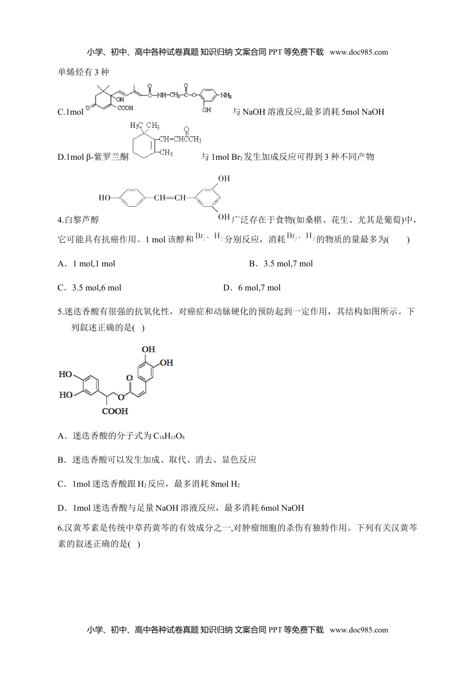 小学、初中、高中各种试卷真题知识归纳文案合同PPT等免费下载www.doc985.com小学、初中、高中各种试卷真题知识归纳文案合同PPT等免费下载www.doc985.com2020—2021学年人教版(2019)选择性必修三章节自我强化训练3.2.6酚类的化学性质1.Y是合成香料、医药、农药及染料的重要中间体,可由X在一定条件下合成。下列说法不正确的是()A.Y的分子式为B.由X制取Y的过程中可得到乙醇C.一定条件下,Y能发生加聚反应和缩聚反应D.等物质的量的X、Y分别与NaOH溶液反应,最多消耗NaOH的物质的量之比为3:22.天然维生素P(结构如下图,分子结构中R为饱和烃基)存在于槐树花蕾中,它是一种营养增补剂,关于维生素P的叙述不正确的是()A.可与溴水反应,且1mol该物质与足量溴水反应消耗5molBr2B.可与NaOH溶液反应,1mol该物质可与4molNaOH反应C.一定条件下1mol该物质可与H2加成,消耗H2最大量为8molD.维生素P遇FeCl3溶液发生显色反应3.下列说法不正确的是()A.(CH3)2C(Cl)CH2CH3的名称为:2–甲基-2–氯丁烷B.某烷烃主链4个碳原子数的同分异构体有2种,则与其碳原子个数相同的且主链4个碳原子的小学、初中、高中各种试卷真题知识归纳文案合同PPT等免费下载www.doc985.com小学、初中、高中各种试卷真题知识归纳文案合同PPT等免费下载www.doc985.com单烯烃有3种C.1mol与NaOH溶液反应,最多消耗5molNaOHD.1molβ-紫罗兰酮与1molBr2发生加成反应可得到3种不同产物4.白黎芦醇广泛存在于食物(如桑椹、花生、尤其是葡萄)中,它可能具有抗癌作用。1mol该醇和分别反应,消耗的物质的量最多为()A.1mol,1molB.3.5mol,7molC.3.5mol,6molD.6mol,7mol5.迷迭香酸有很强的抗氧化性,对癌症和动脉硬化的预防起到一定作用,其结构如图所示。下列叙述正确的是()A.迷迭香酸的分子式为C18H15O8B.迷迭香酸可以发生加成、取代、消去、显色反应C.1mol迷迭香酸跟H2反应,最多消耗8molH2D.1mol迷迭香酸与足量NaOH溶液反应,最多消耗6molNaOH6.汉黄芩素是传统中草药黄芩的有效成分之一,对肿瘤细胞的杀伤有独特作用。下列有关汉黄芩素的叙述正确的是()小学、初中、高中各种试卷真题知识归纳文案合同PPT等免费下载www.doc985.com小学、初中、高中各种试卷真题知识归纳文案合同PPT等免费下载www.doc985.comA.汉黄芩素的分子式为B.该物质遇溶液显色C.1mol该物质与溴水反应,最多消耗1molD.与足量发生加成反应后,该分子中官能团的种类减少1种7.铁杉脂素是重要的木脂素类化合物,其结构简式如图所示。下列有关铁杉脂素的说法错误的是()A.分子中两个苯环处于同一平面B.分子中有3个手性碳原子C.能与浓溴水发生取代反应D.1mol铁杉脂素与NaOH溶液反应时最多消耗3molNaOH8.柳胺酚(X)水解得到Y和Z,转化关系如下:下列说法中正确的是()A.Y和Z发生缩聚反应生成X小学、初中、高中各种试卷真题知识归纳文案合同PPT等免费下载www.doc985.com小学、初中、高中各种试卷真题知识归纳文案合同PPT等免费下载www.doc985.comB.Y的结构简式为C.镍催化作用下,1molZ最多消耗67.2LH2D.X、Y、Z都能与FeCl3溶液发生显色反应9.扁桃酸衍生物是重要的医药中间体,结构如图所示,下列关于这种衍生物的说法正确的是()A.分子式为B.不能与浓溴水反应生成沉淀C.与HCHO一定条件下可以发生缩聚反应D.1mol此衍生物最多与2molNaOH发生反应10.醌类化合物广泛存在于植物中,有抑菌、杀菌作用,可由酚类物质制备:下列说法不正确的是()A.反应I、II均为氧化反应B.对苯醌、萘醌均属于芳香族化合物C.苯酚与萘酚含有相同官能团,但不互为同系物小学、初中、高中各种试卷真题知识归纳文案合同PPT等免费下载www.doc985.com小学、初中、高中各种试卷真题知识归纳文案合同PPT等免费下载www.doc985.comD.属于酚类,属于醌类11.某化妆品的组分Z具有美白功效,原从杨树中提取,现可用如下反应制备:下列叙述错误的是()A.X、Z均能使FeCl3溶液显紫色B.X、Z均能与NaHCO3溶液反应放出CO2C.Y既能发生取代反应,也能发生加成反应D.Y可作加聚反应单体,X可作缩聚反应单体12.汉黄芩素是传统中草药黄芩的有效成分之一,对肿瘤细胞的杀伤有独特作用。下列有关汉黄芩素的叙述正确的是()A.汉黄芩素的分子式为C16H13O5B...
