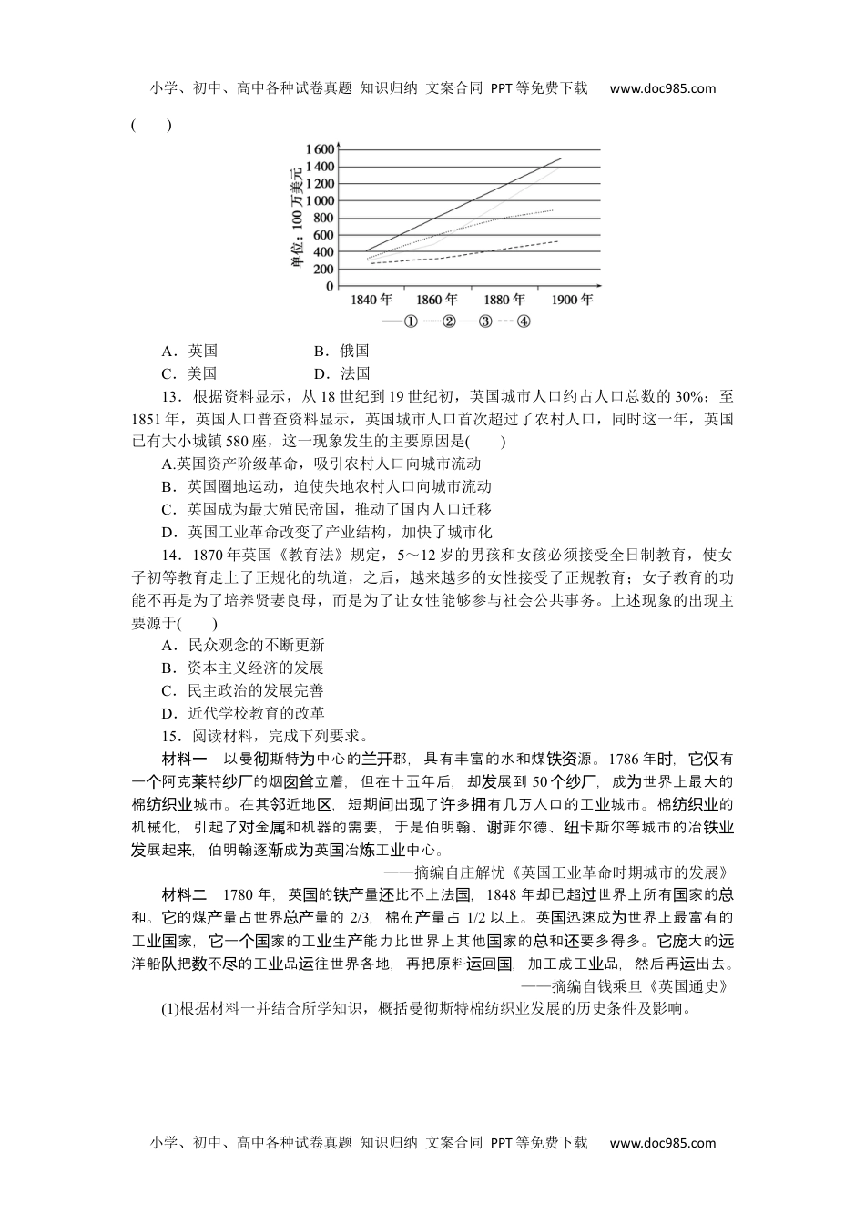 小学、初中、高中各种试卷真题知识归纳文案合同PPT等免费下载www.doc985.com小学、初中、高中各种试卷真题知识归纳文案合同PPT等免费下载www.doc985.com第五单元工业革命与马克思主义的诞生第10课影响世界的工业革命学考达标练第一进阶训练层知识点一工业革命的背景1.18世纪到19世纪上半期,英国圈地运动发展到了议会圈地时期。据资料统计,从1700年到1800年英格兰和威尔士的总人口增加了81%,而这个时期的农业人口却只增加了8.5%。据估计在1750年到1800年之间英国耕地粮食的单位面积产量增长了三分之一。由此可推知圈地运动()A.降低了英国农村人口出生率B.客观上推动了工业革命进行C.是英国政府发起的经济改革D.是农业革命发生的根本原因2.“甚至是在16世纪的英国,纽伯里的杰克在伯克郡就连同漂洗工和印染工雇用了260名男工,100名女工,150名男童和女童。”该文描述的是英国()A.手工工场的发展B.封建庄园的繁荣C.近代工厂的出现D.阶级矛盾的激化3.1685年,英国对所有印花棉布、印度亚麻及所有印度制造的丝绸制品征收10%的税。1721年后售卖印度棉布成为非法行为。据此可知()A.英国纺织业完全落后于印度B.印度惨遭英国殖民掠夺C.资本主义世界市场逐渐萎缩D.贸易保护助推工业革命知识点二工业革命的进程4.19世纪后半期,(欧洲)逐步出现了技术进步的制度化。更多的先进工业企业通过精心的有计划的试验来追寻这种技术创新。这说明第二次工业革命的特点是()A.垄断组织层出不穷B.重工业占据主导地位C.多国几乎同时发生D.科技与生产紧密结合5.1682年,法国人帕潘从他发明的高压锅中获得灵感,设计了第一台蒸汽机模型,并建议将其运用到矿山抽水、开动船只等领域。然而,这一构想在当时无人问津。一百年后,一个叫瓦特的苏格兰人在资本大鳄的倾囊赞助下改良蒸汽机成功,他的机器在英国受到争相追捧。造成这两种发明命运迥然不同的原因是()A.海外市场规模大小不同B.人文思想传播范围不同C.社会经济发展水平不同D.基督教会影响力度不同6.“我们生活在一个充满奇迹的时代,大车不需要马拉,新闻通过环绕全球的电线一瞬间传遍世界……”这样的生活可能出现于()A.“蒸汽时代”B.宗教改革时期C.“电气时代”D.文艺复兴时期小学、初中、高中各种试卷真题知识归纳文案合同PPT等免费下载www.doc985.com小学、初中、高中各种试卷真题知识归纳文案合同PPT等免费下载www.doc985.com知识点三工业革命的影响7.1890年7月2日,美国联邦国会通过《谢尔曼反托拉斯法》。该法集经济制裁与刑事处罚于一体,禁止为了限制贸易而为的契约、联合、通谋以及垄断或者试图垄断,违者将被处以罚款或者监禁。该法案()A.适应了生产力发展的需要B.表明政府限制自由竞争C.体现出美国垄断程度最高D.是无产阶级斗争的结果8.19世纪中期,英国伦敦政府将原先亨利八世的狩猎森林更名为摄政公园,并向公众开放。许多市民涌入公园感受大自然,呼吸新鲜空气。《泰晤士报》也对这个种满绿色植物的公园大加赞赏。这一现象侧面反映出()A.君主复辟拥有社会基础B.报刊媒体影响市政建设C.工业革命带来环境污染D.绿色环保意识得到普及9.下表为1821~1834年中英棉纺织品进出口数据表。由此可知,当时()年份英国输入中国棉纺织品价值中国输入英国棉纺织品价值182113621银圆1317626银圆1831246189两386364两1834451567两16304两A.英国加紧武力侵华B.英国机器生产优势凸显C.世界市场初步形成D.中国社会经济日渐凋敝10.19世纪初,英国铁路公司运营每英里铁路平均需要雇用18人;到19世纪40年代末,运营每英里铁路平均只需雇用11人。这一变化反映出()A.机器大生产已经取代手工劳动B.交通运输业对经济发展影响较大C.工业革命推动生产效率的提升D.人工成本严重制约铁路规模化经营选考高分练第二进阶训练层11.英国经济史学家艾伦在提到工业革命动因时认为,新式机械设备和新技术在英国不断地被发明出来和大规模地应用,“包括蒸汽机、水力纺织机、珍妮纺织机、焦炭冶铁技术等,这些发明有一项共同的特征——对煤炭的消耗较大,且造价偏高,但对人力的耗费却不大”。这反映出()A.高工资水平是推动工...