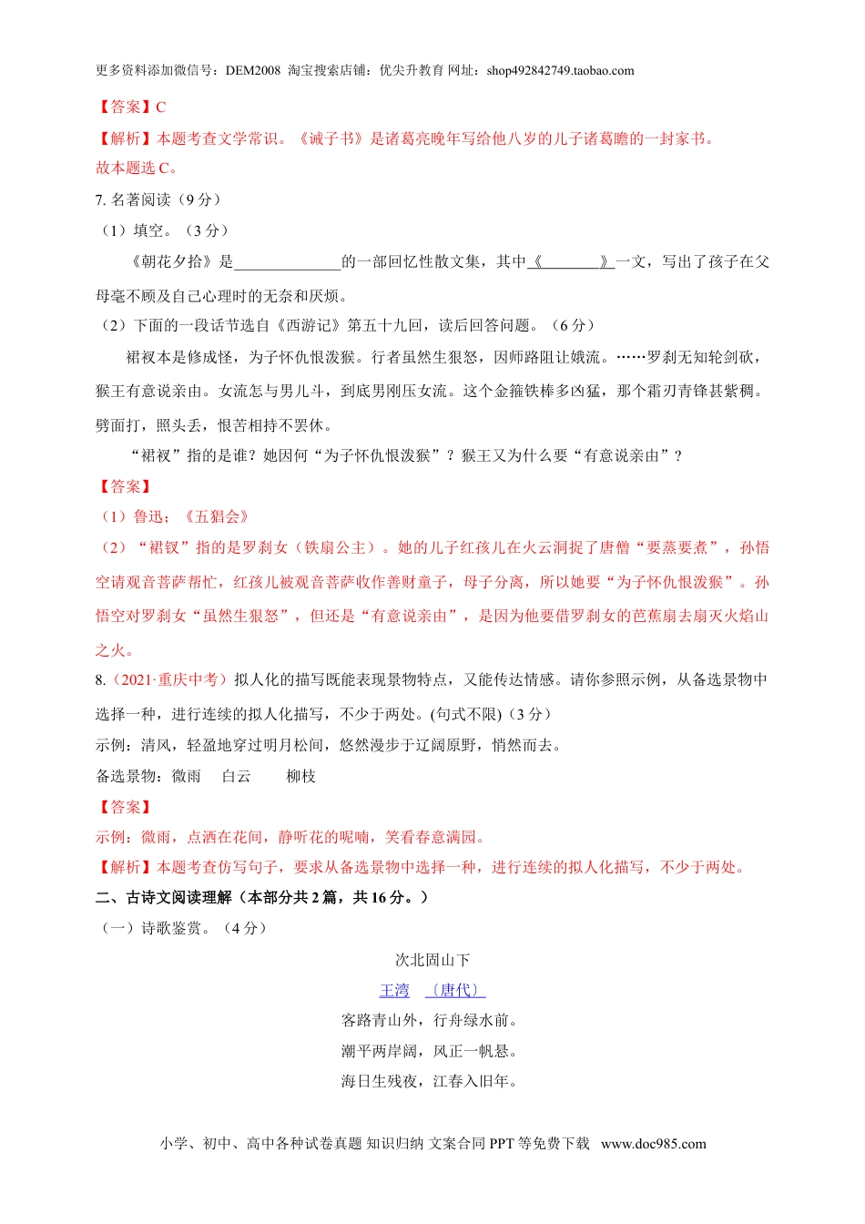 更多资料添加微信号:DEM2008淘宝搜索店铺:优尖升教育网址:shop492842749.taobao.com班级姓名学号分数第04单元(A卷·夯实基础)(时间:120分钟,满分:120分)一、积累与运用(本题共8小题,共29分。)1.用楷书将下面短语工整地抄写在田字格内。(2分)有情芍药含春泪,无力蔷薇卧晓枝。【答案】有情芍药含春泪,无力蔷薇卧晓枝。【解析】本题考查汉字的规范书写。注意将汉字以及标点符号正确、工整、美观地书写,不要写错别字。2.下列加点字注音全部正确的一项是()(3分)A.殉职(xùn)狭隘(yì)废墟(xū)呼啸(xiào)B.鄙薄(bó)坍塌(dān)流淌(tǎng)琢磨(zhuó)C.热忱(zhěn)干涸(hé)光秃秃(tū)刨根问底(páo)D.派遣(qiǎn)帐篷(péng)抽噎(yē)拈轻怕重(niān)【答案】D【解析】A选项:狭隘(aì),B选项坍塌(tān),C选项热忱(chén)。故本题选D。3.下列词语书写全部正确的一项是()(3分)A.晕炫畏惧厌倦呻吟B.酬劳希冀帐蓬干涸C.抽噎溜达突兀恍惚D.附合参差凌乱酷热【答案】C【解析】A选项晕(炫)——晕(眩);B选项帐(蓬)——帐(篷);D选项附(合)——附(和)。故本题选C4.下列句子没有语病的一项是()(3分)A.走过这家温暖的书店,安慰着这个城市行色匆匆的人们疲惫的精神和灵魂。B.因为搭上了网络购物的顺风车,快递行业迸发出极大的生长活力让人瞠目结舌。C.大雁之所以能够穿越风雨,行稳致远,关键在于其结伴成行,相互借力。小学、初中、高中各种试卷真题知识归纳文案合同PPT等免费下载www.doc985.com更多资料添加微信号:DEM2008淘宝搜索店铺:优尖升教育网址:shop492842749.taobao.comD.深海勘探开发技术装备的研制,将不断推进我国大洋海底可燃冰的开采工程效率。【答案】C【解析】本题考病句的辨析。常见的病句类型有成分残缺、搭配不当、语序混乱、结构混乱、语意不明、语言赘余等。先通读所有句子,凭语感判断正误,如果不能判断的,可以压缩句子,看搭配是否得当,找出病因。A.有误,缺少主语。B.有误。句式杂糅。应为“快递行业迸发出的极大的生长活力让人瞠目结舌”或者“快递行业迸发出极大的生长活力”。C.正确。D.有误,搭配不当,“推进”和“效率”搭配不当。本题选C。5.(2021·重庆中考)下列句中加点的词语使用正确的一项是()(3分)A.智慧是不会枯竭的,思想和思想碰撞,就会迸溅出无数火花。B.冬日阳光普照,如妙手回春,公园里游人如织,处处欢声笑语。C.那乐声,高亢雄浑,在夜雾中直冲霄汉,令人叹为观止。D.几场潇潇的春雨后,山青了,水绿了,山下那条潺潺流动的小溪,愈发鲜腴起来。【答案】A【解析】A项,“迸溅”指向周围飞溅。此处指各种思想碰撞到一起,会产生四处飞溅的智慧火花。与句子意思相符。B项,“妙手回春”指称赞医生医道高明,用在这里不合适。C项,“叹为观止”指赞美看到的事物好到了几点。与句意不相符。D项,“鲜腴”指新鲜肥美。与句意不相符。故本题选A。6.下列对课文的理解和分析有误的一项是()(3分)A.毛泽东同志在《纪念白求恩》一文中高度赞扬了白求恩的共产主义和国际主义精神,号召每一个共产党员向他学习。B.《植树的牧羊人》通过讲述牧羊人用几十年的坚持,不断用双手把荒漠变成绿洲,使万人享受幸福生活的故事,赞美了牧羊人的无私奉献、坚持不懈、勤劳朴实、自信平和、忠厚内敛、认真细致的高贵品质。C.《诫子书》是三国时蜀汉政治家和军事家诸葛亮写给子侄辈的一封家书,殷殷教诲中蕴含着深切的期望。D.《走一步,再走一步》用倒叙笔法简洁地交代了事情发生的时间和起因,结束回忆也干脆利落,这样一起一伏与正文浑然一体。小学、初中、高中各种试卷真题知识归纳文案合同PPT等免费下载www.doc985.com更多资料添加微信号:DEM2008淘宝搜索店铺:优尖升教育网址:shop492842749.taobao.com【答案】C【解析】本题考查文学常识。《诫子书》是诸葛亮晚年写给他八岁的儿子诸葛瞻的一封家书。故本题选C。7.名著阅读(9分)(1)填空。(3分)《朝花夕拾》是______________的一部回忆性散文集,其中《》一文,写出了孩子在父母毫不顾及自己心理...