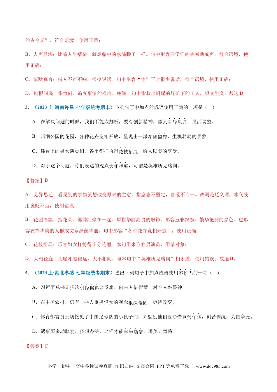 小学、初中、高中各种试卷真题知识归纳文案合同PPT等免费下载www.doc985.com专题03:词语的理解与运用一、选择题1.(2023上·湖南长沙·七年级统考期末)小文同学撰写的阅读心得中,加点的词语运用恰当的一项是()文学之海浩瀚无边,文学世界美不胜收。《白洋淀纪事》中,孙犁用富有诗情的笔调,赋予白洋淀英雄的气质和浪漫的色彩。《湘行散记》里,沈从文将美丽纯净的牧歌情感与包含着深切忧患的思索,编织成一曲深沉奇丽的凯歌。《朝花夕拾》中,鲁迅以简洁舒缓又不时夹杂犀利批判的文字,将怪诞不经的往事描述。《西游记》里,吴承恩以丰富的想象创造了一个个骇人听闻的降妖除魔故事。读名著,学名著,让经典名著滋润我们的心田,让经典阅读伴我们一路同行。A.美不胜收B.凯歌C.怪诞不经D.骇人听闻【答案】AA.美不胜收:形容美好的事物很多,一时看不过来。与语境相符,使用正确;B.凯歌:得胜时所唱的歌。与“美丽纯净的牧歌情感与包含着深切忧患的思索”语境不相符,使用错误;C.怪诞不经:意思是指言语奇怪荒唐,不合常理。不能用来形容往事,与语境不相符,使用错误;D.骇人听闻:使人听了某事后感到很惊讶、恐惧;多指社会上发生的坏事。不能用来修饰“降妖除魔故事”,与语境不相符,使用错误;故选A。2.(2023上·湖南常德·七年级统考期末)下列句子中加点词语运用不正确的一项是()A.语言的发展使得汉语里很多字、词的古今义大相径庭。B.操场上举行拔河比赛,同学们各自呐喊助威,人声鼎沸。C.他平时一向沉默寡言,想不到在辩论会上竟侃侃而谈,令人大吃一惊。D.这座坍塌的煤矿下还有五六个工人,我们一定要刨根问底,想尽一切办法把他们救出来。【答案】DA.大相径庭:比喻相差还很远,两者大不相同;相差很远甚至完全相反。句中形容“汉语里很多字、词小学、初中、高中各种试卷真题知识归纳文案合同PPT等免费下载www.doc985.com的古今义”,符合语境,使用正确;B.人声鼎沸:比喻人生嘈杂,就想鼎中的水沸腾了一样。句中形容同学们的呐喊助威声,符合语境,使用正确;C.沉默寡言:指人不声不响,很少说话。句中形容“他”平时很少说话,符合语境,使用正确;D.刨根问底:指盘问、追究事情的根由、底细。句中指救出坍塌的煤矿下的工人,望文生义;故选D。3.(2023上·河南许昌·七年级统考期末)下列句子中加点的成语使用正确的一项是()A.在解决问题的时候,我们不能太刻板,要有创新精神,做到见异思迁,灵活调整。B.西湖公园的花园,各种花卉竞相开放,呈现出一派花团锦簇、生机勃勃的景象。C.舞台上的男女演员们,各个都打扮得花枝招展,给人以美的享受。D.对于这个问题,你们表达的观点大相径庭,可谓是英雄所见略同。【答案】BA.见异思迁:看见别的事物就想改变原来的主意。指意志不坚定,喜爱不专一。改词是贬义词,本句使用褒贬不当,使用错误;B.花团锦簇:指花朵、锦绣汇聚在一起。原指华丽高贵的服饰。形容五彩缤纷、繁华艳丽的景色。也形容衣饰华美的人群或文章辞藻华丽。句中形容“各种花卉竞相开放”,使用正确;C.花枝招展:形容妇女打扮得十分艳丽。本句用来形容男演员,用错对象;D.大相径庭:比喻相差很远,大不相同。与本句中“英雄所见略同”相矛盾,使用错误;故选B。4.(2023上·湖北孝感·七年级统考期末)选出下列句子中加点成语使用不恰当的一项()A.习近平总书记多次引经据典谈反腐,向古人借智慧,对今人敲警钟。B.在中国农村,仍有一些人重男轻女的观念根深蒂固,亟待改变。C.体育部官员亲切接见了中国足球队的小伙子们,并勉励他们要珍惜豆蔻年华,刻苦训练,为国争光。D.遇事要多动脑筋,多想办法,这样才能事半功倍,避免走弯路。【答案】C小学、初中、高中各种试卷真题知识归纳文案合同PPT等免费下载www.doc985.comA.引经据典:引用经典书籍作为论证的依据。使用正确;B.根深蒂固:比喻基础稳固,不容易动摇。使用正确;C.豆蔻年华:少女十三四岁,代指少女的青春年华。不能形容小伙子们,使用对象有误;D.事半功倍:花一半力气,收到成倍效果;指做事得法,因此费力小,收效大。使用正确;故选C。5....