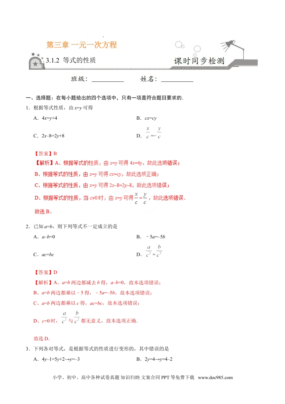 第三章一元一次方程3.1.2等式的性质一、选择题:在每小题给出的四个选项中,只有一项是符合题目要求的.1.根据等式性质,由x=y可得A.4x=y+4B.cx=cyC.2x–8=2y+8D.=−【答案】B2.已知a=b,则下列等式不一定成立的是A.a–b=0B.–5a=–5bC.ac=bcD.=【答案】D【解析】A、a=b两边都减去b得,a–b=0,故本选项错误;B、a=b两边都乘以–5得,–5a=–5b,故本选项错误;C、a=b两边都乘以c得,ac=bc,故本选项错误;D、c=0时,与都无意义,故本选项正确.故选D.3.下列各对等式,是根据等式的性质进行变形的,其中错误的是A.4y–1=5y+2→y=–3B.2y=4→y=4–2小学、初中、高中各种试卷真题知识归纳文案合同PPT等免费下载www.doc985.comC.0.5y=–2→y=2×(–2)D.1–y=y→3–y=3y【答案】B【解析】A、根据等式性质1,4y–1=5y+2两边都减去4y–2,即可得到y=–3,变形正确,故选项错误;B、根据等式性质2,两边都除以2,即可得到y=4÷2,变形错误,故选项正确;C、根据等式性质2,0.5y=–2两边都乘以2,即可得到y=2×(–2),变形正确,故选项错误;D、根据等式性质2,1–y=y两边都乘以3,即可得到3–y=3y,变形正确,故选项错误.故选B.4.如果x=m是方程x−m=1的根,那么m的值是A.0B.2C.–2D.–6【答案】C【解析】把x=m代入方程,得m–m=1,解得m=–2.故选C.5.把方程=1.2左边的分母化为整数后可得到A.=1.2B.=1.2C.=12D.=12【答案】B【解析】方程左边的分数分子分母同时乘以10得:=1.2.故选B.二、填空题:请将答案填在题中横线上.6.等式的两条性质是:(1)等式两边都__________(或__________)同一个__________或同一个__________,所得的结果仍是等式;(2)等式两边都__________(或__________)同一个__________(__________)所得的结果仍是等式.【答案】(1)加上,减去,数,字母;(2)乘以,除以不为0的数,或字母小学、初中、高中各种试卷真题知识归纳文案合同PPT等免费下载www.doc985.com7.如果a–3=b–3,那么a=__________,其根据是__________.【答案】b,等式性质1【解析】根据等式性质1,等式a–3=b–3的两边同时加3,结果仍相等.因此有(a–3)+3=(b–3)+3,化简得a=b.8.若方程2x+6=0与关于y的方程3y+2m=15的解互为相反数,则m=__________.【答案】3三、解答题:解答应写出文字说明、证明过程或演算步骤.9.根据等式的性质解方程:(1)3x+1=7;(2)x−1=5.【答案】(1)x=2;(2)x=9.【解析】(1)3x+1=7,3x+1–1=7–1,3x÷3=6÷3,x=2;(2)x−1=5,x–1+1=5+1,小学、初中、高中各种试卷真题知识归纳文案合同PPT等免费下载www.doc985.comx÷=6÷,x=9.10.检验x=5和x=–5是不是方程=x−2的解.【答案】x=5是原方程的解;x=–5不是原方程的解.【解析】把x=5分别代入方程的左边和右边,得左边==3,右边=5–2=3,∵左边=右边,∴x=5是原方程的解;把x=–5分别代入方程的左边和右边,得左边==–,右边=–5–2=–7,∵左边≠右边,∴x=–5不是原方程的解.11.小明解关于y的一元一次方程3(y+a)=2y+4,在去括号时,将a漏乘了3,得到方程的解是y=3,请你求出a的值及方程的正确的解.【答案】a的值是1,方程的正解是y=1.小学、初中、高中各种试卷真题知识归纳文案合同PPT等免费下载www.doc985.com
