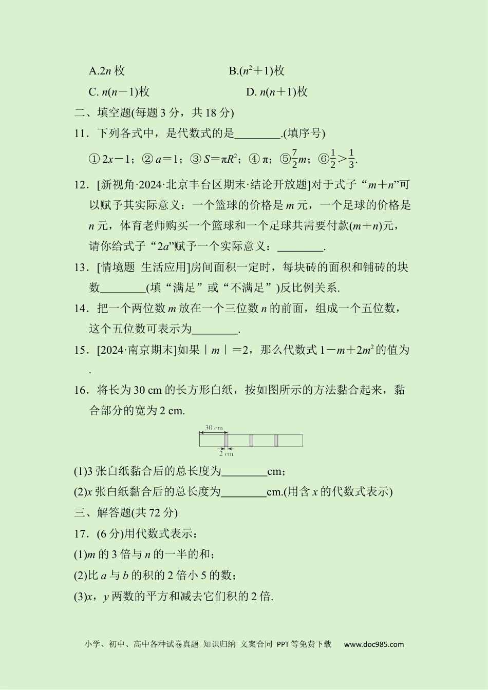 小学、初中、高中各种试卷真题知识归纳文案合同PPT等免费下载www.doc985.com第三章综合素质评价一、选择题(每题3分,共30分)1.下列代数式书写规范的是()A.b×12B.4÷(a+b)C.225xD.3n2.[母题教材P71例2]用语言叙述式子“a-12b”所表示的数量关系,下列说法正确的是()A.a与b的差的12B.a与b的一半的积C.a与b的12的差D.a比b大123.[2024·成都武侯区期末]某商店举办促销活动.促销的方法是将原价为x元/件的衣服以(45x-7)元/件出售,则下列关于代数式(45x-7)的含义的描述正确的是()A.原价打8折后再减去7元B.原价减去7元后再打8折C.原价减去7元后再打2折D.原价打2折后再减去7元4.当a=-1,b=3时,式子2a2+ab+b的值是()A.-5B.-2C.2D.65.[母题教材P75练习T2]下列各说法中的两个量之间的关系属于反比例关系的有()①当路程一定时,汽车行驶的平均速度与行驶时间之间的关系;②当商品的进价一定时,利润与售价之间的关系;③当长方形的面积一定时,长方形的长与宽之间的关系;④计划从A地到B地铺设一段2400米长的铁轨,每日铺设长度与铺设天数之间的关系.小学、初中、高中各种试卷真题知识归纳文案合同PPT等免费下载www.doc985.comA.1个B.2个C.3个D.4个6.某商品原来的价格为a元,前期在销售时连续两次降价10%.后期由于成本价格上涨,商店决定在两次降价的基础上提价20%,提价后商品的价格为()A.a元B.0.918a元C.0.972a元D.0.96a元7.[2023·雅安]若m2+2m-1=0,则2m2+4m-3的值是()A.-1B.-5C.5D.-38.学校礼堂的房间窗户装饰物如图所示,该装饰物由两个四分之一圆组成(半径相同),则窗户中能射进阳光的部分的面积为()A.ab-π16b2B.ab-π8b2C.ab-π4b2D.ab-π2b29.[新视角·2023·济宁改编·规律探究题]已知一列均不为1的数a1,a2,a3,…,an满足如下关系:a2=1+a11-a1,a3=1+a21-a2,a4=1+a31-a3,…,an+1=1+an1-an,若a1=2,则a2025的值是()A.-12B.13C.-3D.210.如图,下面图形是用棋子按照一定规律摆成的,按照这种摆法,第n个图形中共有棋子()小学、初中、高中各种试卷真题知识归纳文案合同PPT等免费下载www.doc985.comA.2n枚B.(n2+1)枚C.n(n-1)枚D.n(n+1)枚二、填空题(每题3分,共18分)11.下列各式中,是代数式的是.(填序号)①2x-1;②a=1;③S=πR2;④π;⑤72m;⑥12>13.12.[新视角·2024·北京丰台区期末·结论开放题]对于式子“m+n”可以赋予其实际意义:一个篮球的价格是m元,一个足球的价格是n元,体育老师购买一个篮球和一个足球共需要付款(m+n)元,请你给式子“2a”赋予一个实际意义:.13.[情境题生活应用]房间面积一定时,每块砖的面积和铺砖的块数(填“满足”或“不满足”)反比例关系.14.把一个两位数m放在一个三位数n的前面,组成一个五位数,这个五位数可表示为.15.[2024·南京期末]如果|m|=2,那么代数式1-m+2m2的值为.16.将长为30cm的长方形白纸,按如图所示的方法黏合起来,黏合部分的宽为2cm.(1)3张白纸黏合后的总长度为cm;(2)x张白纸黏合后的总长度为cm.(用含x的代数式表示)三、解答题(共72分)17.(6分)用代数式表示:(1)m的3倍与n的一半的和;(2)比a与b的积的2倍小5的数;(3)x,y两数的平方和减去它们积的2倍.小学、初中、高中各种试卷真题知识归纳文案合同PPT等免费下载www.doc985.com18.(8分)已知a,b互为相反数,c,d互为倒数,m的绝对值等于3,求a+bm2+cd-m的值.19.(10分)列式表示并求值.(1)超市购进一批上衣,标价为a元/件,后降价20%进行销售,小明购买了2件该上衣,一共花费了多少元?当a=120时,小明一共花费了多少元?(2)甲、乙两地相距bkm,一辆汽车以vkm/h的速度从甲地向乙地行驶,行驶th后,汽车与乙地之间的距离为多少千米?当b=200,v=80,t=1.5时,汽车与乙地之间的距离为多少千米?20.(10分)一个水池内原有水500升,现在以20升/分钟的速度向水池内注水,35分钟可注满水池.(1)水池的容积是多少升?(2)若水池为空的,用Q(单位:升/分钟)表示注水的速度,用T表示注满水池需要的时间,用式子表示T与Q的关系,T与Q成什么比例关系?21.(12分)[2024·扬州江都区期中]如图,在一块...