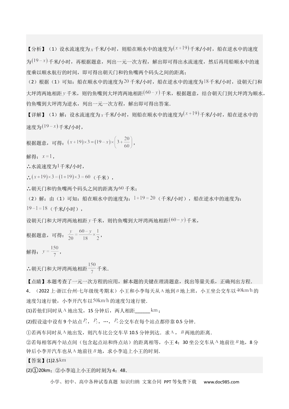 小学、初中、高中各种试卷真题知识归纳文案合同PPT等免费下载www.doc985.com猜想06一元一次方程的应用(13种常见题型专练)题型一:行程问题题型二:配套问题题型三:工程问题题型四:销售盈亏问题题型五:比赛积分问题题型六:方案选择问题题型七:数字问题题型八:几何问题题型九:和差倍分问题题型十:电费、水费问题题型十一:比例分配问题题型十二:日历问题题型十三:古代问题题型一:行程问题1.(2022上·河南信阳·七年级校考期末)一列匀速行驶的火车,从它进入一条320米长的隧道到完全通过隧道用18秒钟.隧道顶部一盏固定的灯光在火车照了10秒钟,求火车长度多少?设火车长x米,可列方程.【答案】【分析】设这列火车的长为x米,根据题意表示出火车的速度:米/秒,或者是米/秒,根据速度的相等关系列出方程,解方程即可.【详解】解:设这列火车的长为x米,根据题意得:,故答案为:.【点睛】此题主要考查了由实际问题抽象出一元一次方程,关键是弄懂题意,表示出火车的速度.2.(2022上·江苏盐城·九年级统考期中)铁人三项比赛程序是:先同时游泳1.5千米到第一站点,接着骑自行车40千米到第二站点,再跑步10千米到终点.女子组三名运动员在各项比赛和各个站点分别所用时间(单位:秒)汇总如下表:运动员号码游泳第一站点骑自行车第二站点跑步101200080500040320010215006057006036001031350705400503300(1)第101号、第102号、第103号运动员骑自行车的平均速度依次为是米/秒、米/秒、米/秒(精确到0.1);(2)如果运动员骑自行车都是匀速的,那么在骑自行车的途中,101号运动员会追上102号或103号吗?如果会,那么追上时离第一站点有多少米(精确到0.1)?如果不会,为什么?小学、初中、高中各种试卷真题知识归纳文案合同PPT等免费下载www.doc985.com(3)如果运动员长跑也都是匀速的,那么在长跑途中这三名运动员中有可能某人追上另一人吗?为什么?【答案】(1)8;7.0;7.4(2)见解析(3)见解析【分析】对于(1),根据速度=路程÷时间的关系求出答案即可;对于(2),先比较时间可确定101号能追上102号,再根据路程相等列出方程,求出解即可,然后比较101号和103号的时间得出答案;对于(3),比较第二站点所用时间和最后所有时间可得答案.【详解】(1)第101号运动员骑自行车的平均速度是米/秒;第102号运动员骑自行车的平均速度是米/秒,第103号运动员骑自行车的平均速度是米/秒.故答案为:8,7.0,7.4;(2)因为,101号能追上102号,设追上所用时间为t秒,根据题意,得,解得,(米),所以追上时距第一站点29120米.因为2000+80+5000>1350+70+5400,101号不会追上103号;(3)从第二站点出发时,101、102、103三位选手已用时间分别为7120、7320、6870.到达跑步终点时,101、102、103三位选手已用时间分别为10320、10920、10170.三人在跑步开始时与结束时次序一致,说明三人谁也追不上谁.【点睛】本题主要考查了一元一次方程的应用,弄清各段的时间,速度,路程的关系是解题的关键.3.(2023下·重庆沙坪坝·七年级重庆市凤鸣山中学校考阶段练习)一艘轮船航行在朝天门和钓鱼嘴两个码头之间,从朝天门到钓鱼嘴顺水航行用了3小时,逆水航行比顺水航行多用20分钟,已知轮船在静水中的速度是19千米/时.(1)求水流速度以及朝天门和钓鱼嘴两个码头之间的距离;(2)若在这两地之间建立新的码头大坪湾,使该轮船从朝天门到大坪湾的航行时间是和从钓鱼嘴到大坪湾所用的航行时间的一半,问朝天门和大坪湾两地相距多少千米?【答案】(1)水流速度为千米/小时,朝天门和钓鱼嘴两个码头之间的距离为千米(2)朝天门和大坪湾两地相距千米小学、初中、高中各种试卷真题知识归纳文案合同PPT等免费下载www.doc985.com【分析】(1)设水流速度为千米/小时,则船在顺水中的速度为千米/小时,船在逆水中的速度为千米/小时,再根据题意,列出一元一次方程,解出即可得出水流速度,然后再用船顺水中的速度乘以顺水航行的时间,即可得出朝天门和钓鱼嘴两个码头之间的距离;(2)根据(1)可知:船在顺水中的速度为千米/小时,船在逆水中的速度为千米/小时,设朝天门和大坪湾两地相距...