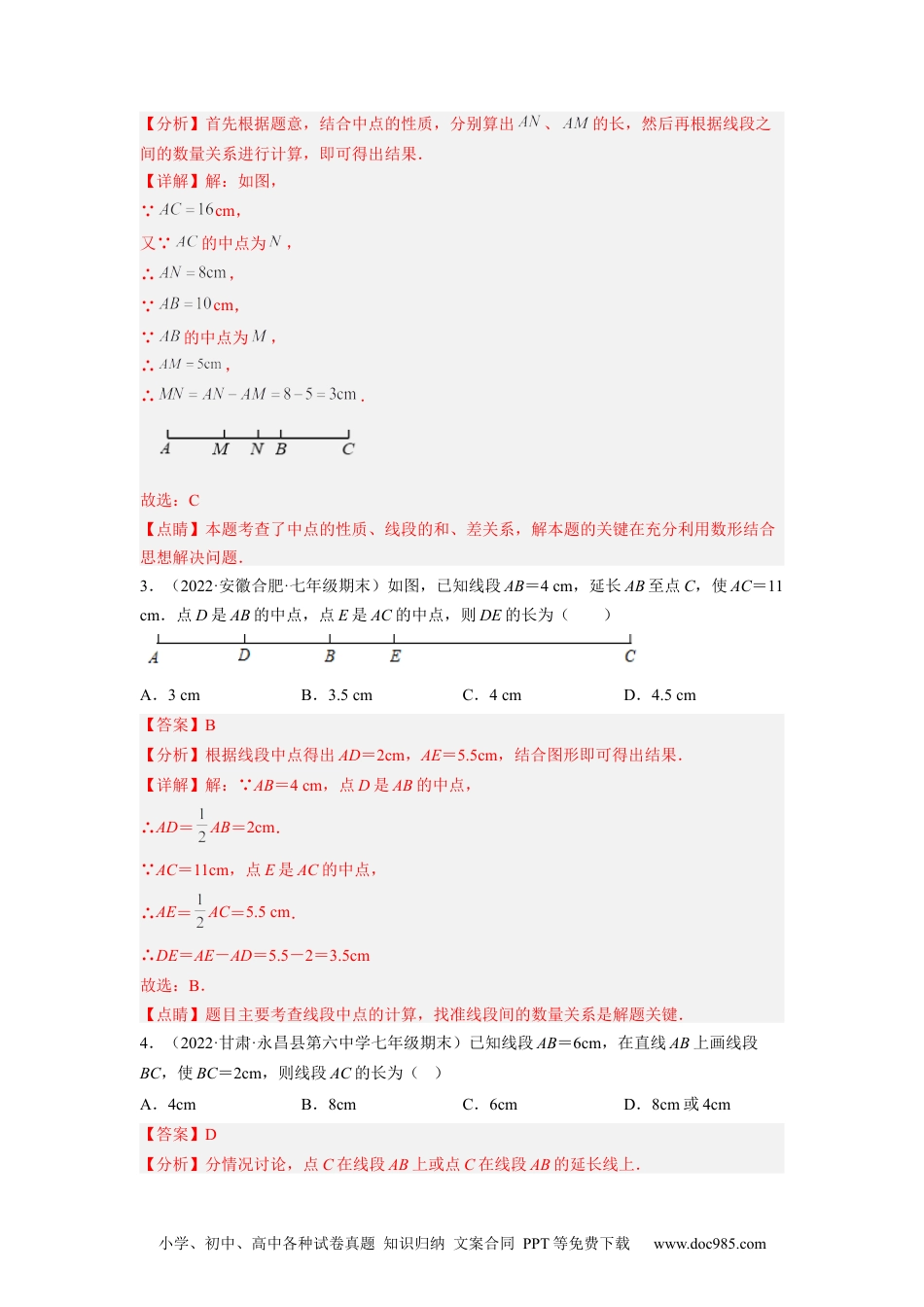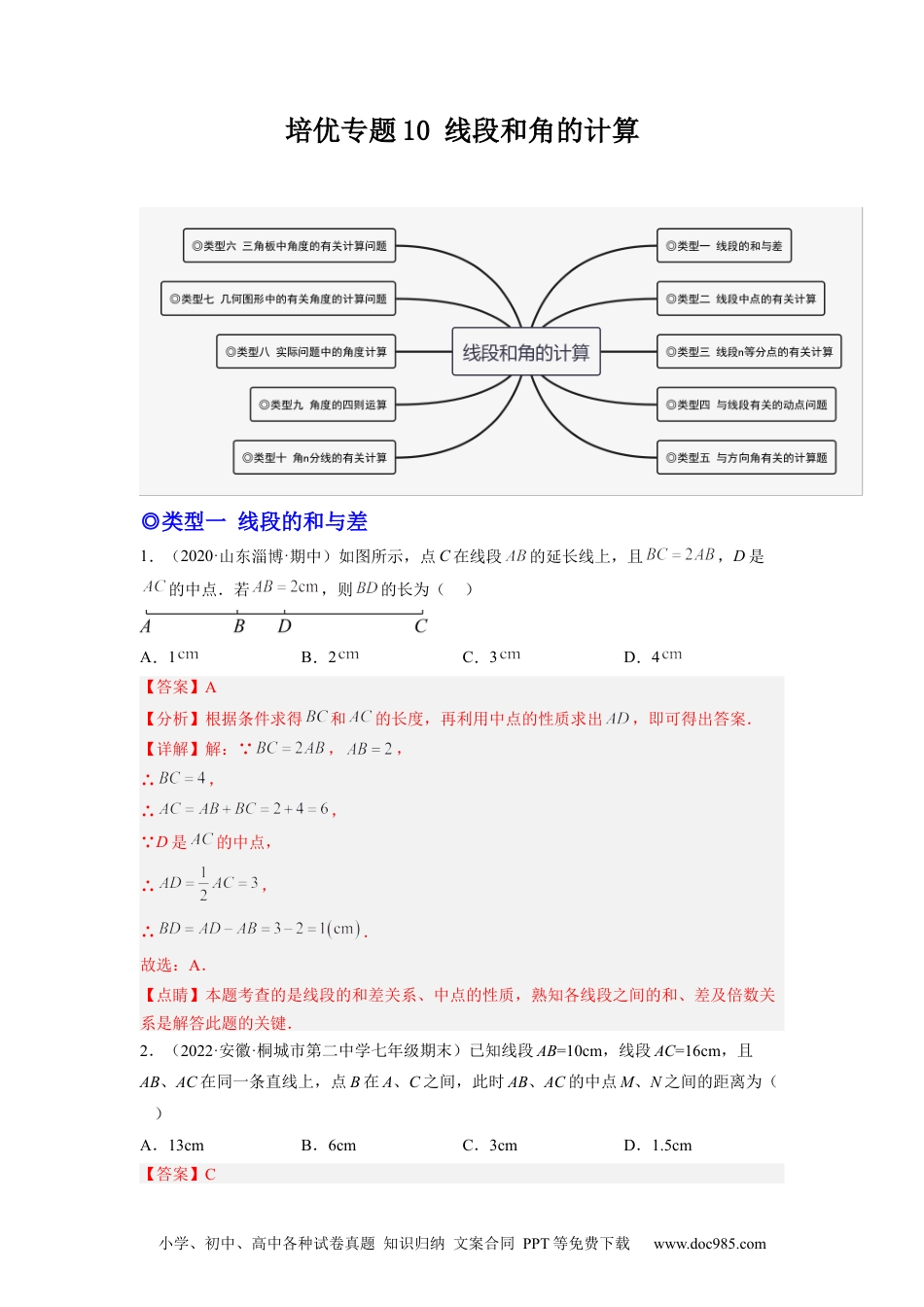 小学、初中、高中各种试卷真题知识归纳文案合同PPT等免费下载www.doc985.com培优专题10线段和角的计算◎类型一线段的和与差1.(2020·山东淄博·期中)如图所示,点C在线段的延长线上,且,D是的中点.若,则的长为()A.1B.2C.3D.4【答案】A【分析】根据条件求得和的长度,再利用中点的性质求出,即可得出答案.【详解】解: ,,∴,∴, D是的中点,∴,∴.故选:A.【点睛】本题考查的是线段的和差关系、中点的性质,熟知各线段之间的和、差及倍数关系是解答此题的关键.2.(2022·安徽·桐城市第二中学七年级期末)已知线段AB=10cm,线段AC=16cm,且AB、AC在同一条直线上,点B在A、C之间,此时AB、AC的中点M、N之间的距离为()A.13cmB.6cmC.3cmD.1.5cm【答案】C小学、初中、高中各种试卷真题知识归纳文案合同PPT等免费下载www.doc985.com【分析】首先根据题意,结合中点的性质,分别算出、的长,然后再根据线段之间的数量关系进行计算,即可得出结果.【详解】解:如图, cm,又 的中点为,∴, cm, 的中点为,∴,∴.故选:C【点睛】本题考查了中点的性质、线段的和、差关系,解本题的关键在充分利用数形结合思想解决问题.3.(2022·安徽合肥·七年级期末)如图,已知线段AB=4cm,延长AB至点C,使AC=11cm.点D是AB的中点,点E是AC的中点,则DE的长为()A.3cmB.3.5cmC.4cmD.4.5cm【答案】B【分析】根据线段中点得出AD=2cm,AE=5.5cm,结合图形即可得出结果.【详解】解: AB=4cm,点D是AB的中点,∴AD=AB=2cm. AC=11cm,点E是AC的中点,∴AE=AC=5.5cm.∴DE=AE-AD=5.5-2=3.5cm故选:B.【点睛】题目主要考查线段中点的计算,找准线段间的数量关系是解题关键.4.(2022·甘肃·永昌县第六中学七年级期末)已知线段AB=6cm,在直线AB上画线段BC,使BC=2cm,则线段AC的长为()A.4cmB.8cmC.6cmD.8cm或4cm【答案】D【分析】分情况讨论,点C在线段AB上或点C在线段AB的延长线上.小学、初中、高中各种试卷真题知识归纳文案合同PPT等免费下载www.doc985.com【详解】解:当点C在线段AB上, AB=6cm,BC=2cm,∴AC=AB-BC=6-2=4(cm);当点C在线段AB的延长线上, AB=6cm,BC=2cm,∴AC=AB+BC=6+2=8(cm);综上,线段AC的长为4cm或8cm.故选:D.【点睛】本题考查两点间的距离,注意根据题意,分情况讨论,要画出正确的图形,结合图形进行计算.◎类型二线段中点的有关计算5.(2022·全国·七年级专题练习)如图,D为BC的中点,则下列结论不正确的是()A.AC=AB+2BDB.AD=AB+CDC.BC=AB+BDD.BD=AC-AD【答案】C【分析】根据线段中点的性质,对各选项逐个进行判断即可;【详解】解:A BD=CD,∴BC=2BD,∴AC=AB+2BD,故正确;B BD=CD,∴AD=AB+BD=AB+CD,故正确;C BC=BD+CD,,∴,故错误;D BD=CD,CD=AC-AD,∴BD=AC-AD,故正确;综上,故选C;【点睛】本题考查了线段的组成,涉及了线段中点等知识,掌握并熟练使用相关知识,同时注意解题中需注意的事项是本题的解题关键.6.(2022·山东淄博·期末)在直线l上顺次取A,B,C三点,使得,.如果点O是线段的中点,那么线段的长度是()A.B.C.D.【答案】A【分析】根据题意求出AC,根据线段中点的性质求出OC,计算即可.【详解】解: AB=4cm,BC=3cm,∴AC=AB+BC=7cm, 点O是线段AC的中点,小学、初中、高中各种试卷真题知识归纳文案合同PPT等免费下载www.doc985.com∴OC=AC=3.5cm,∴OB=OC-BC=3.5-3=0.5(cm).故选:A.【点睛】本题考查了两点间的距离的计算,正确理解题意、掌握线段中点的性质是解题的关键.7.(2021·山西临汾·七年级阶段练习)已知线段,延长线段至点C,使得.若D是的中点,则线段的长为()A.B.C.D.【答案】C【分析】根据,可得,则AC=AB+BC=6+3=9cm,又根据D为AC中点,可得,即问题得解.【详解】 AB=6cm,,∴,∴AC=AB+BC=6+3=9cm, D为AC中点,∴,∴,故选:C.【点睛】本题主要考查了线段之间的数量关系的计算以及线段中点的有关计算,厘清各线段之间的数量关系是解答本题的关键.8.(2022·江苏·江阴市敔山湾实验学校...