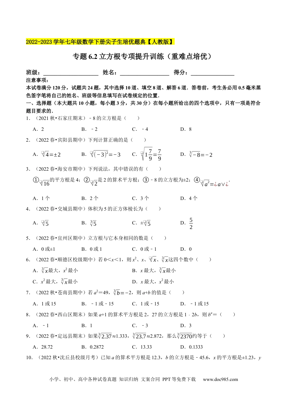 小学、初中、高中各种试卷真题知识归纳文案合同PPT等免费下载www.doc985.com2022-2023学年七年级数学下册尖子生培优题典【人教版】专题6.2立方根专项提升训练(重难点培优)班级:___________________姓名:_________________得分:_______________注意事项:本试卷满分120分,试题共24题,其中选择10道、填空8道、解答6道.答卷前,考生务必用0.5毫米黑色签字笔将自己的姓名、班级等信息填写在试卷规定的位置.一、选择题(本大题共10小题,每小题3分,共30分)在每小题所给出的四个选项中,只有一项是符合题目要求的.1.(2021秋•石家庄期末)﹣8的立方根是()A.2B.﹣2C.﹣4D.82.(2022春•宾阳县期中)下列计算正确的是()A.❑√4=±2B.❑√(−3)2=−3C.❑√179=79D.3√−8=−23.(2022春•海安市期中)下列说法,其中错误的有()①❑√16的平方根是4;②❑√2是2的算术平方根;③﹣8的立方根为±2;④❑√a2=¿a∨¿.A.1个B.2个C.3个D.4个4.(2022春•交城县期中)体积为5的正方体棱长为()A.❑√5B.3√5C.±❑√5D.525.(2022春•宜州区期中)立方根与它本身相同的数是()A.0或±1B.0或1C.0或﹣1D.06.(2022春•顺德区校级期中)若0<x<1,则x2、x、❑√x、3√x这四个数中()A.3√x最大,x2最小B.x最大,3√x最小C.x2最大,3√x最小D.x最大,x2最小7.(2022秋•苍南县期中)若a2=49,3√b=−2,则a+b的值是()A.1或15B.﹣1或﹣15C.1或﹣15D.﹣1或158.(2022春•西山区期末)如果a+1的算术平方根是2,27的立方根是12﹣b,则ba=()A.﹣1B.1C.﹣3D.39.(2022春•定远县期末)如果3√2.37≈1.333,3√23.7≈2.872,那么3√2370约等于()A.28.72B.0.2872C.13.33D.0.133310.(2022秋•沈丘县校级月考)已知a的算术平方根是12.3,b的立方根是﹣45.6,x的平方根是±1.23,y小学、初中、高中各种试卷真题知识归纳文案合同PPT等免费下载www.doc985.com的立方根是456,则x和y分别是()A.x=a100,y=1000bB.x=100a,y=−a1000C.x=a100,y=−a1000D.x=a100,y=﹣1000b二、填空题(本大题共8小题,每小题3分,共24分)请把答案直接填写在横线上11.(2022春•陕州区期中)如果❑√a=¿3,则3√a−17=¿.12.(2022春•同安区期中)已知a2=81,3√b=−2,则❑√b−a=¿.13.(2022春•长葛市期末)已知5x2﹣的立方根是﹣3,则x+69的算术平方根是.14.(2022春•武威期末)已知实数a的立方根是4,则❑√a的平方根是.15.(2022春•河北区校级期中)若5x+19的立方根是4,则2x+7的平方根是.16.(2022春•康巴什期末)有一个数值转换器,流程如下:当输入的x值为64时,输出的y值是.17.(2021春•安丘市月考)若一个正数的平方根是m+3和2m15﹣,n的立方根是﹣2,则﹣n+2m的算术平方根是.18.(2021春•浦东新区校级期末)已知一个长方体,它的长:宽:高=5:4:3,先在这个长方体上切去一个尽可能大的正方体,再从剩下的立体图形上再切去一个尽可能大的长方体(只允许沿着与原长方体的某个面平行的方向切).如果最后剩下的立体图形的体积为72cm3,那么原长方体的表面积是cm2.三、解答题(本大题共6小题,共66分.解答时应写出文字说明、证明过程或演算步骤)19.(2022秋•南岸区校级期中)解方程:(1)9x2729﹣=0;(2)64(x1﹣)3+8=0.20.(2022春•静海区校级期中)已知5x+2的立方根是3,3x+y1﹣的算术平方根是4.求:(1)x、y的值;(2)3x2﹣y2﹣的平方根.21.(2021秋•兴化市期末)观察求算术平方根的规律,并利用这个规律解决下列问题:❑√0.0001=¿0.01,❑√0.01=¿0.1,❑√1=¿1,❑√100=¿10,❑√10000=¿100,……小学、初中、高中各种试卷真题知识归纳文案合同PPT等免费下载www.doc985.com(1)已知❑√20≈4.47,求❑√2000的值;(2)已知❑√3.68≈1.918,❑√a≈191.8,求a的值;(3)根据上述探究方法,尝试解决问题:已知3√n≈1.26,3√m≈12.6,用含n的代数式表示m.22.(2022春•绥棱县期末)我们知道a+b=0时,a3+b3=0也成立,若将a看成a3的立方根,b看成b3的立方根,我们...