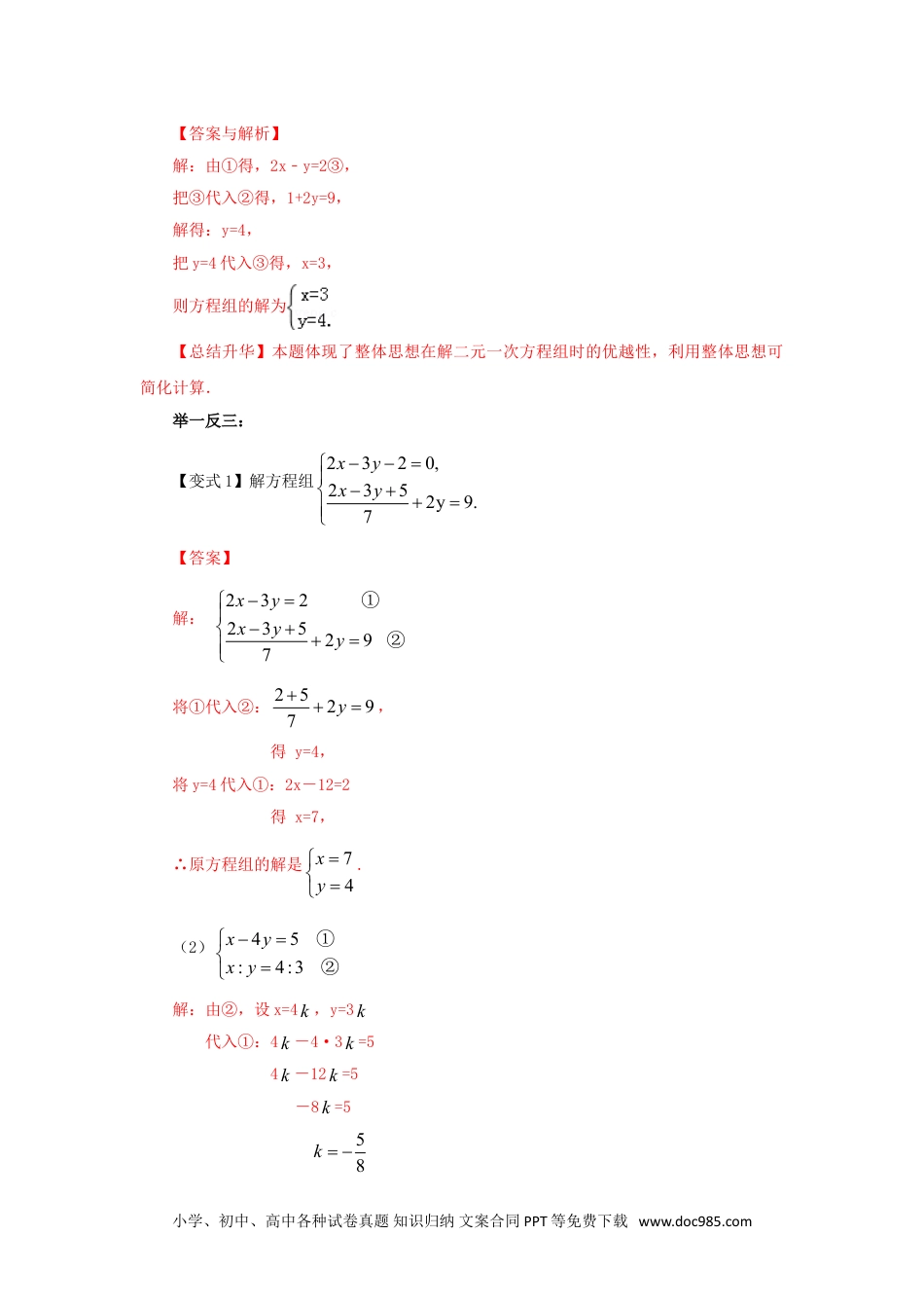 第八章二元一次方程(组)8.2二元一次方程(组)的解法Ⅰ——代入法(能力提升)【要点梳理】知识点一、消元法1.消元思想:二元一次方程组中有两个未知数,如果消去其中一个未知数,那么就把二元一次方程组转化为我们熟悉的一元一次方程,我们就可以先求出一个未知数,然后再求出另一个未知数.这种将未知数由多化少、逐一解决的思想,叫做消元思想.2.消元的基本思路:未知数由多变少.3.消元的基本方法:把二元一次方程组转化为一元一次方程.要点二、代入消元法通过“代入”消去一个未知数,将方程组转化为一元一次方程,这种解法叫做代入消元法,简称代入法.要点诠释:(1)代入消元法的关键是先把系数较简单的方程变形为:用含一个未知数的式子表示另一个未知数的形式,再代入另一个方程中达到消元的目的.(2)代入消元法的技巧是:①当方程组中含有一个未知数表示另一个未知数的代数式时,可以直接利用代入法求解;②若方程组中有未知数的系数为1(或-1)的方程.则选择系数为1(或-1)的方程进行变形比较简便;③若方程组中所有方程里的未知数的系数都不是1或-1,选系数绝对值较小的方程变形比较简便.【典型例题】类型一、用代入法解二元一次方程组例1.用代入法解方程组:237338xyxy①②【思路点拨】比较两个方程未知数的系数,发现①中x的系数较小,所以先把方程①中x用y表示出来,代入②,这样会使计算比较简便.【答案与解析】小学、初中、高中各种试卷真题知识归纳文案合同PPT等免费下载www.doc985.com解:由①得732yx③将③代入②733382yy,解得13y.将13y代入③,得x=3所以原方程组的解为313xy.【总结升华】代入法是解二元一次方程组的一种重要方法,也是同学们最先学习到的解二元一次方程组的方法,用代入法解二元一次方程组的步骤可概括为:一“变”、二“消”、三“解”、四“代”、五“写”.举一反三:【变式】m取什么数值时,方程组的解(1)是正数;(2)当m取什么整数时,方程组的解是正整数?并求它的所有正整数解.【答案】(1)m是大于-4的数时,原方程组的解为正数;(2)m=-3,-2,0,.例2.对于某些数学问题,灵活运用整体思想,可以化难为易.在解二元一次方程组时,就可以运用整体代入法:如解方程组:解:把②代入①得,x+2×1=3,解得x=1.把x=1代入②得,y=0.所以方程组的解为请用同样的方法解方程组:.【思路点拨】仿照已知整体代入法求出方程组的解即可.小学、初中、高中各种试卷真题知识归纳文案合同PPT等免费下载www.doc985.com【答案与解析】解:由①得,2x﹣y=2③,把③代入②得,1+2y=9,解得:y=4,把y=4代入③得,x=3,则方程组的解为【总结升华】本题体现了整体思想在解二元一次方程组时的优越性,利用整体思想可简化计算.举一反三:【变式1】解方程组2320,2352y9.7xyxy【答案】解:232235297xyxyy①②将①代入②:25297y,得y=4,将y=4代入①:2x-12=2得x=7,∴原方程组的解是74xy.(2)45:4:3xyxy①②解:由②,设x=4k,y=3k代入①:4k-4·3k=54k-12k=5-8k=558k小学、初中、高中各种试卷真题知识归纳文案合同PPT等免费下载www.doc985.com∴542xk,1538yk,∴原方程组的解为52158xy.类型二、方程组解的应用例3.如果方程组的解是方程3x+my=8的一个解,则m=()A.1B.2C.3D.4【思路点拨】求出方程组的解得到x与y的值,代入已知方程即可求出m的值.【答案】B.【解析】解:,由①得y=3-x③将③代入②得:6x=12,解得:x=2,将x=2代入②得:10﹣y=9,解得:y=1,将x=2,y=1代入3x+my=8中得:6+m=8,解得:m=2.【总结升华】此题考查了二元一次方程组的解,方程组的解即为能使方程组中两方程成立的未知数的值.例4.已知2564xyaxby①②和方程组35168xybxay③④的解相同,求2011(2)ab的值.【思路点拨】两个方程组有相同的解,这个解是2x+5y=-6和3x-5y=16的解.由于这两个方程的系数都已知,故可联立在一起,求出x、y的值.再将x、...
