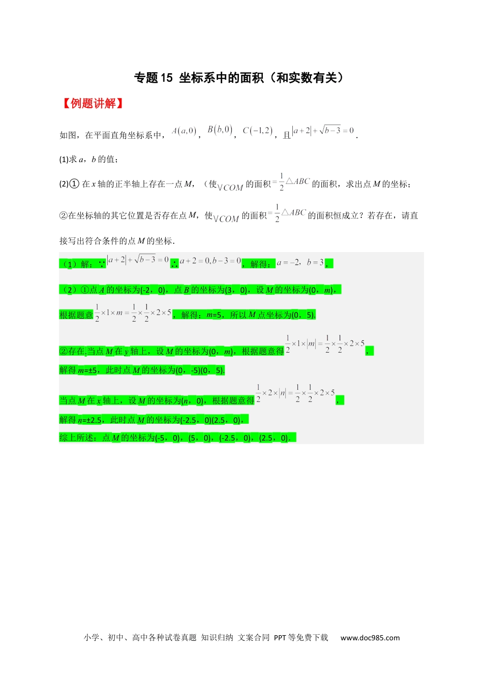 小学、初中、高中各种试卷真题知识归纳文案合同PPT等免费下载www.doc985.com专题15坐标系中的面积(和实数有关)【例题讲解】如图,在平面直角坐标系中,,,,且.(1)求a,b的值;(2)①在x轴的正半轴上存在一点M,(使的面积的面积,求出点M的坐标;②在坐标轴的其它位置是否存在点M,使的面积的面积恒成立?若存在,请直接写出符合条件的点M的坐标.(1)解: ∴,解得:,(2)①点A的坐标为(-2,0),点B的坐标为(3,0),设M的坐标为(0,m),根据题意,解得:m=5,所以M点坐标为(0,5).②存在.当点M在y轴上,设M的坐标为(0,m),根据题意得,解得m=±5,此时点M的坐标为(0,-5)(0,5).当点M在x轴上,设M的坐标为(n,0),根据题意得,解得n=±2.5,此时点M的坐标为(-2.5,0)(2.5,0),综上所述:点M的坐标为(-5,0),(5,0),(-2.5,0),(2.5,0).小学、初中、高中各种试卷真题知识归纳文案合同PPT等免费下载www.doc985.com【综合解答】1.在平面直角坐标系中,A(a,0),B(0,b),且a、b满足.(1)求OA,OB长度;(2)在x轴上是否存在点C,使得三角形ABC的面积是12;若存在,求出点C的坐标;若不存在,请说明理由;(3)若点P从点B出发沿着y轴运动(点P不与原点、B点重合)速度为每秒2个单位长度,连接AB、AP,当运动的时间t为几秒时,?并求出此时点P的坐标.2.如图1,已知,点A(1,a),AH⊥x轴,垂足为H,将线段AO平移至线段BC,点B(b,0),其中点A与点B对应、点O与点C对应,a、b满足.(1)填空:①直接写出A、B、C三点的坐标A()、B()、C();小学、初中、高中各种试卷真题知识归纳文案合同PPT等免费下载www.doc985.com②直接写出三角形AOH的面积.(2)如图2,连OC,动点P从点B开始在x轴上以每秒2个单位的速度向左运动,同时点Q从点O开始在y轴上以每秒1个单位的速度向下运动.若经过t秒,三角形AOP与三角形COQ的面积相等,试求t的值及点P的坐标.3.已知,点,轴,垂足为,将线段平移至线段,点,其中点A与点对应,点与点对应,、满足.(1)填空:①直接写出A、、三点的坐标______、______、______;②直接写出三角形的面积______.(2)如图,若点在线段上,证明:.(3)如图,连,动点从点开始在轴上以每秒个单位的速度向左运动,同时点从点开始在轴上以每秒个单位的速度向下运动.若经过秒,三角形与三角形的面积相等,试求的值及点的坐标.4.如图,在平面直角坐标系中,已知,,其中,满足小学、初中、高中各种试卷真题知识归纳文案合同PPT等免费下载www.doc985.com(1)填空:,;(2)如果在第三象限内有一点,请用含的式子表示三角形的面积(3)在(2)的条件下,当时,在轴上有一点,使得三角形的面积与三角形的面积相等,请求出点的坐标.5.如图,C为x轴正半轴上一动点,,,且a,b满足,.(1)求△ABO的面积;(2)求点O到AB的距离;(3)如图2,若,轴于点C,点M从点P出发,在射线PA上运动,同时另一动点N从点B出发向点A运动,到点A时两点停止运动,M,N的速度分别为2个单位长度/秒,3个单位长度/秒,当时,求运动的时间t的值.6.如图1,已知点A(0,a),点B(b,0),其中a,b满足,点C(m,n)在第一象限,已知m的算术平方根是2,64的立方根为n.小学、初中、高中各种试卷真题知识归纳文案合同PPT等免费下载www.doc985.com(1)直接写出A,B,C三点的坐标;(2)求出△ABC的面积;(3)如图2,延长BC交y轴于D点,求点D的坐标;(4)如图3,过点C作CEAB交y轴于E点,求E点的坐标.7.如图,在下面直角坐标系中,已知A(0,a)、B(b,0)、C(a,b)三点,其中a是的整数部分,b+1的平方根是±2.(1)请求出a、b的值;(2)求出ABC的面积;(3)在第四象限中是否存在点P到两坐标轴的距离相等且使四边形AOPB的面积与ABC的面积相等?若存在,请求出点P的坐标,若不存在,请说明理由.小学、初中、高中各种试卷真题知识归纳文案合同PPT等免费下载www.doc985.com8.如图,在平面直角坐标系xOy中,点A(a,0),B(c,c),C(0,c),且满足(a+8)2+=0,P点从A点出发沿x轴正方向以每秒2个单位长度的速度匀速移动,Q点从O点出发沿y轴负方向以每秒1个单位长度的速度匀速移...