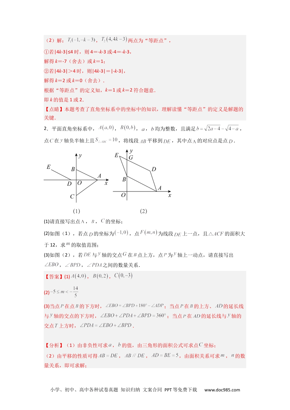 小学、初中、高中各种试卷真题知识归纳文案合同PPT等免费下载www.doc985.com七下期末难点特训(三)和平面直角坐标系有关的压轴题1.在平面直角坐标系xOy中,对于P,Q两点给出如下定义:若点P到x、y轴的距离中的最大值等于点Q到x、y轴的距离中的最大值,则称P,Q两点为“等距点”.下图中的P,Q两点即为“等距点”.(1)已知点A的坐标为(﹣3,1),①在点E(0,3),F(3,﹣3),G(2,﹣5)中,为点A的“等距点”的是;②若点B的坐标为B(m,m+6),且A,B两点为“等距点”,则点B的坐标为;A.(3,9)B.(﹣9,﹣3)C.(﹣3,3)D.不能确定(2)若(﹣1,﹣k3﹣),(4,4k3﹣)两点为“等距点”,求k的值.【答案】(1)①E,F;②C(2)1或2【分析】(1)①找到x、y轴距离最大为3的点即可;②先分析出直线上的点到x、y轴距离中有3的点,再根据“等距点”概念进行解答即可;(2)先分析出直线上的点到x、y轴距离中有4的点,再根据“等距点”概念进行解答即可.【详解】(1)解:① 点A(-3,1)到x、y轴的距离中最大值为3,又 点E(0,3)和点F(3,-3)到x、y轴的距离中最大值为3,∴与A点是“等距点”的点是E、F;② 点B的坐标为(m,m+6),且有m<m+6,又 点A与点B为“等距点”,点A(-3,1)到x、y轴的距离中最大值为3,∴m+6=3,解得m=-3,即B点的坐标为(-3,3),故选:C.故答案为:①E、F;②C;小学、初中、高中各种试卷真题知识归纳文案合同PPT等免费下载www.doc985.com(2)解:,两点为“等距点”,①若|4k-3|≤4时,则4=-k-3或-4=-k-3,解得k=-7(舍去)或k=1;②若|4k-3|>4时,则|4k-3|=|-k-3|,解得k=2或k=0(舍去).根据“等距点”的定义知,k=1或k=2符合题意.即k的值是1或2.【点睛】本题考查了直角坐标系中的坐标中的知识,理解读懂“等距点”的定义是解题的关键.2.平面直角坐标系中,,,,均为整数,且满足,点在轴负半轴上且,将线段平移到,其中点的对应点是点.(1)请直接写出点,,的坐标;(2)如图(1),若点的坐标为,点为线段上一点,且的面积大于12,求的取值范围;(3)如图(2),若与轴的交点在点上方,点为轴上一动点,请直接写出,,之间的数量关系.【答案】(1),,(2)(3)当点在点的下方时,;当点在的上方、的延长线与轴的交点的下方时,;当点在的延长线与轴的交点上方时,.【分析】(1)由非负性可求,的值,由三角形的面积公式可求点坐标;(2)由平移的性质可得,,,由面积关系可求,的数量关系,即可求解;小学、初中、高中各种试卷真题知识归纳文案合同PPT等免费下载www.doc985.com(3)分三种情况讨论,由平移的性质,平行线的性质以及角的数量关系可求解.【详解】(1)解:,,,,,均为整数,,,,,,,,,,点在轴负半轴上,点坐标为;(2)解:如图,连接,,,将线段平移到,,,,四边形的面积,,,,,,,小学、初中、高中各种试卷真题知识归纳文案合同PPT等免费下载www.doc985.com; 为线段上一点,∴∴(3)解:如图,当点在点的下方时,延长交于,将线段平移到,,,,,,,;如图,当点在的上方、的延长线与轴的交点下方时,延长交于点,将线段平移到,,,,,,;如图,当点在的延长线与轴的交点上方时,小学、初中、高中各种试卷真题知识归纳文案合同PPT等免费下载www.doc985.com,又,,由对顶角得,,,,综上所述:当点在点的下方时,;当点在、与的延长线与轴的交点之间时,;当点在的延长线与轴的交点上方时,.【点睛】本题是三角形综合题,考查了平移的性质,三角形面积公式,利用分类讨论思想解决问题是解题的关键.3.如图所示,在平面直角坐标系中,如图①,将线段平移至线段,点在轴的负半轴,点在轴的正半轴上,连接、.(1)若、,,直接写出点的坐标;(2)如图②,在平面直角坐标系中,已知一定点,两个动点、.请你探索是否存在以两个动点、为端点的线段平行于线段且等于线段,若存在,求点、的坐标;若不存在,请说明理由;(3)如图③,在直线上有两点、,分别引两条射线、.,,射线、分别绕点,点以1度秒和3度秒的速度同时顺时针转小学、初中、高中各种试卷真题知识归纳文案合同PPT等免费下载w...