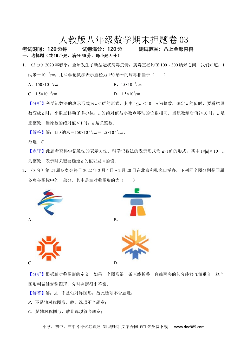 小学、初中、高中各种试卷真题知识归纳文案合同PPT等免费下载www.doc985.com人教版八年级数学期末押题卷03考试时间:120分钟试卷满分:120分测试范围:八上全部内容一.选择题(共10小题,满分30分,每小题3分)1.(3分)2020年春季,全球发生了新型冠状病毒疫情,病毒直径约在100300﹣纳米之间,我们知道,1纳米=107﹣cm,用科学记数法表示直径为150纳米的病毒相当于()A.150×107﹣cmB.15×106﹣cmC.1.5×105﹣cmD.1.5×107cm【分析】科学记数法的表示形式为a×10n的形式,其中1≤|a|<10,n为整数.确定n的值时,要看把原数变成a时,小数点移动了多少位,n的绝对值与小数点移动的位数相同.当原数绝对值≥10时,n是正整数;当原数的绝对值<1时,n是负整数.【解答】解:150纳米=150×107﹣cm=1.5×105﹣cm,故选:C.【点评】此题考查科学记数法的表示方法.科学记数法的表示形式为a×10n的形式,其中1≤|a|<10,n为整数,表示时关键要确定a的值以及n的值.2.(3分)第24届冬奥会将于2022年2月4日﹣2月20日在北京和张家口举办.下列四个图分别是四届冬奥会图标中的一部分,其中是轴对称图形的为()A.B.C.D.【分析】根据轴对称图形的定义,如果一个图形沿一条直线折叠,直线两旁的部分能够互相重合,这个图形叫做轴对称图形,分别判断得出答案.【解答】解:A.不是轴对称图形,故此选项不合题意;B.不是轴对称图形,故此选项不合题意;C.是轴对称图形,故此选项符合题意;小学、初中、高中各种试卷真题知识归纳文案合同PPT等免费下载www.doc985.comD.不是轴对称图形,故此选项不合题意;故选:C.【点评】本题考查了轴对称图形,轴对称图形的关键是寻找对称轴,图形两部分折叠后可重合.3.(3分)在下列长度的四根木棒中,能与3cm,8cm长的两根木棒钉成一个三角形的是()A.3cmB.5cmC.7cmD.12cm【分析】首先设第三根木棒长为xcm,根据三角形的三边关系定理可得83﹣<x<8+3,计算出x的取值范围,然后可确定答案.【解答】解:设第三根木棒长为xcm,由题意得:83﹣<x<8+3,∴5<x<11,∴C选项7cm符合题意,故选:C.【点评】本题考查了能够组成三角形三边的条件:用两条较短的线段相加,如果大于最长的那条线段就能够组成三角形.4.(3分)如图所示,盖房子时,在窗框未安装好之前,木工师傅常常先在窗框上斜钉一根木条,使其窗框不变形,这样做的数学依据是()A.两点确定一条直线B.两点之间线段最短C.三角形的稳定性D.垂线段最短【分析】用木条固定矩形门框,即是组成三角形,故可用三角形的稳定性解释.【解答】解:加上木条后,原不稳定的四边形中具有了稳定的三角形,故这种做法根据的是三角形的稳定性.故选:C.【点评】本题考查三角形稳定性的实际应用.三角形的稳定性在实际生活中有着广泛的应用,如钢架桥、房屋架梁等,因此要使一些图形具有稳定的结构,往往通过连接辅助线转化为三角形而获得.5.(3分)下列各式中最简分式是()A.B.小学、初中、高中各种试卷真题知识归纳文案合同PPT等免费下载www.doc985.comC.D.【分析】一个分式的分子与分母没有公因式时,叫最简分式,据此求解可得.【解答】解:A、,不是最简分式;B、是最简分式;C、,不是最简分式;D、,不是最简分式;故选:B.【点评】本题主要考查最简分式,解题的关键是掌握一个分式的分子与分母没有公因式时,叫最简分式.6.(3分)下列计算正确的是()A.x2+x3=x5B.2x3﹣x3=1C.x3•x4=x7D.(﹣2xy2)3=﹣6x3y6【分析】分别根据合并同类项法则,同底数幂的乘法法则、积的乘方与幂的乘方运算法则逐一判断即可.【解答】解:A.x2+x3,不是同类项,不能合并,故本选项不合题意;B.2x3﹣x3=x3,故本选项不合题意;C.x3•x4=x7,故本选项符合题意;D.(﹣2xy2)3=﹣8x3y6,故本选项不合题意;故选:C.【点评】本题考查了合并同类项法则,同底数幂的乘法法则、积的乘方与幂的乘方运算,掌握幂的运算法则是解答本题的关键.7.(3分)若a=0.32,b=﹣32,c=(﹣3)0,那么a、b、c三数的大小为()A.a>c>bB.c>a>bC.a>b>cD.c>b>a【分析】先...